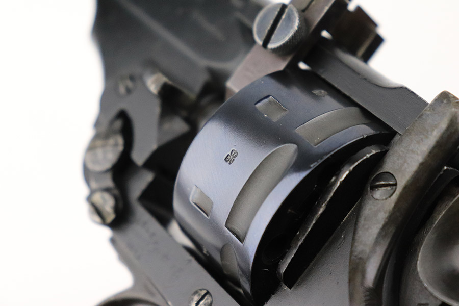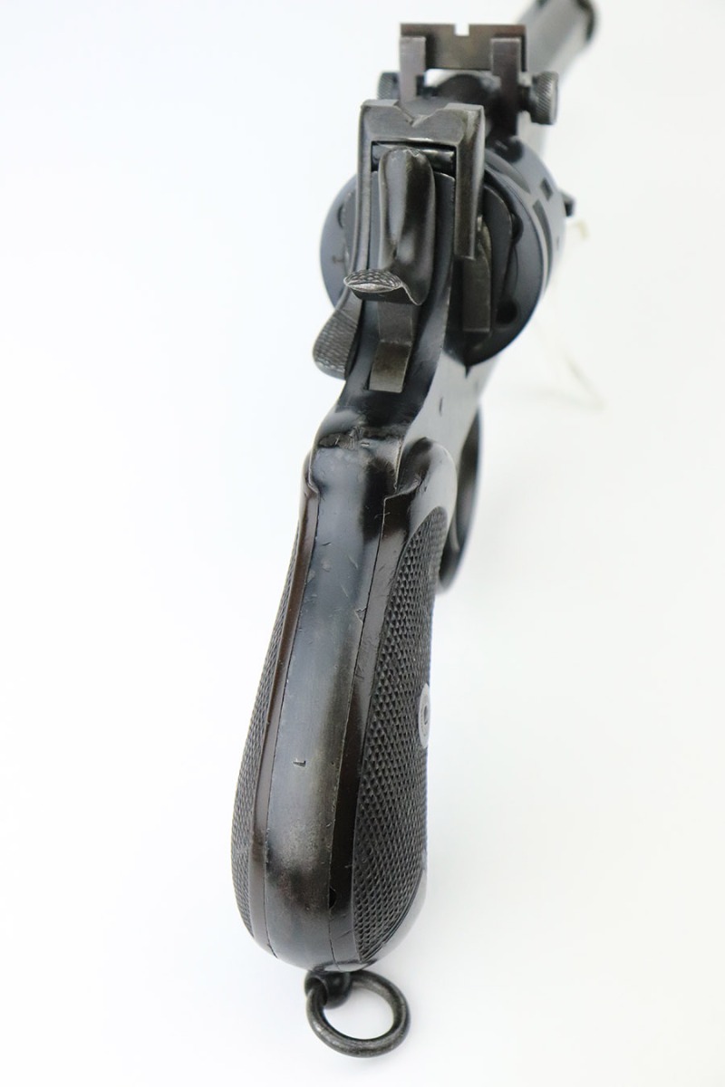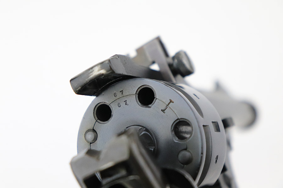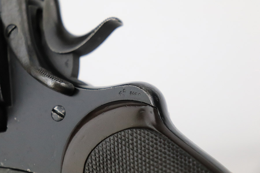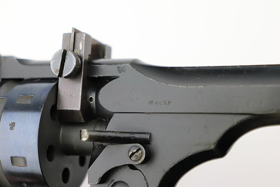 11/30/22 – This is a nice example of a scarce 1914 Webley Mark I revolver that was originally issued to the British military during WW1 but was later converted to fire .22 caliber. The cylinder was replaced, a barrel sleeve was installed, and an additional rear sight was added. The left side of the rear sight assembly is marked “AGA Bisley Works”. The gun has retained about 92% of its black enamel finish. The majority of the finish loss is on the underside of the barrel around the muzzle. There is minor wear around the high edges in general, minor thinning on the back strap, and some small chips in the finish here and there. The cylinder appears to be blued and buffed. Comes with nice brown bakelite grips. Mint bore.