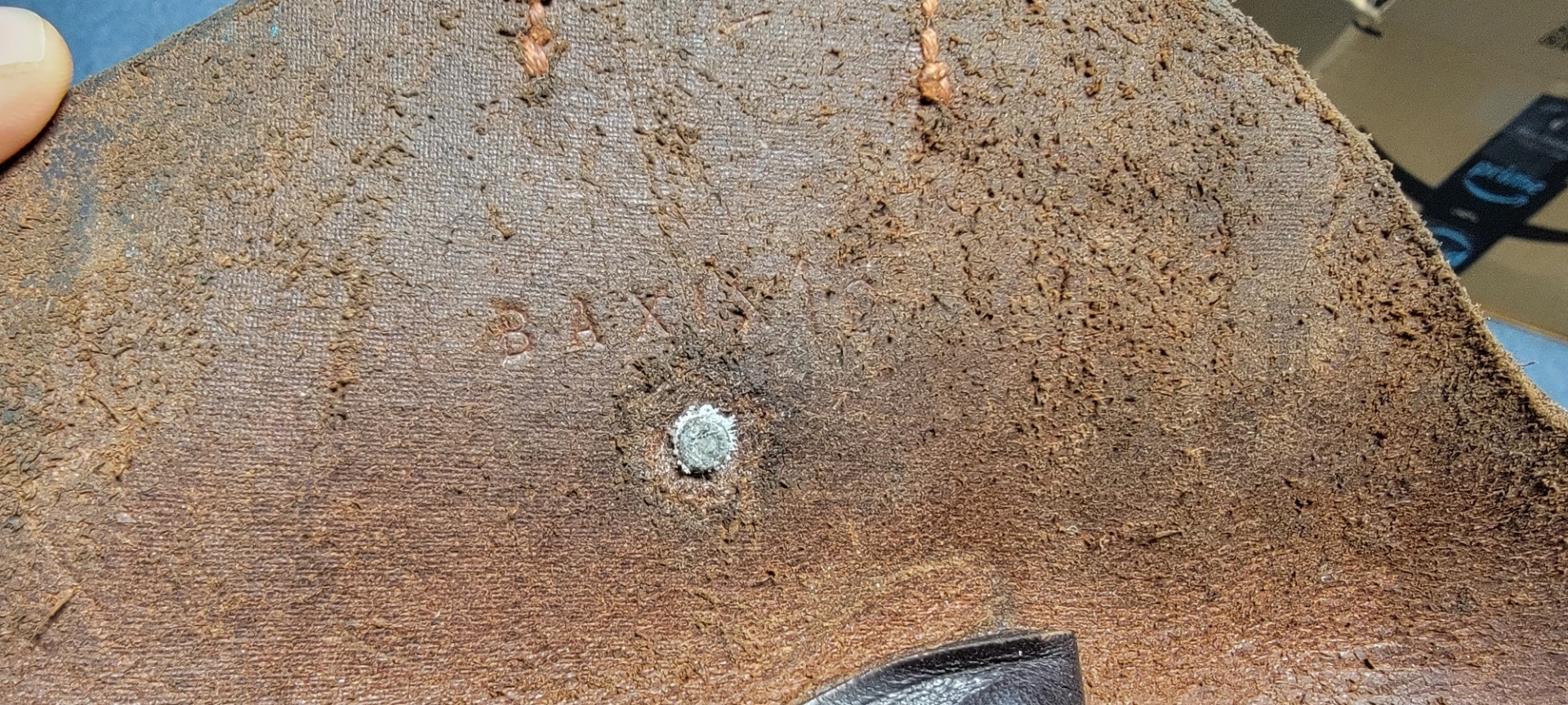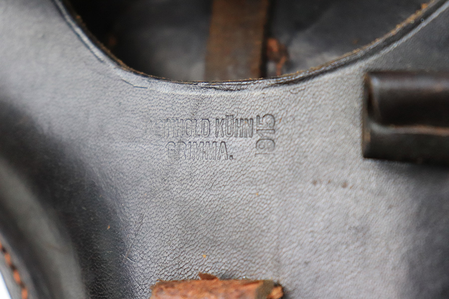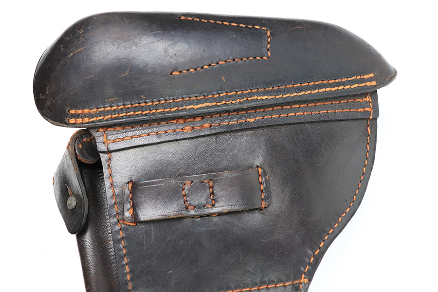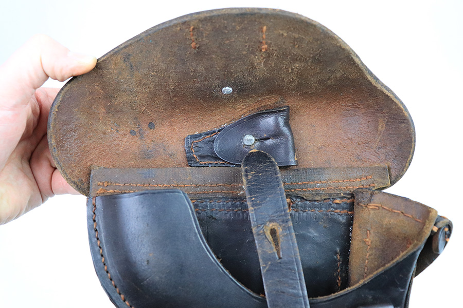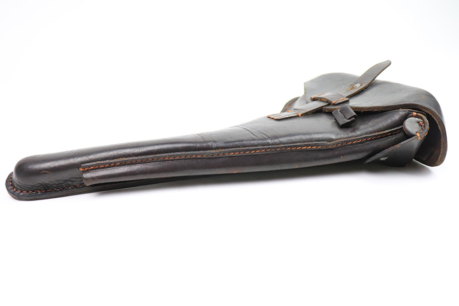 11/30/22 – This is an original 1915 dated Artillery Luger holster from WW1. The holster is maker stamped and dated on the front leather, underneath the closure strap. The holster has very nice chocolate brown leather that’s in great condition (excellent considering its age). The leather is soft and pliable with surface wrinkling near the toe and front leather. The back leather is excellent and clean. The stitching is also excellent and tight throughout with an attractive orange coloring. Fairly clean interior leather as well that has some Roman numerals stamped inside the lid.