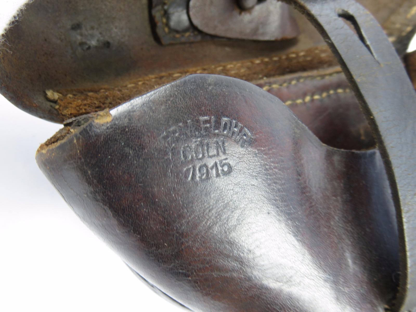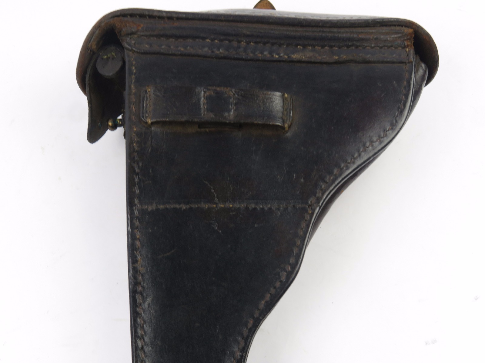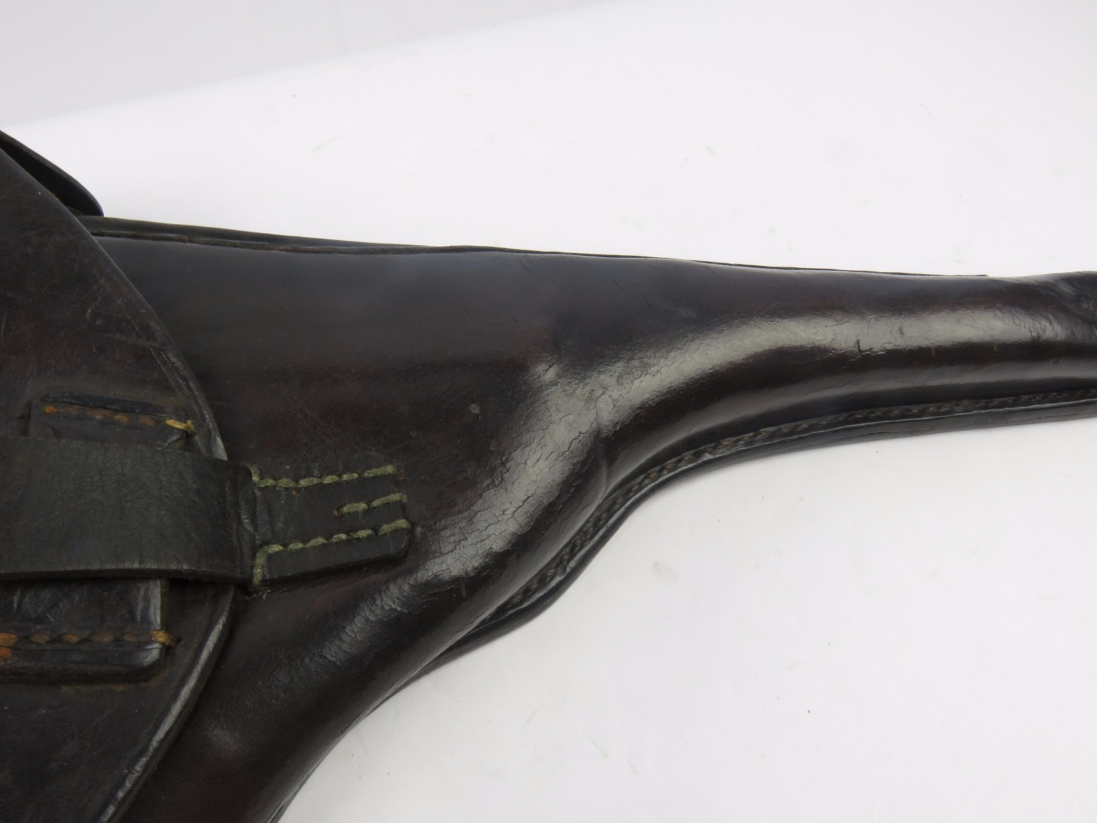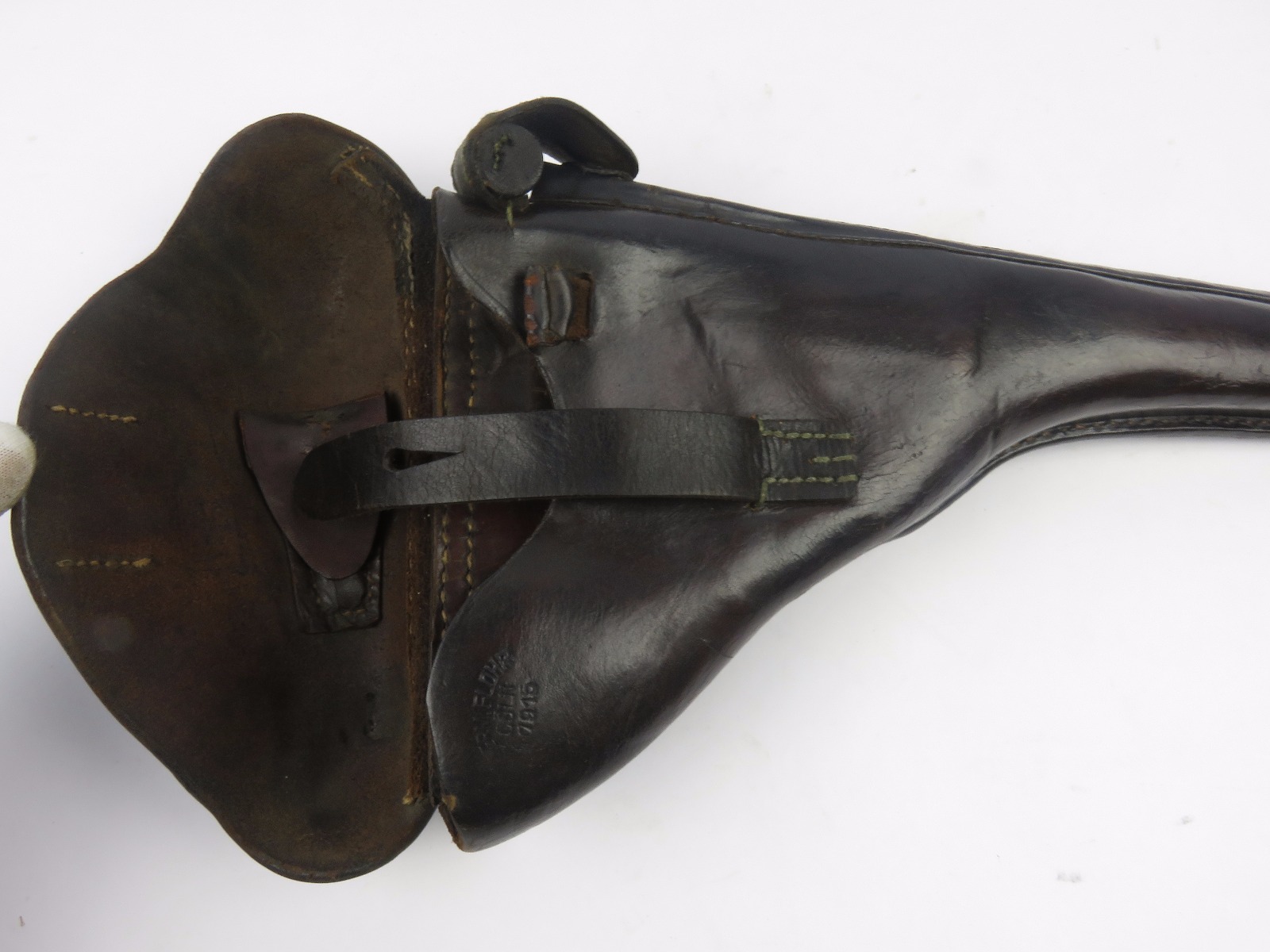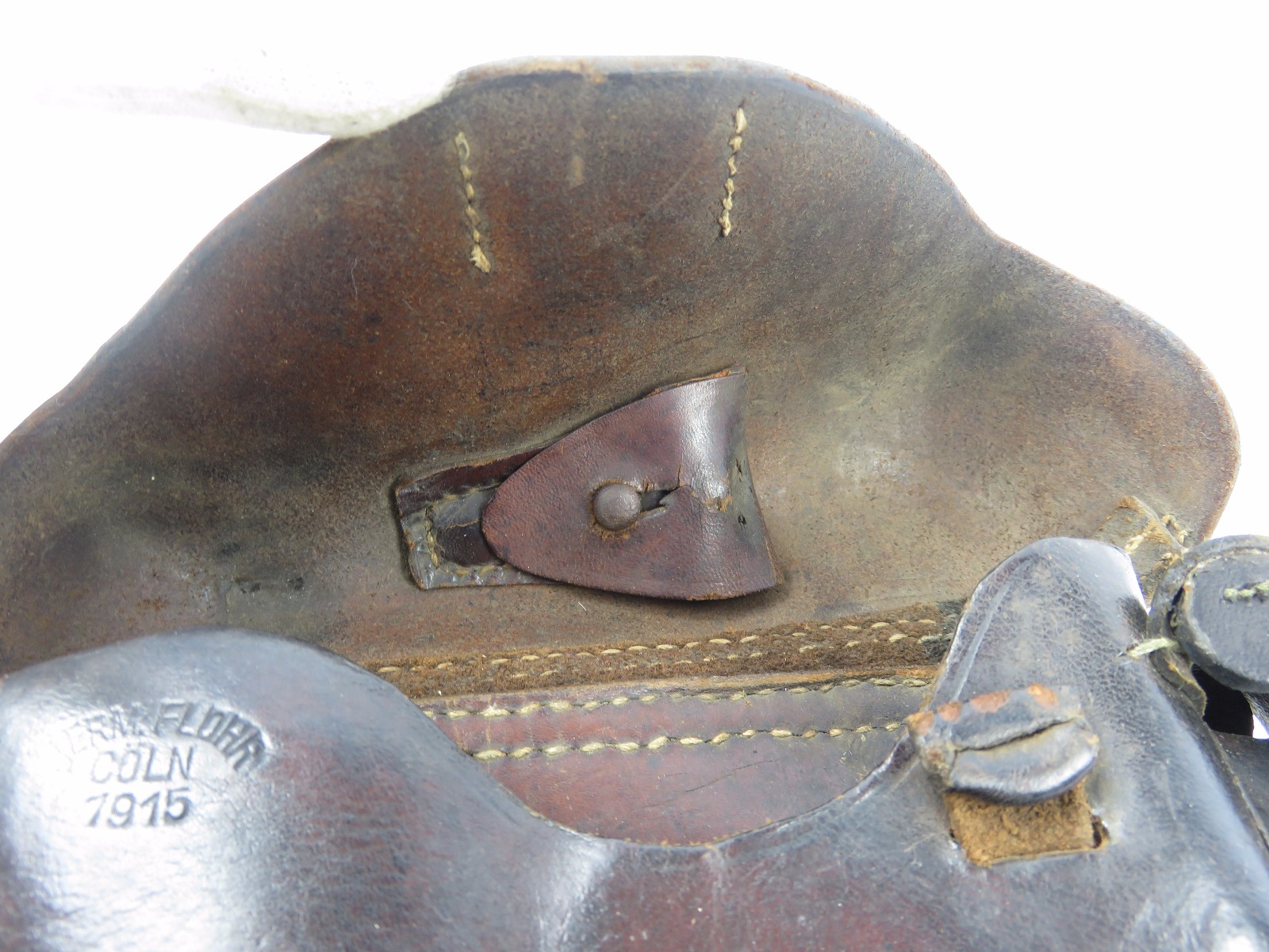 10/31/17 – This is a 1915 dated Artillery Luger holster from WW1. The holster is maker stamped and dated under the top flap on the main body of leather. The stamp is fairly crisp and clear especially given the items age. The leather is in great condition as well with only some light surface cracking and normal use wear. The front toe of the holster has the most surface cracking, and none of this goes very deep. The top flap has similar surface cracking, but again nowhere near going all the way through the leather. The back leather is clean and excellent. Great stitching is all original with no issues as well. The cleaning rod holding is completely in tact as well, with both ears original and in tact as well. Guaranteed all original and authentic.
