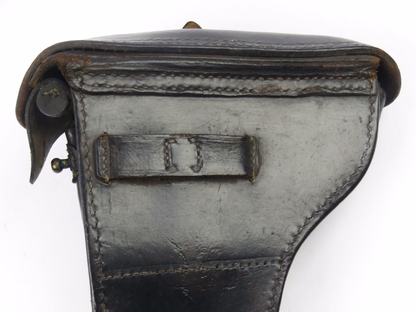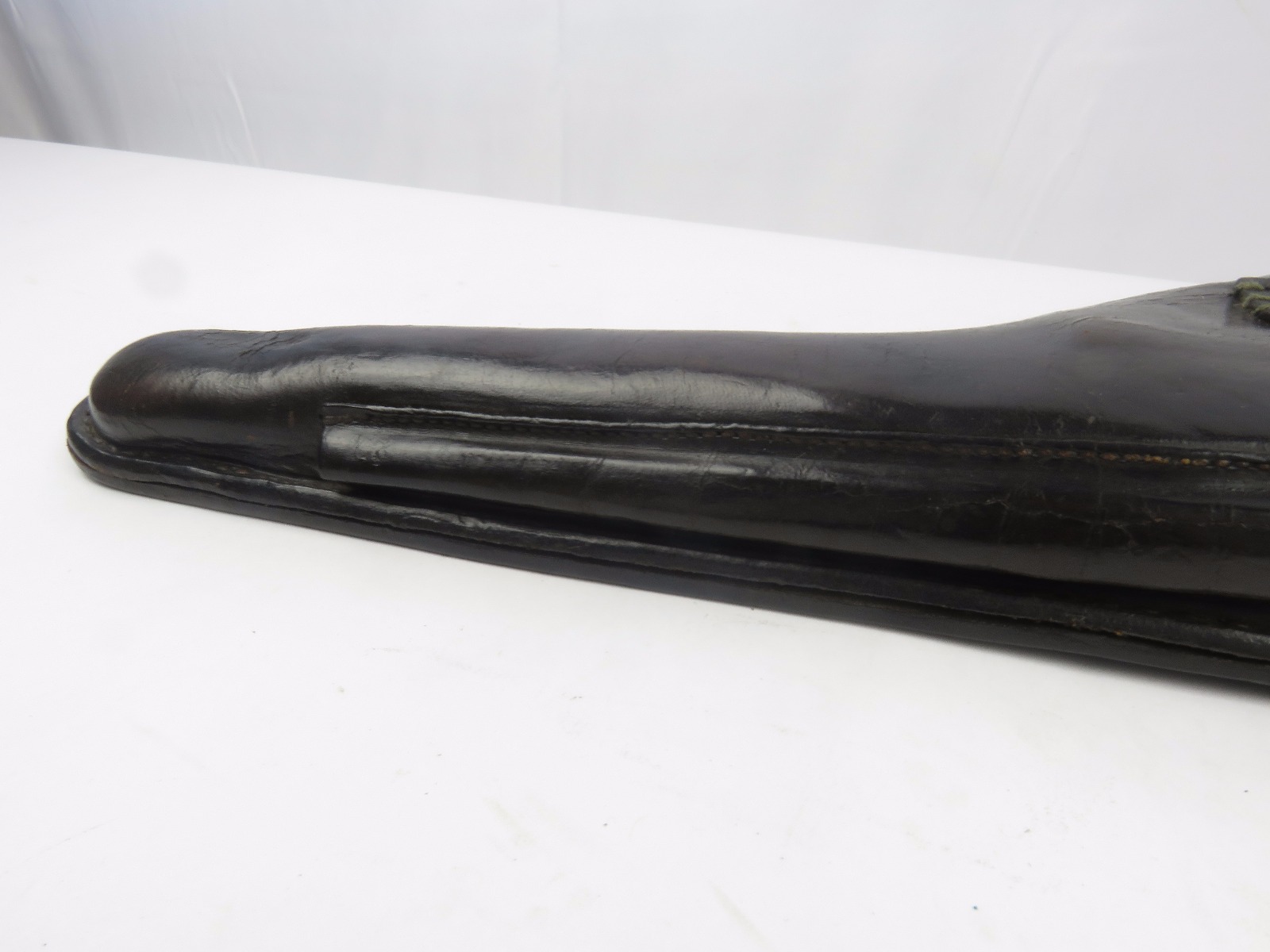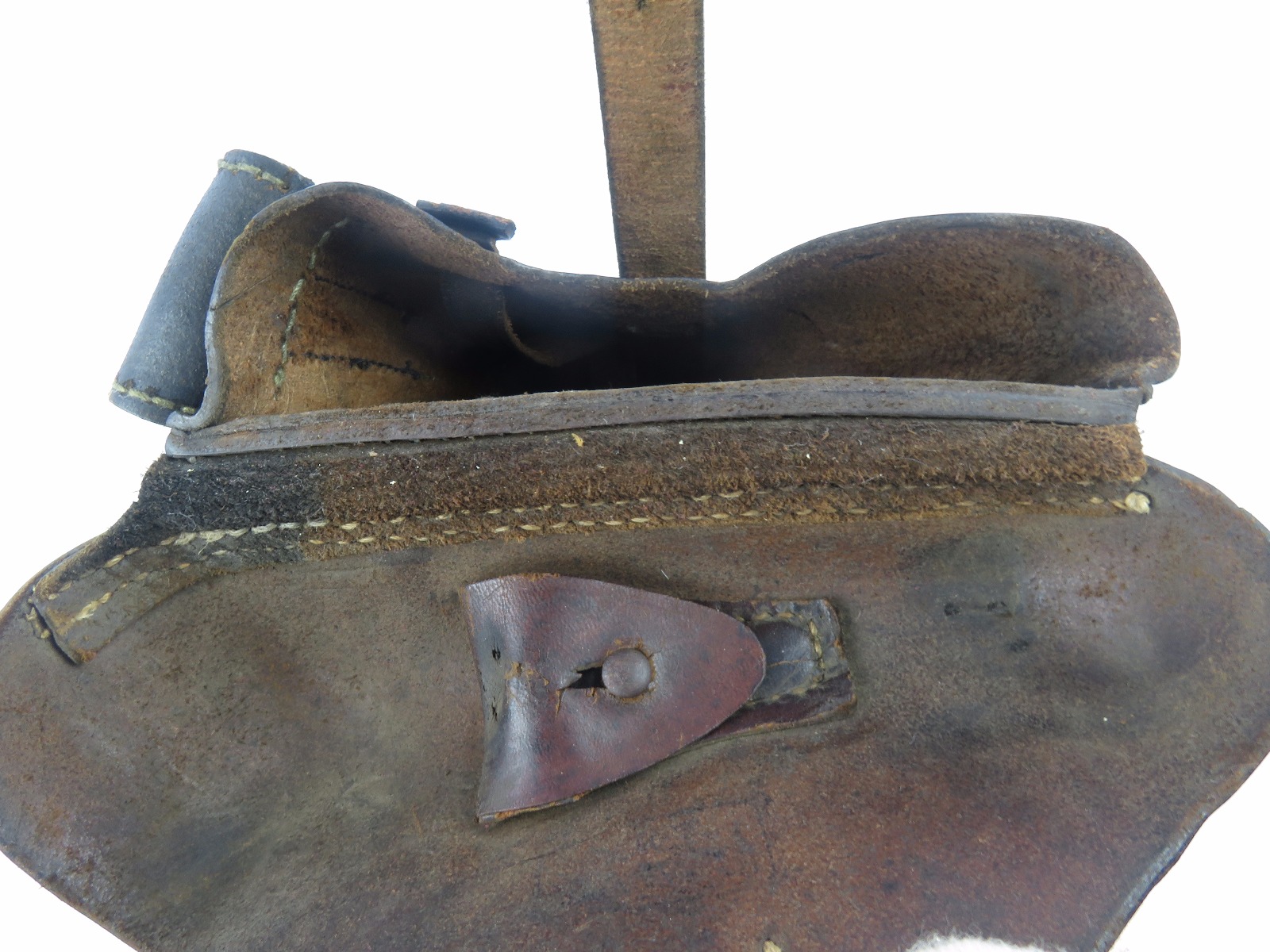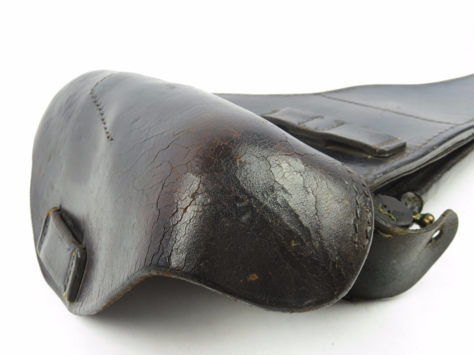 10/31/17 – This is a 1915 dated Artillery Luger holster from WW1. The holster is maker stamped and dated under the top flap on the main body of leather. The stamp is fairly crisp and clear especially given the items age. The leather is in great condition as well with only some light surface cracking and normal use wear. The front toe of the holster has the most surface cracking, and none of this goes very deep. The top flap has similar surface cracking, but again nowhere near going all the way through the leather. The back leather is clean and excellent. Great stitching is all original with no issues as well. The cleaning rod holding is completely in tact as well, with both ears original and in tact as well. Guaranteed all original and authentic.
