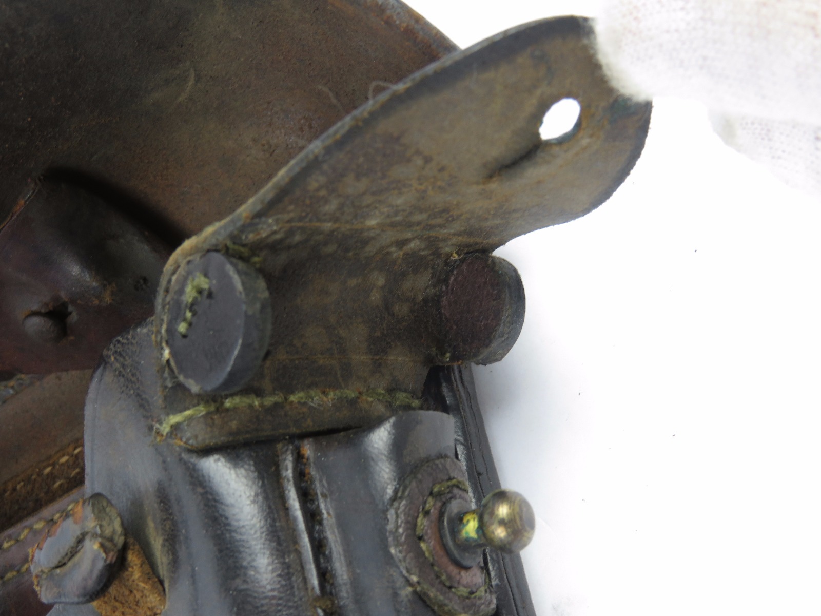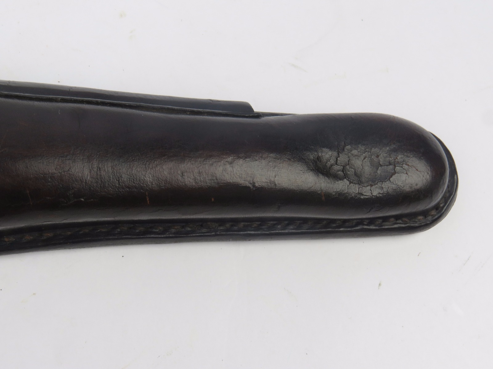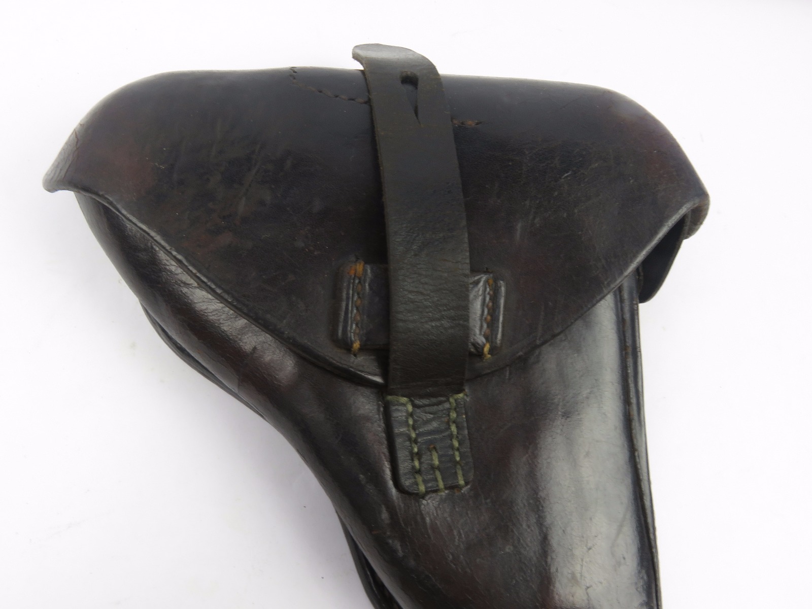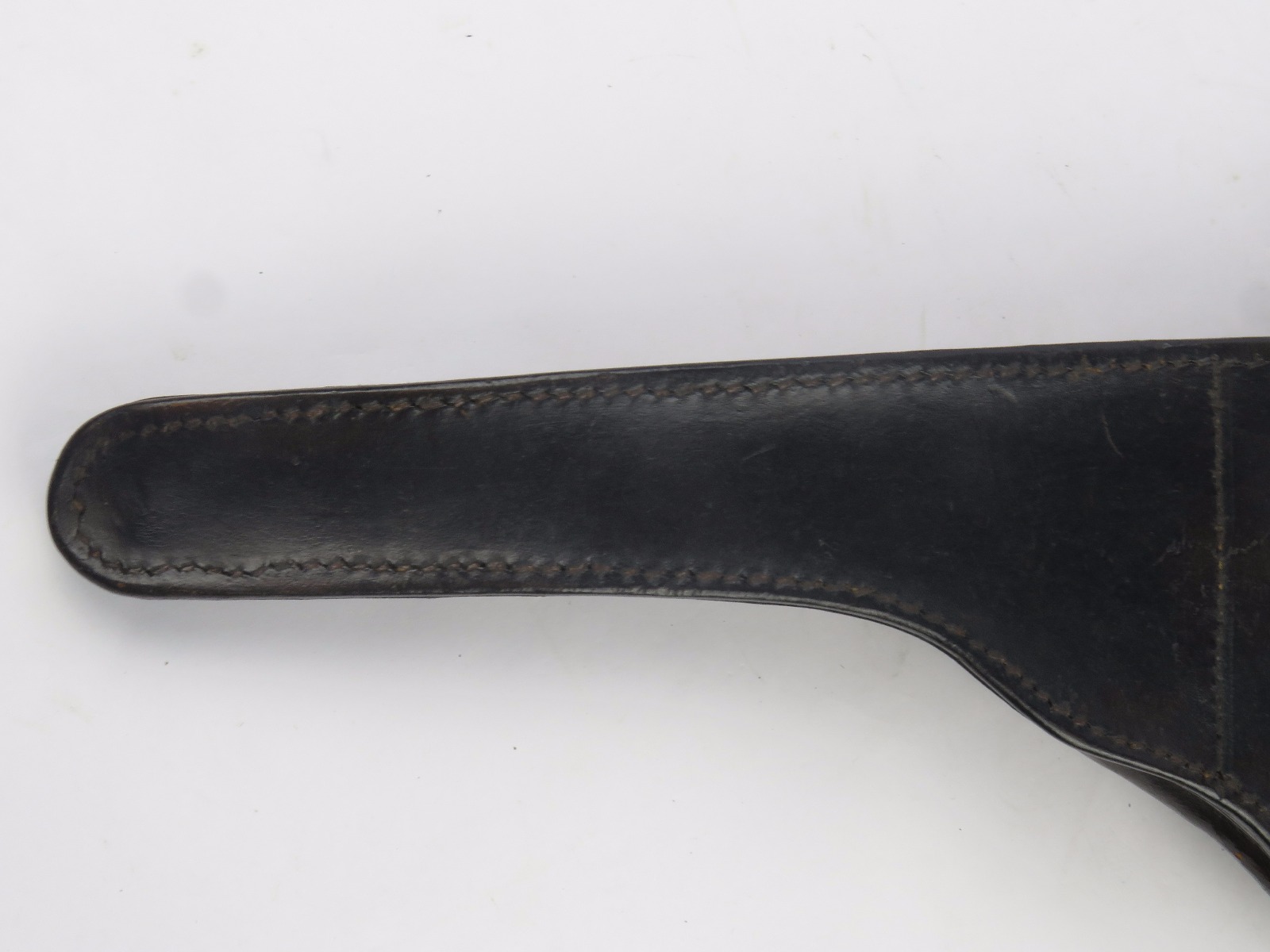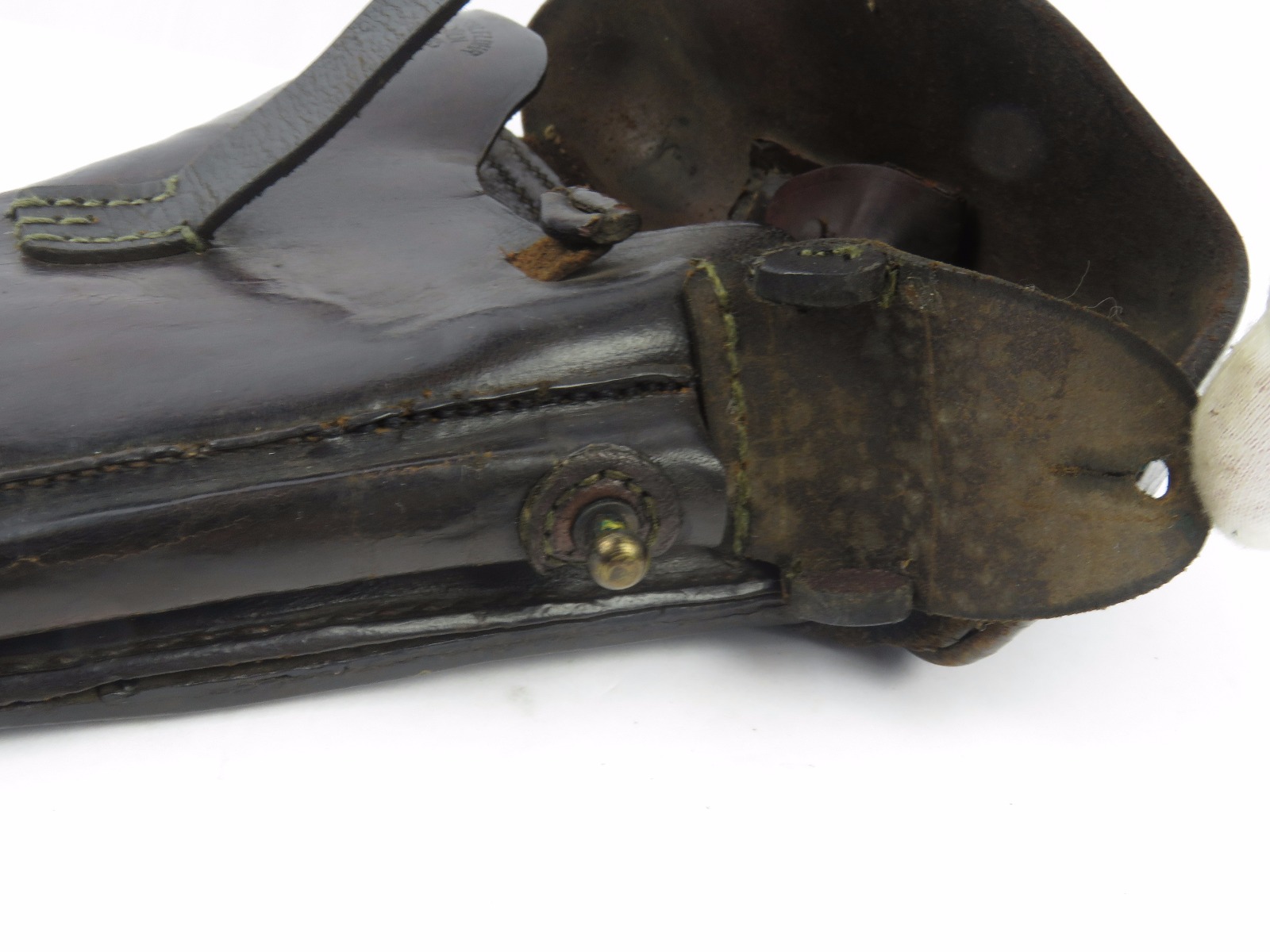 10/31/17 – This is a 1915 dated Artillery Luger holster from WW1. The holster is maker stamped and dated under the top flap on the main body of leather. The stamp is fairly crisp and clear especially given the items age. The leather is in great condition as well with only some light surface cracking and normal use wear. The front toe of the holster has the most surface cracking, and none of this goes very deep. The top flap has similar surface cracking, but again nowhere near going all the way through the leather. The back leather is clean and excellent. Great stitching is all original with no issues as well. The cleaning rod holding is completely in tact as well, with both ears original and in tact as well. Guaranteed all original and authentic.
