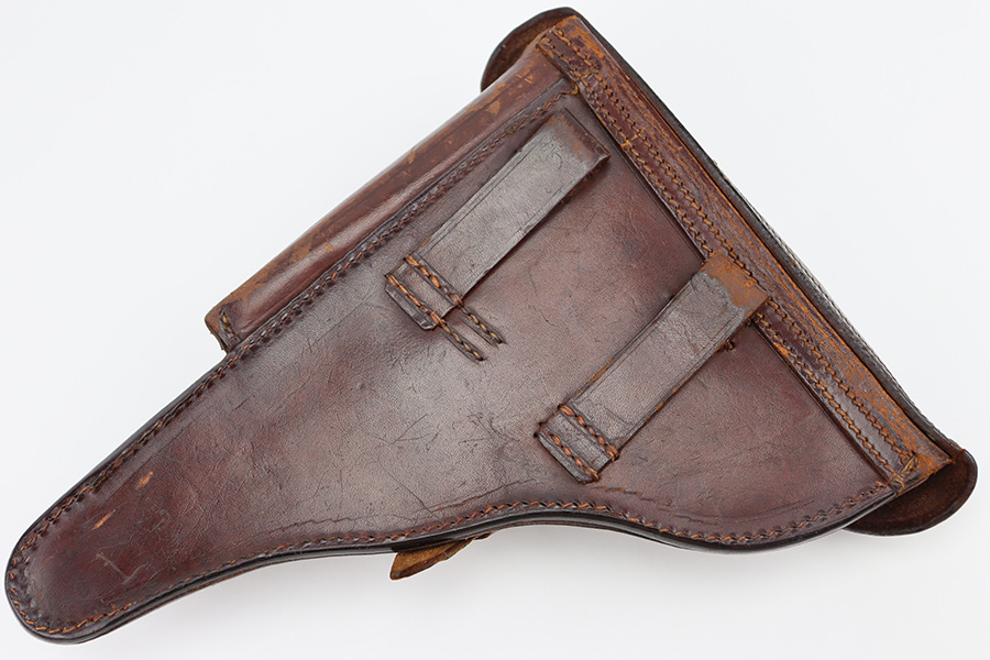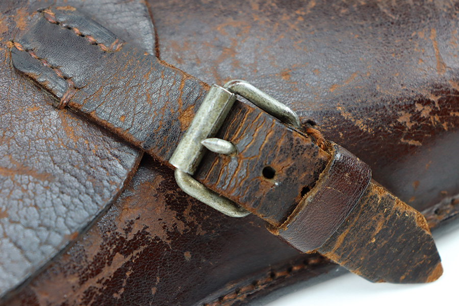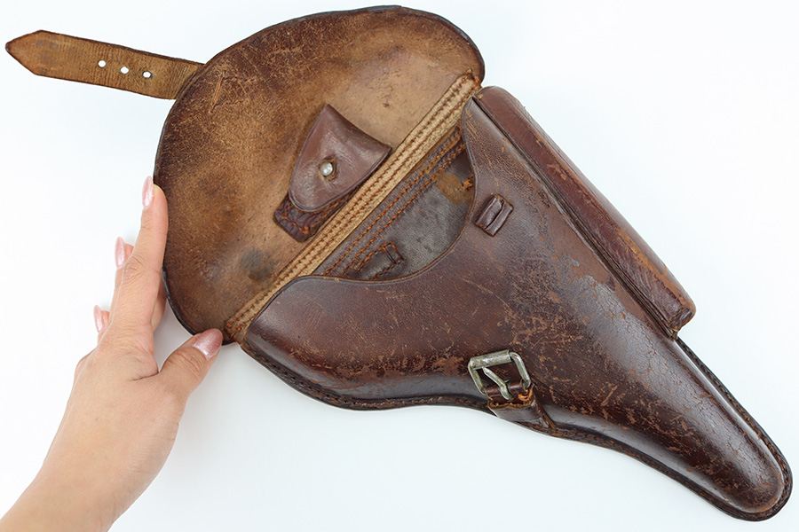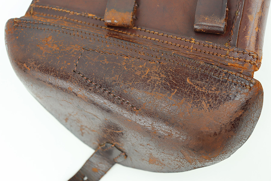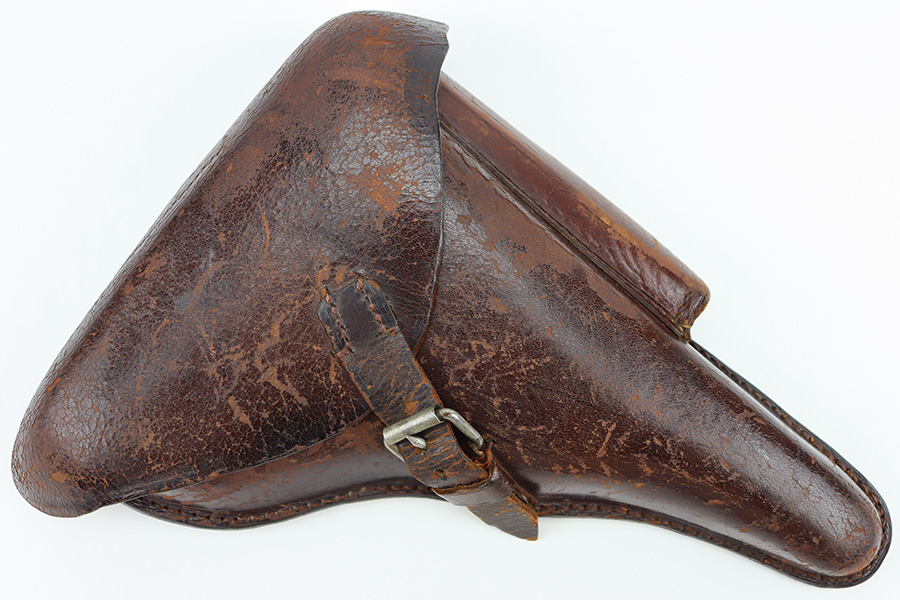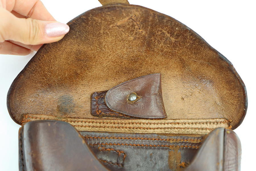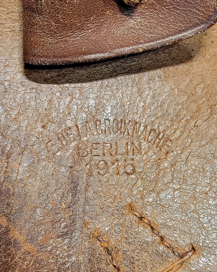 12/27/23 – This is an original, early WW1 era production Luger holster. The holster is in great condition considering its’ age. There’s some surface wrinkling and scuffing on the front leather, but none of this penetrates deep into the leather. The leather is soft and pliable from use and age, but completely intact with all original stitching. Excellent stitching throughout, and a fairly clean interior. The interior lid is maker and date stamped, as shown.