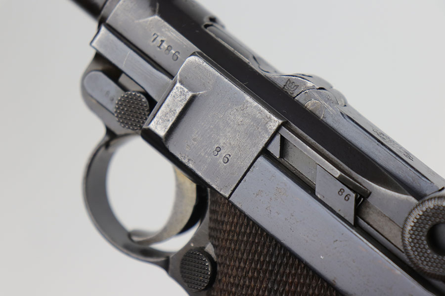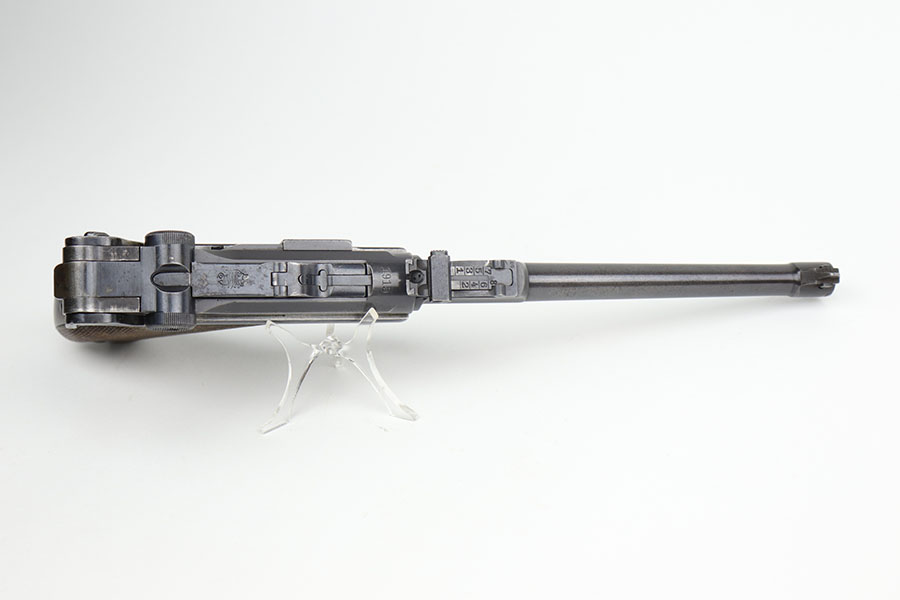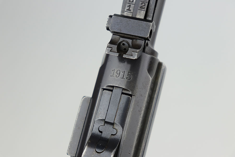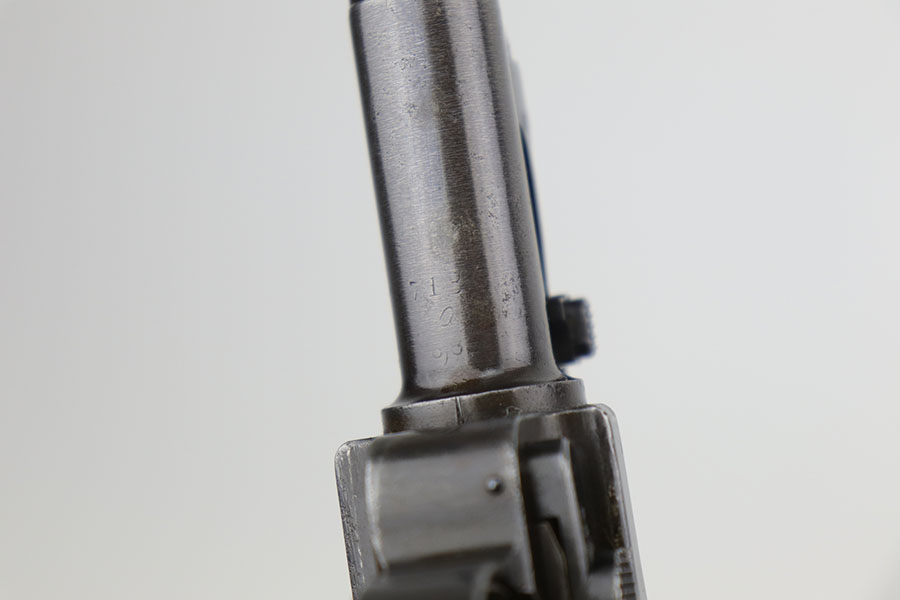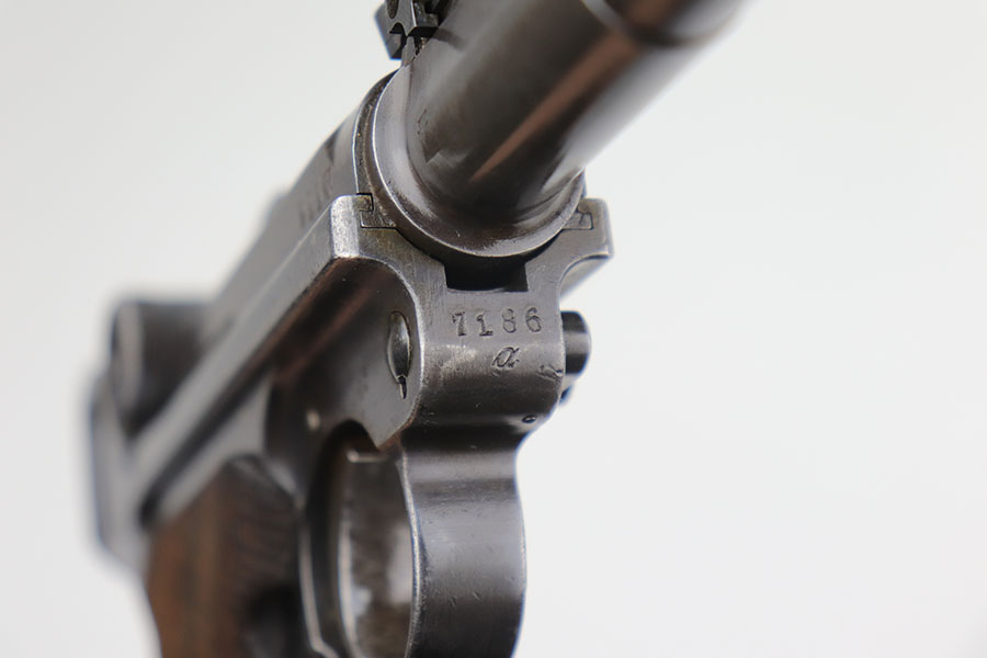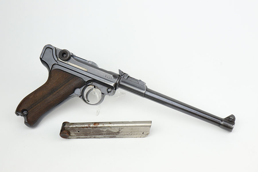 12/16/20 – This is an Artillery DWM Luger from 1915, a fairly scarce find as far as production totals go. The pistol has all matching numbers throughout, but the finish was reblued at some point long ago. For whatever reason, the stock lug was also removed. All numbers are matching on the gun, aside from magazine and grips. Magazine is period original, just mismatched to the pistol. The reblue isn’t obvious aside from the small parts, which should be strawed. The bore is excellent, so this one would make a good shooter.
