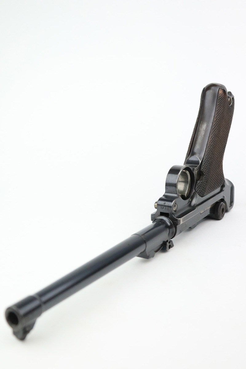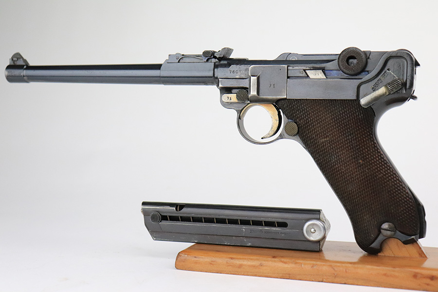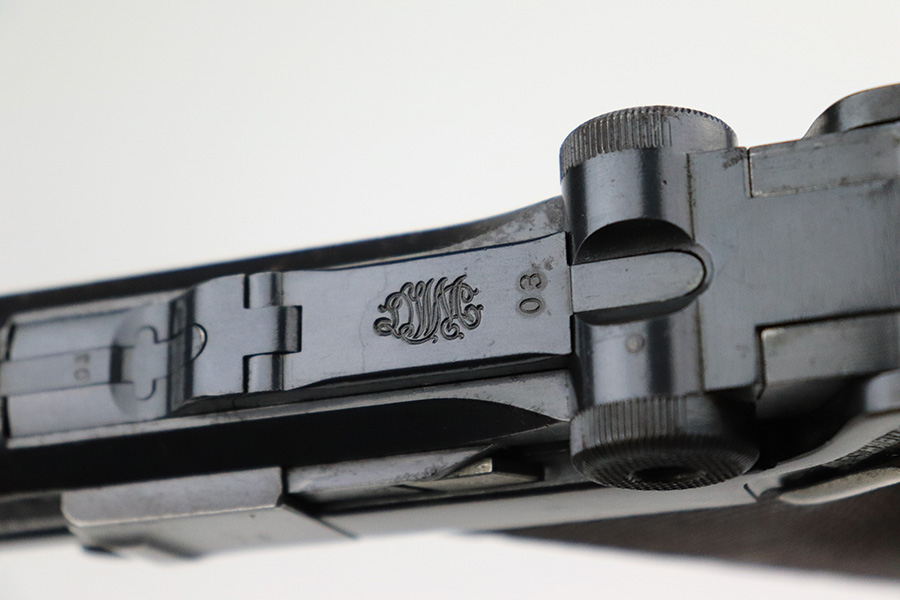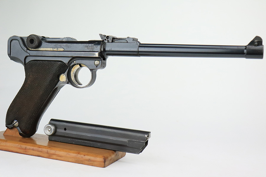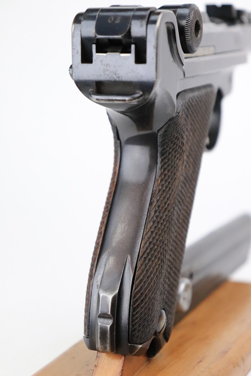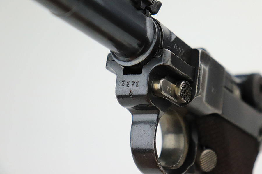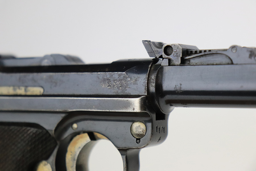 7/20/22 – This is a very nice example of a DWM Artillery Luger issued to the Imperial German military. It has the proper Imperial proofs, but the gun is mismatched. The whole upper is mismatched to the lower, however, all of the parts of both the upper and lower are matching to themselves. The gun has retained about 93% of its bluing. There is minor wear on the side plate, side rails, and some of the high edges. Minor thinning and brown patina on the grip straps. Areas of spotty oxidation and pin-pricking around the muzzle, on the chamber, and on the right side of the slide. Comes with nice wood grips – the left panel is number and matching, the right panel is not numbered but has an Imperial proof. Also comes with a WW2-era police arsenal-numbered magazine. The bore has decent rifling, but there is minor pitting in the grooves.