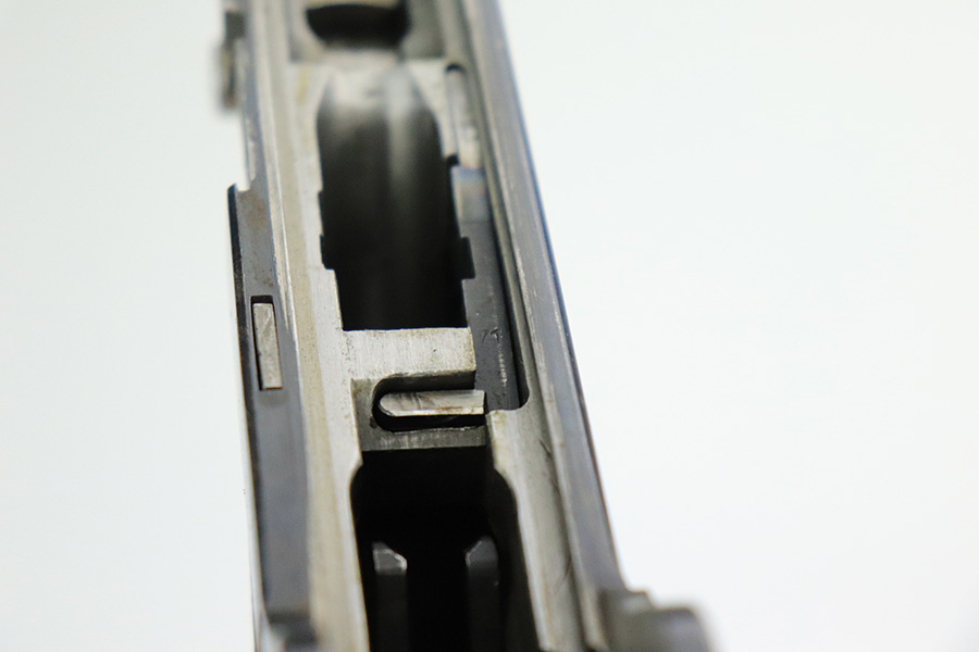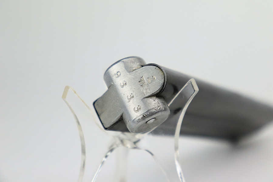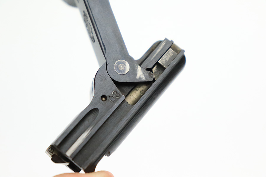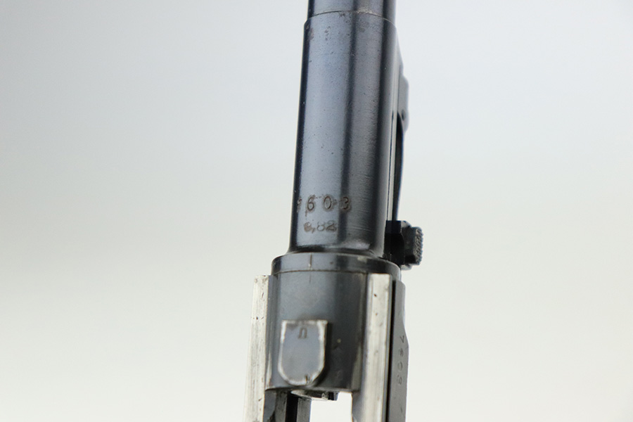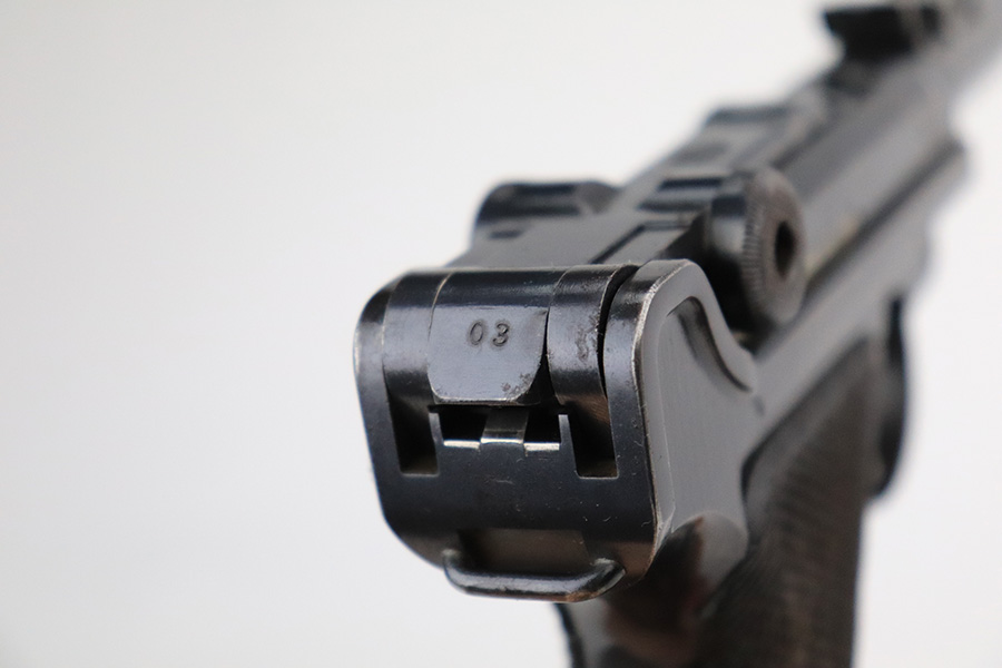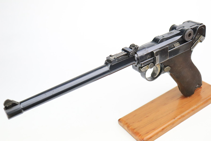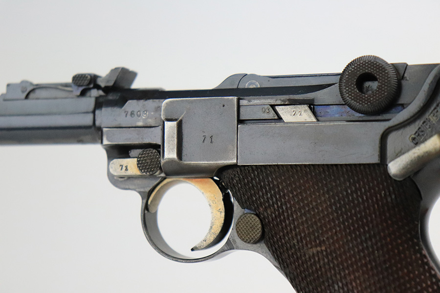 7/20/22 – This is a very nice example of a DWM Artillery Luger issued to the Imperial German military. It has the proper Imperial proofs, but the gun is mismatched. The whole upper is mismatched to the lower, however, all of the parts of both the upper and lower are matching to themselves. The gun has retained about 93% of its bluing. There is minor wear on the side plate, side rails, and some of the high edges. Minor thinning and brown patina on the grip straps. Areas of spotty oxidation and pin-pricking around the muzzle, on the chamber, and on the right side of the slide. Comes with nice wood grips – the left panel is number and matching, the right panel is not numbered but has an Imperial proof. Also comes with a WW2-era police arsenal-numbered magazine. The bore has decent rifling, but there is minor pitting in the grooves.