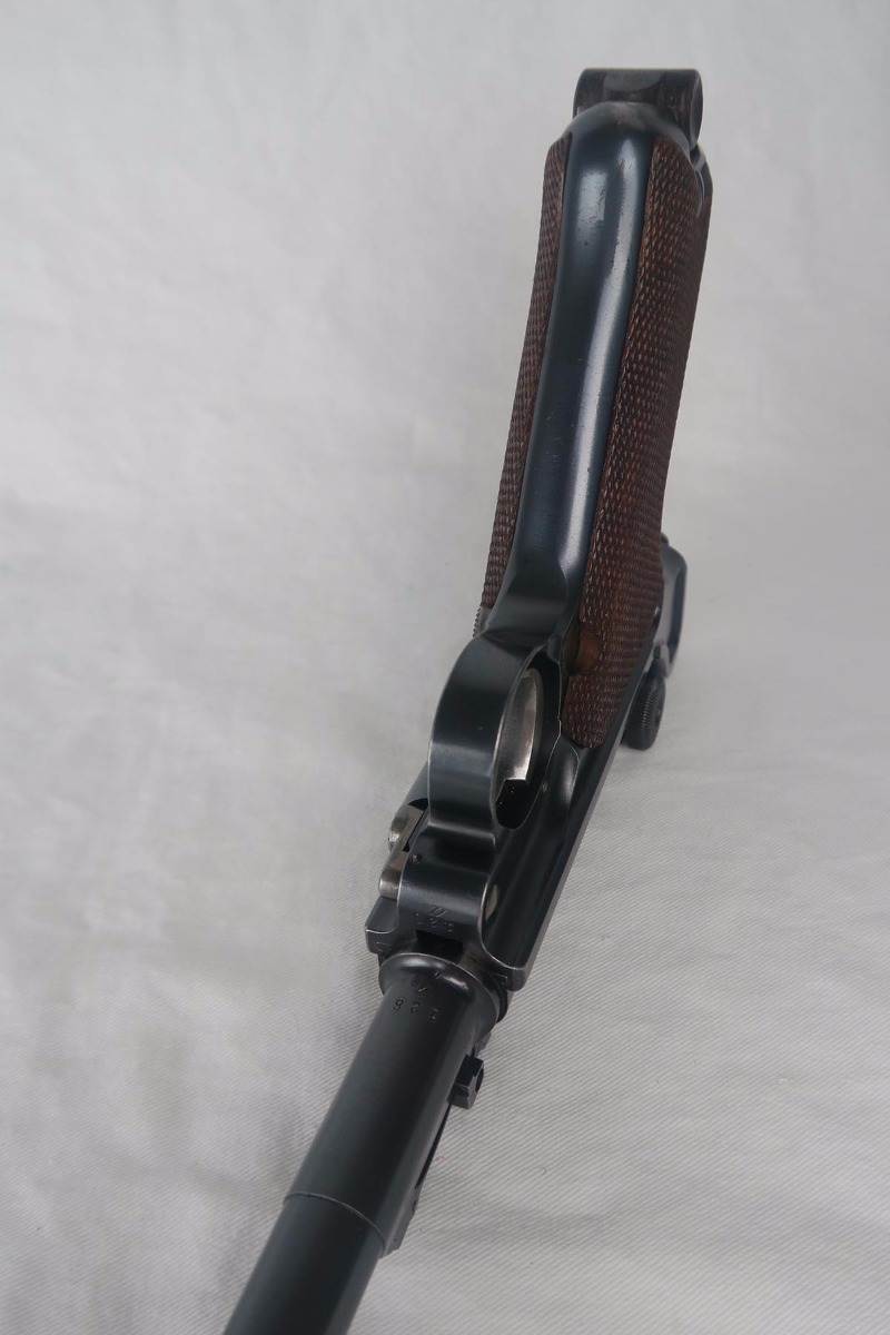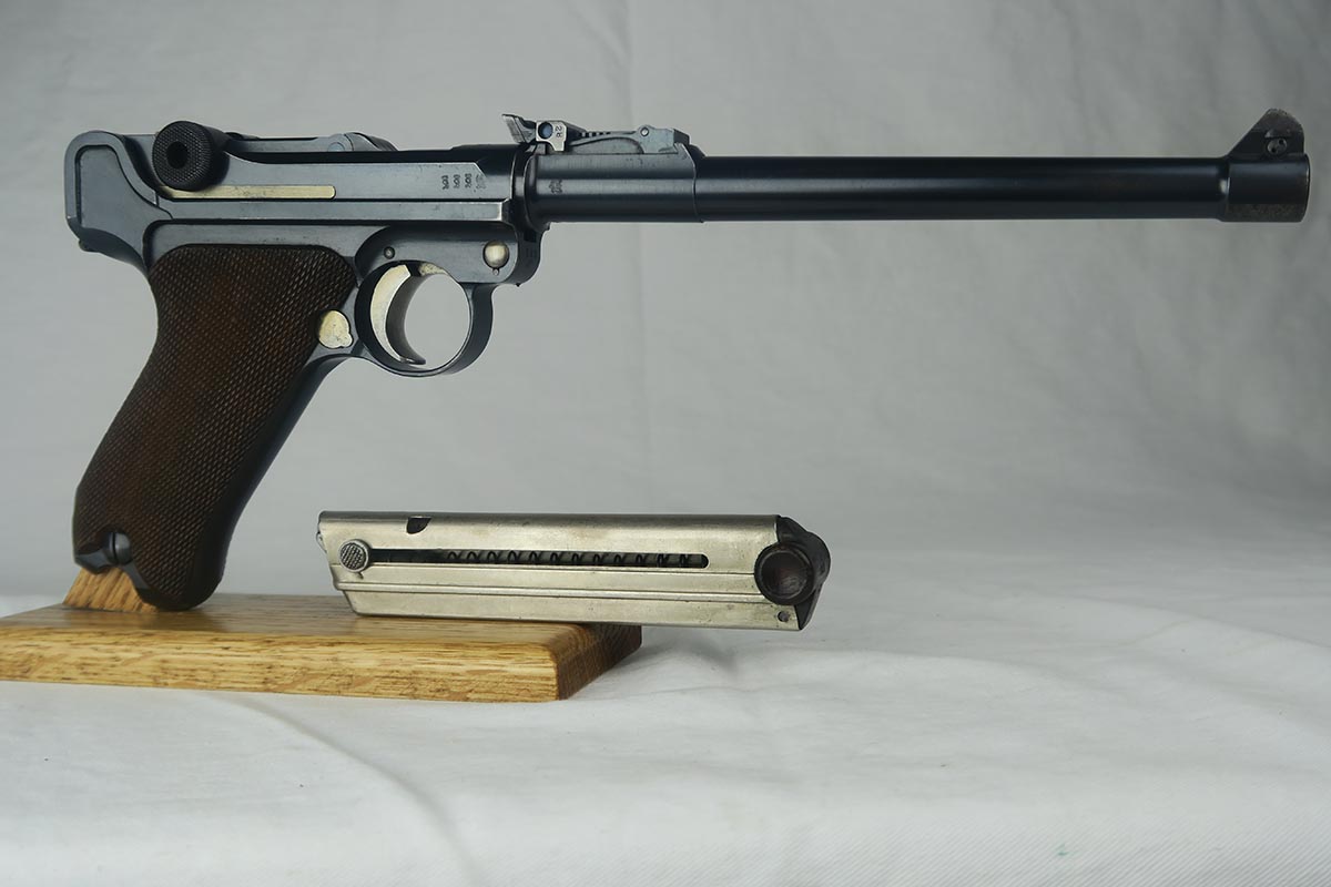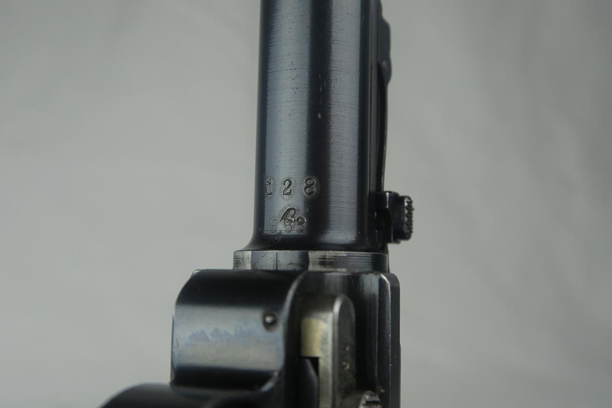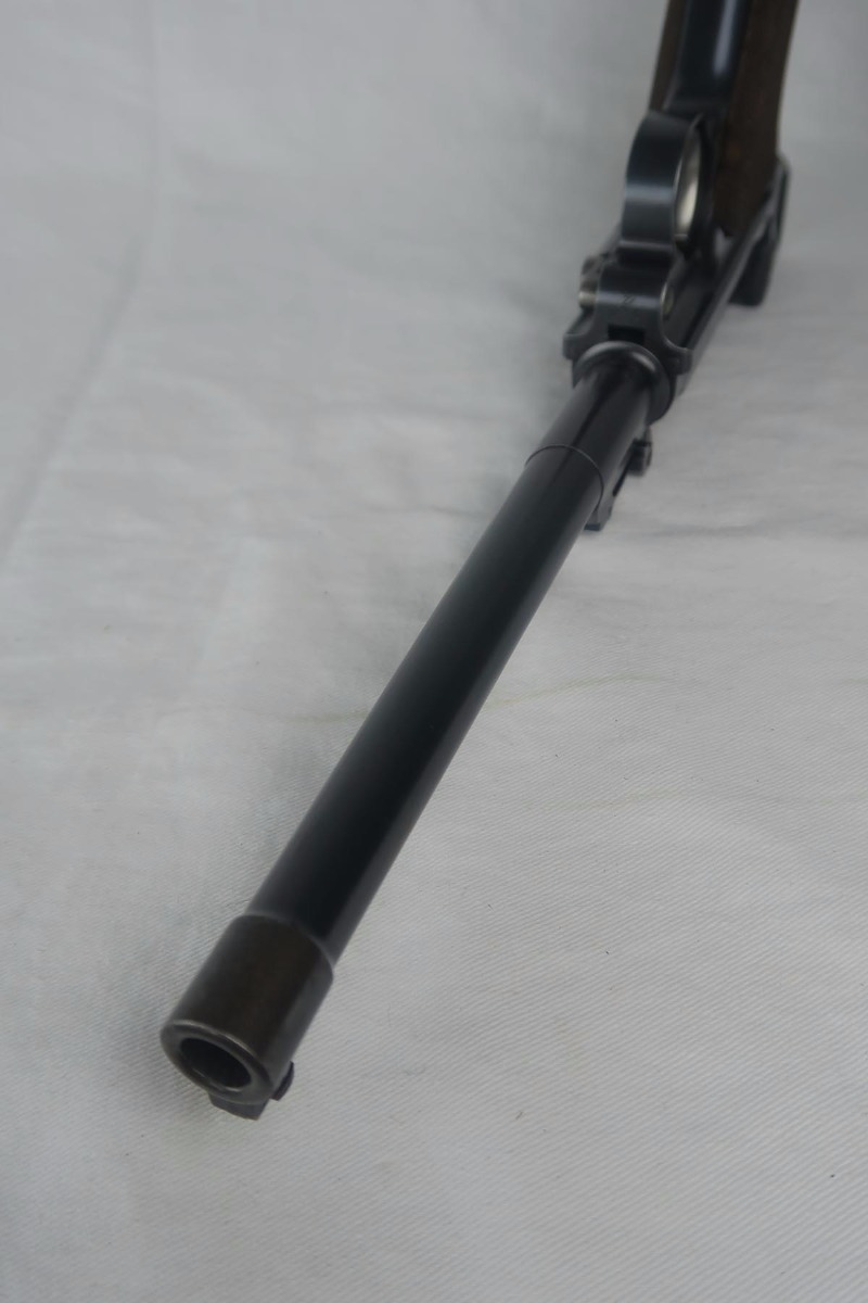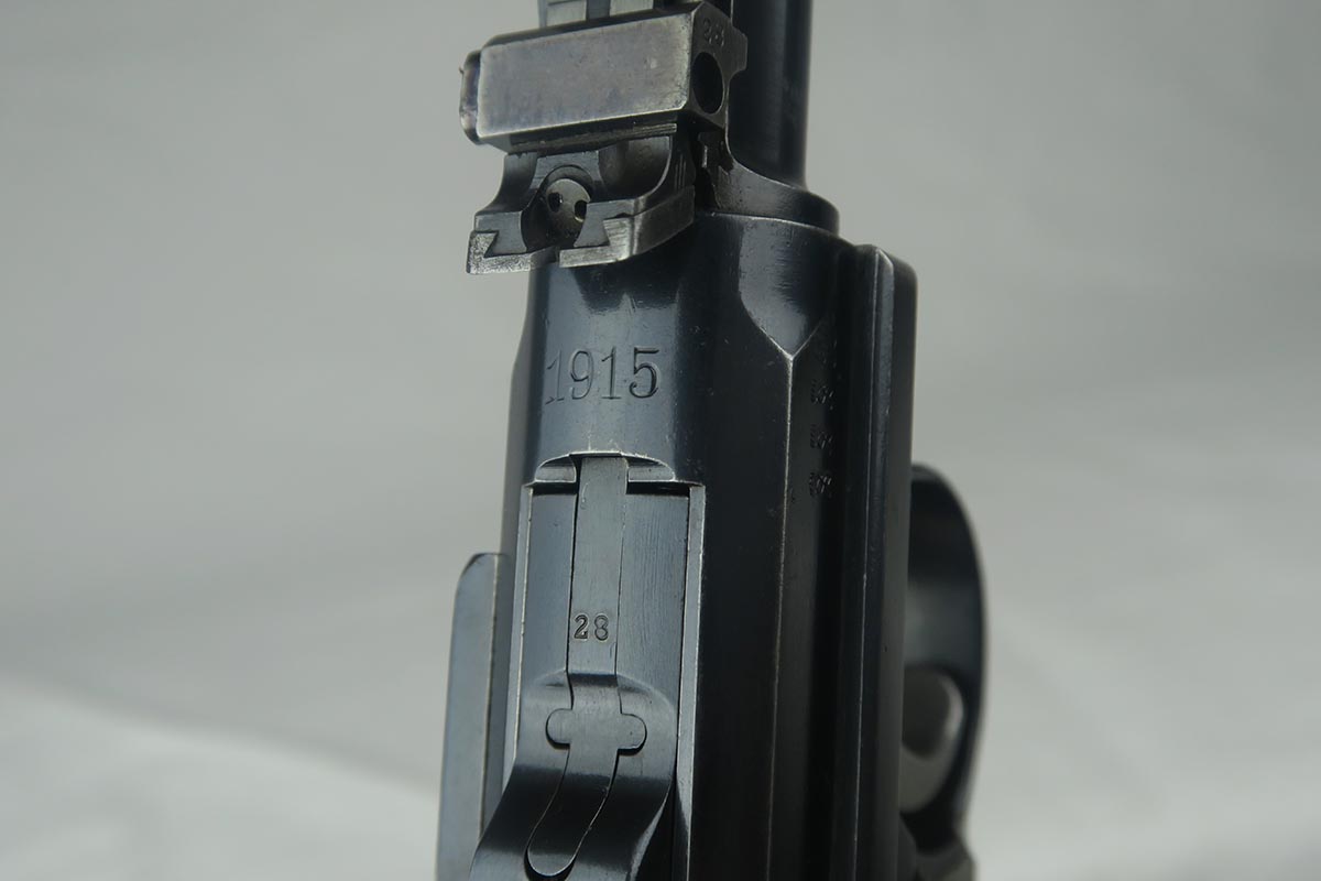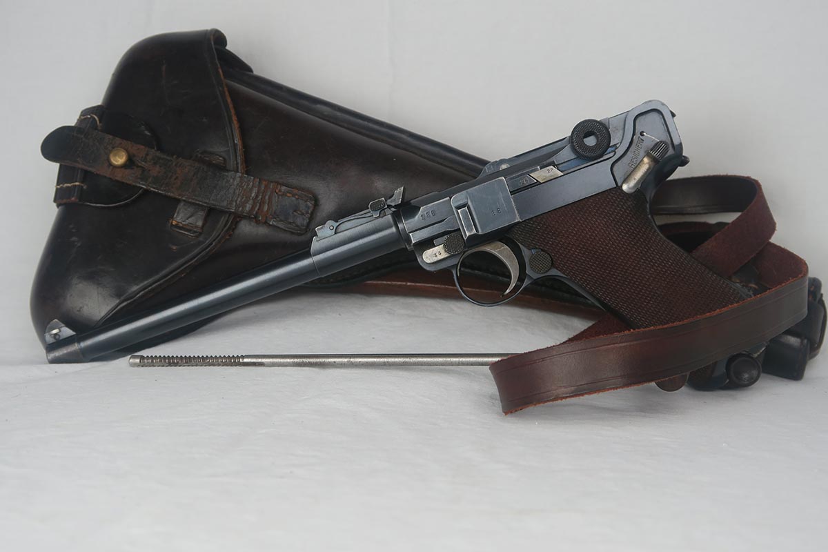 8/17/17 – This is an excellent and scarce DWM Artillery LP.08, with original stock and holster.  It is 1915 dated, and one of only 15,000 manufactured.  The original bluing rates at about 97%, with a little bit of wear on the muzzle, sideplate and bottom of the front strap.  The magazine is the original matching magazine, as is the stock.  The holster is 1915 dated with a faint maker mark, but some of the leather has been replaced, including the shoulder strap, and some of the minor securing straps.  All small parts on the pistol are matching, and the grips are unnumbered.  Pistol is in the proper serial range for a 1915 DWM LP.08.  Barrel gauge is appropriately stamped on underside of the barrel.  Listing also includes an original cleaning rod.  Strong bore with no major flaws.