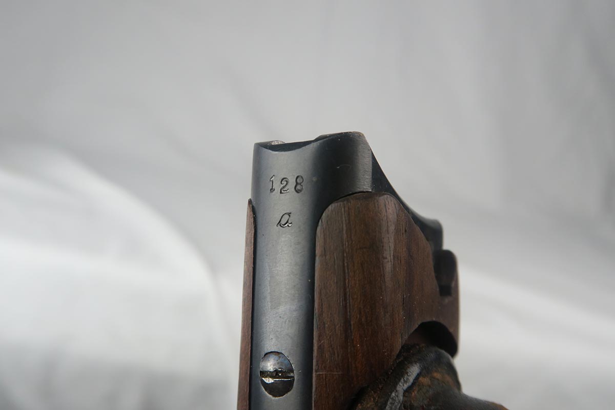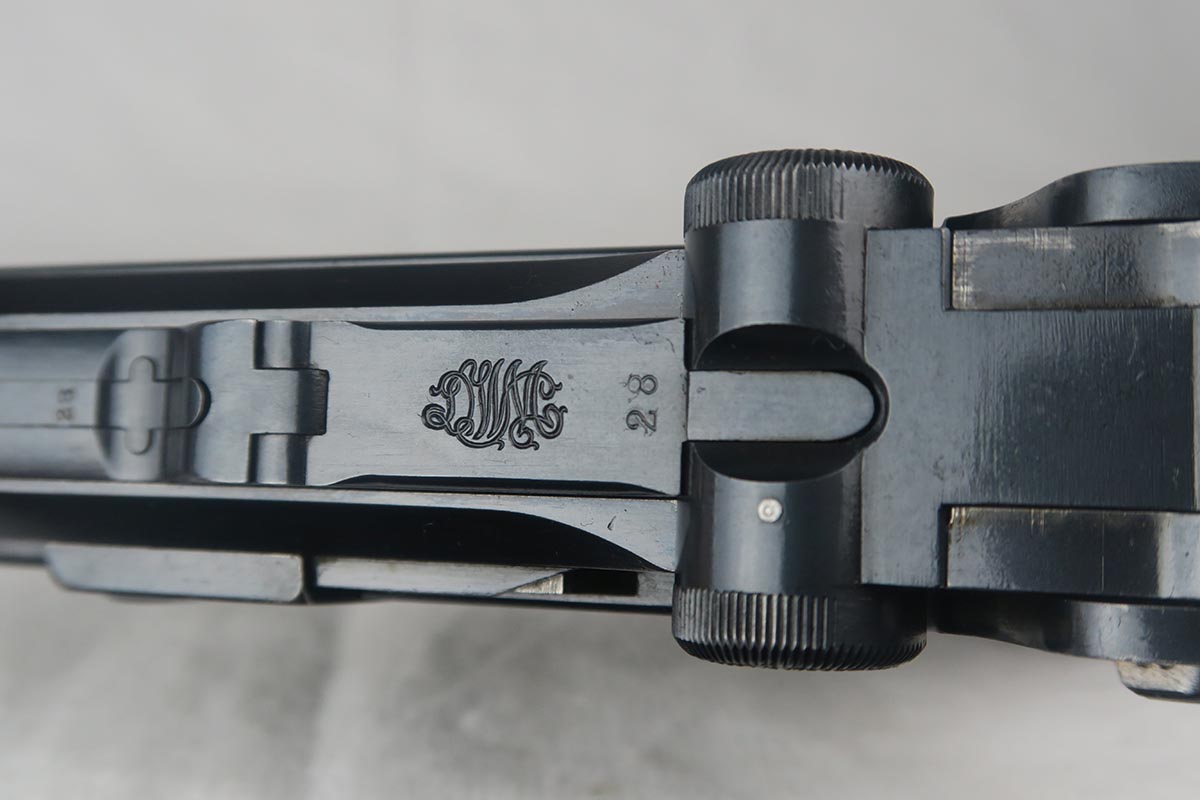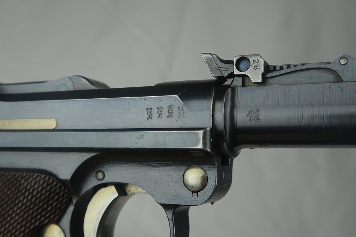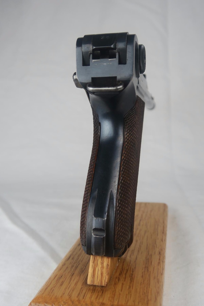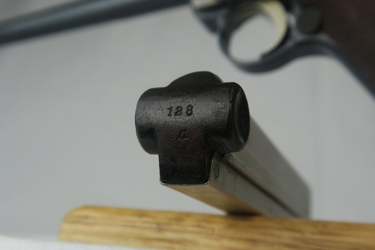 8/17/17 – This is an excellent and scarce DWM Artillery LP.08, with original stock and holster.  It is 1915 dated, and one of only 15,000 manufactured.  The original bluing rates at about 97%, with a little bit of wear on the muzzle, sideplate and bottom of the front strap.  The magazine is the original matching magazine, as is the stock.  The holster is 1915 dated with a faint maker mark, but some of the leather has been replaced, including the shoulder strap, and some of the minor securing straps.  All small parts on the pistol are matching, and the grips are unnumbered.  Pistol is in the proper serial range for a 1915 DWM LP.08.  Barrel gauge is appropriately stamped on underside of the barrel.  Listing also includes an original cleaning rod.  Strong bore with no major flaws.