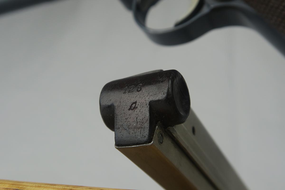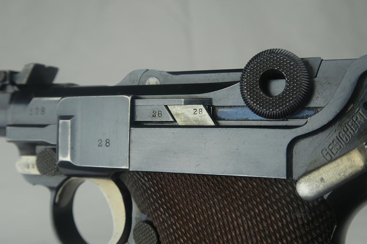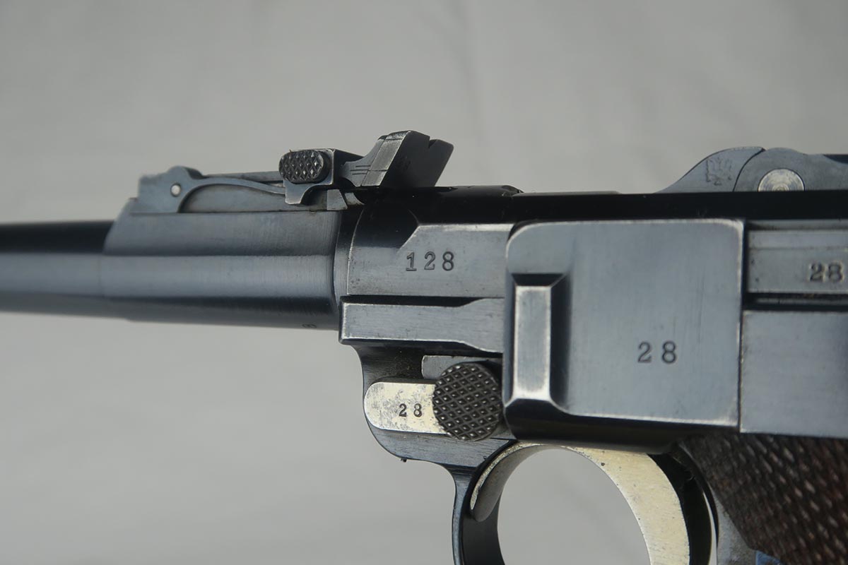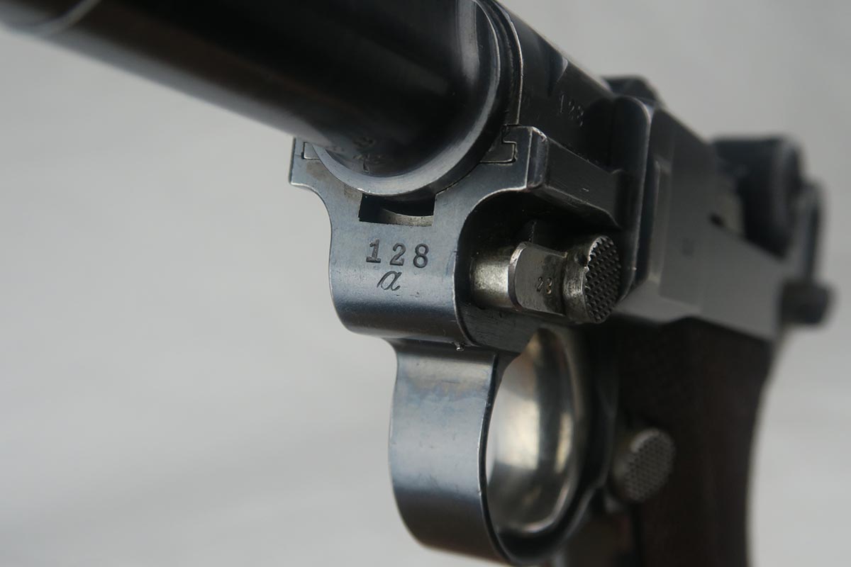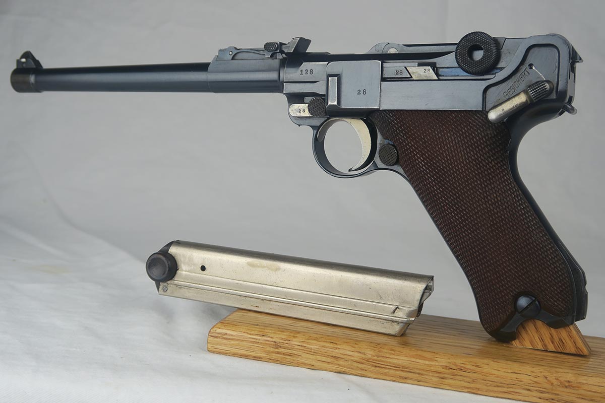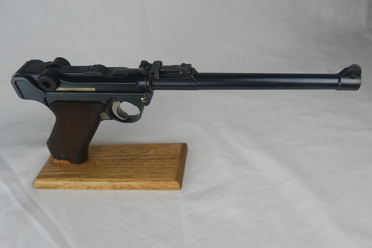 8/17/17 – This is an excellent and scarce DWM Artillery LP.08, with original stock and holster.  It is 1915 dated, and one of only 15,000 manufactured.  The original bluing rates at about 97%, with a little bit of wear on the muzzle, sideplate and bottom of the front strap.  The magazine is the original matching magazine, as is the stock.  The holster is 1915 dated with a faint maker mark, but some of the leather has been replaced, including the shoulder strap, and some of the minor securing straps.  All small parts on the pistol are matching, and the grips are unnumbered.  Pistol is in the proper serial range for a 1915 DWM LP.08.  Barrel gauge is appropriately stamped on underside of the barrel.  Listing also includes an original cleaning rod.  Strong bore with no major flaws.