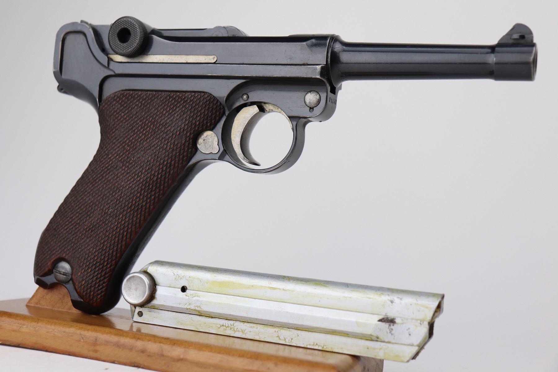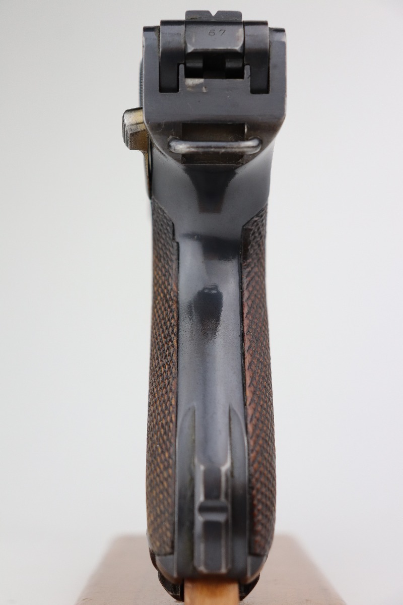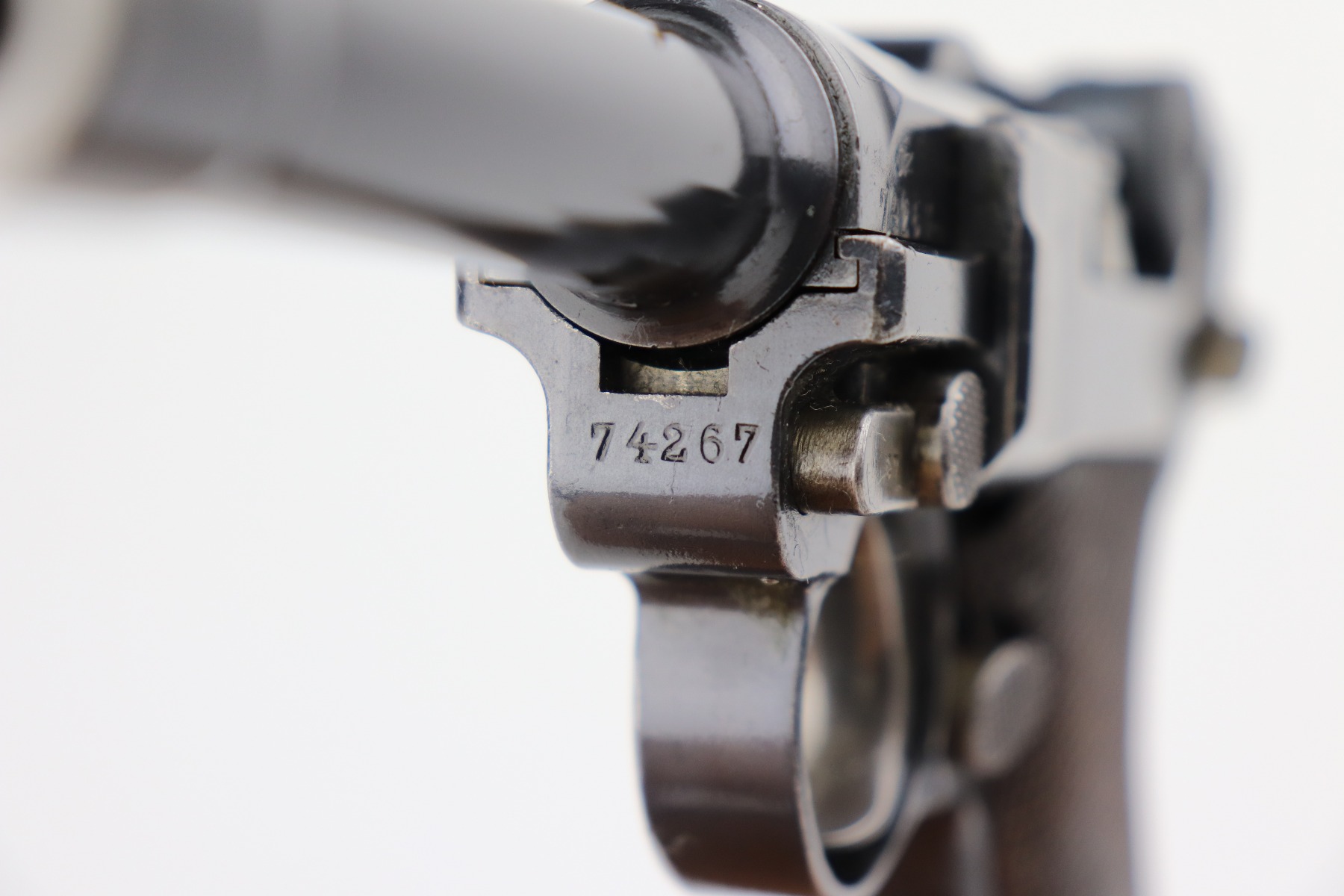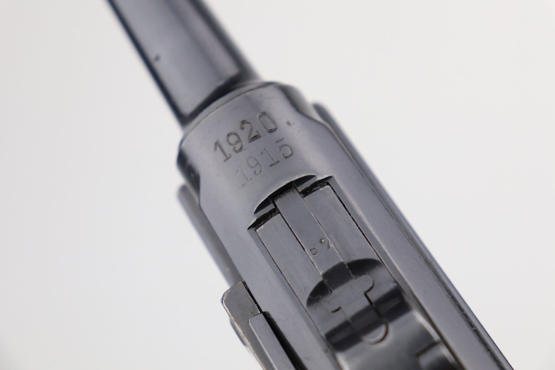 3/23/21 – This is a rare chamber-dated 1915 DWM Luger that was originally sold in the commercial market and then reworked for issue to the German police during the Weimar era. The gun is all matching and has commercial “Crown N” proofs. It has a “1920” rework marking on the chamber, an added police seer safety, and and a mostly-peened police unit marking on the front strap. It also comes with a matching Haenel police magazine. When it was reworked, the barrel was replaced to make the gun 9mm and the gun was refinished. It has retained about 94-95% of its bluing. There is wear on the side plate and hints of wear around the muzzle and front edges of the frame. Very minor freckling on the straps. It comes with nice grips. The bore has decent rifling, but there is pin-pricking throughout.