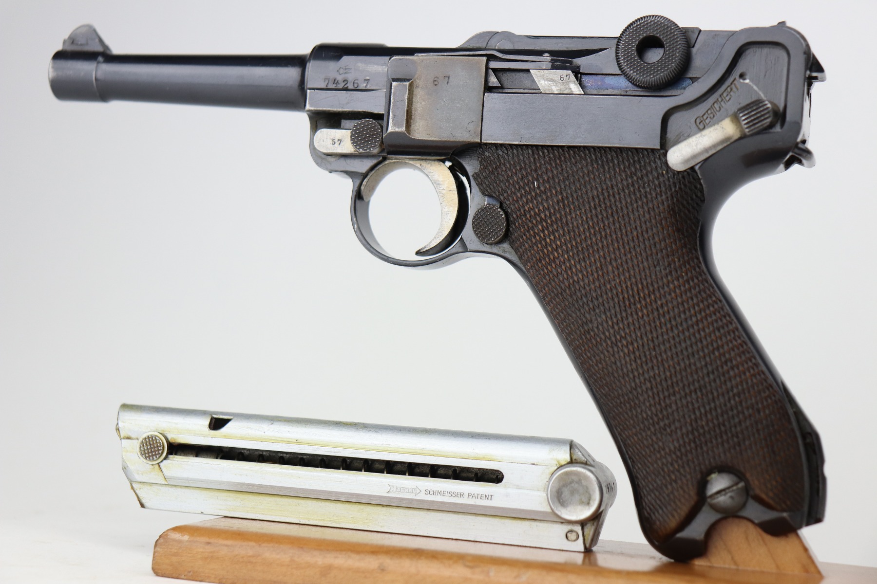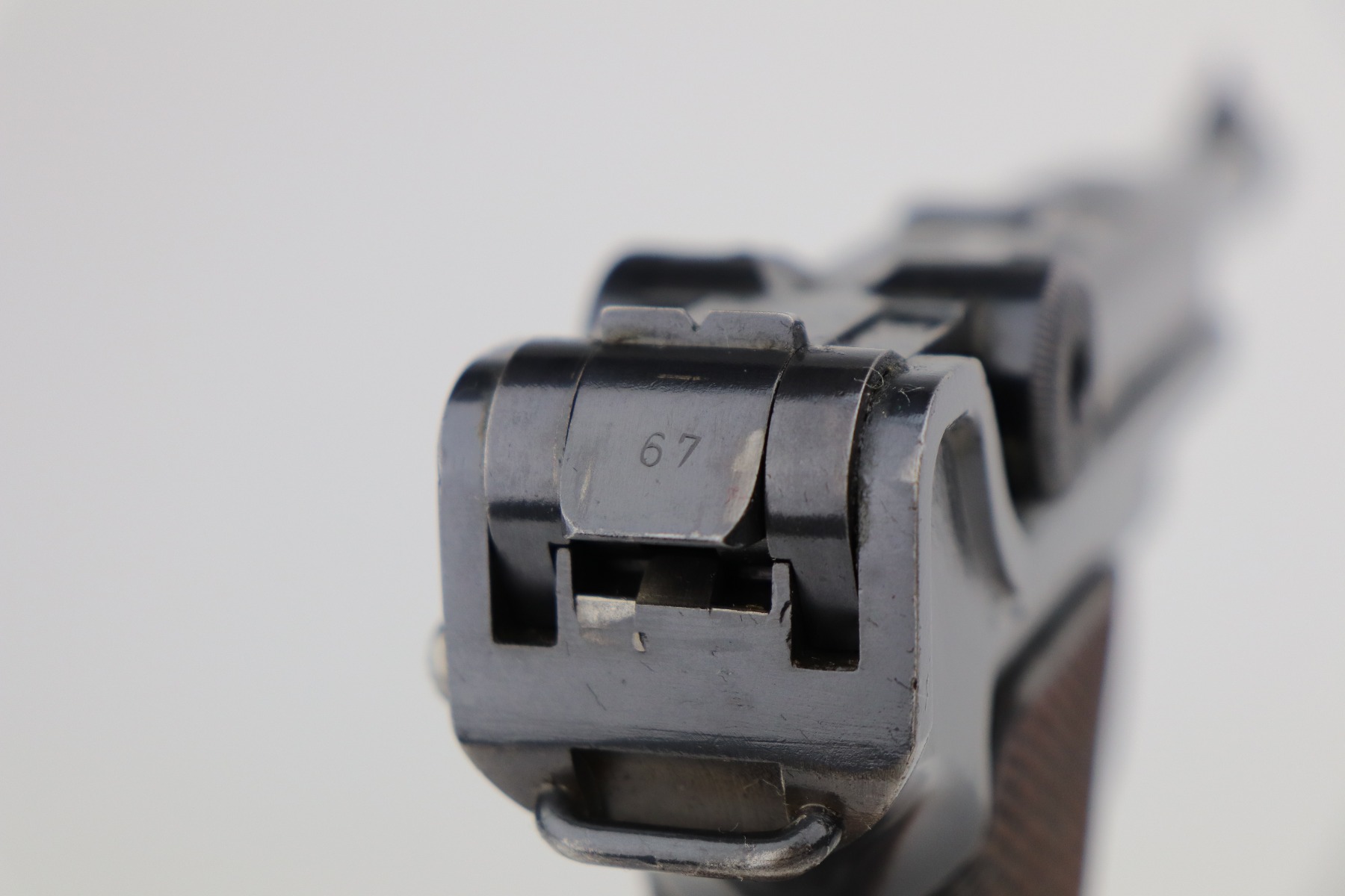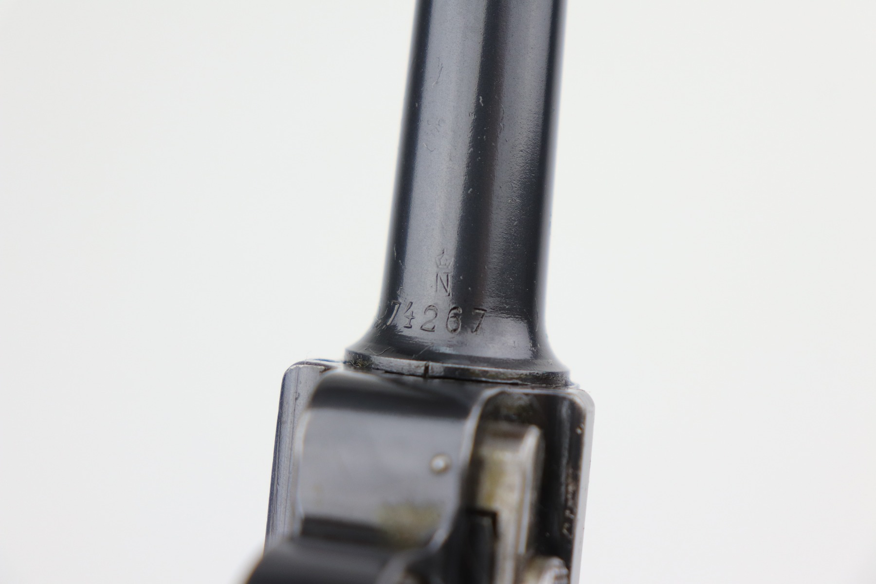 3/23/21 – This is a rare chamber-dated 1915 DWM Luger that was originally sold in the commercial market and then reworked for issue to the German police during the Weimar era. The gun is all matching and has commercial “Crown N” proofs. It has a “1920” rework marking on the chamber, an added police seer safety, and and a mostly-peened police unit marking on the front strap. It also comes with a matching Haenel police magazine. When it was reworked, the barrel was replaced to make the gun 9mm and the gun was refinished. It has retained about 94-95% of its bluing. There is wear on the side plate and hints of wear around the muzzle and front edges of the frame. Very minor freckling on the straps. It comes with nice grips. The bore has decent rifling, but there is pin-pricking throughout.