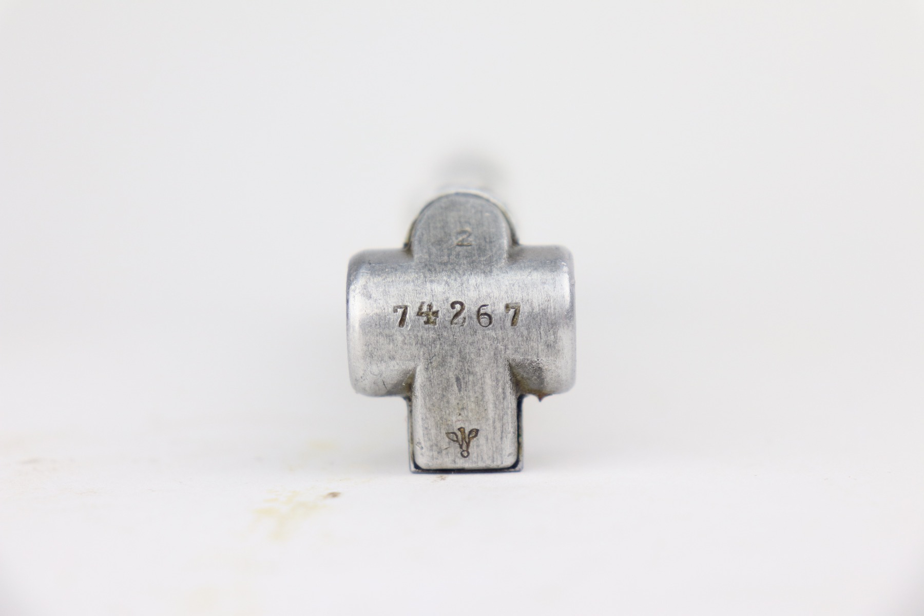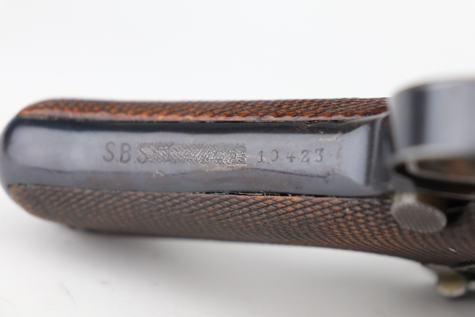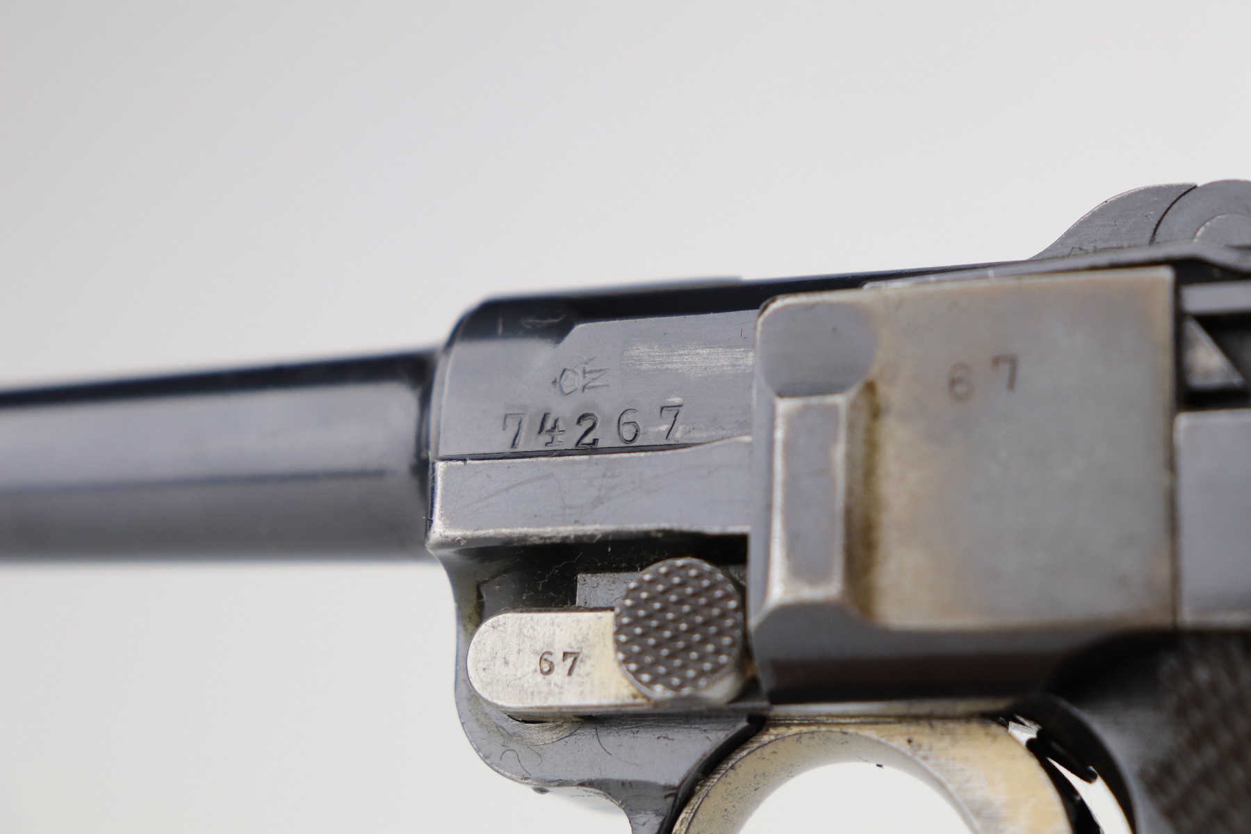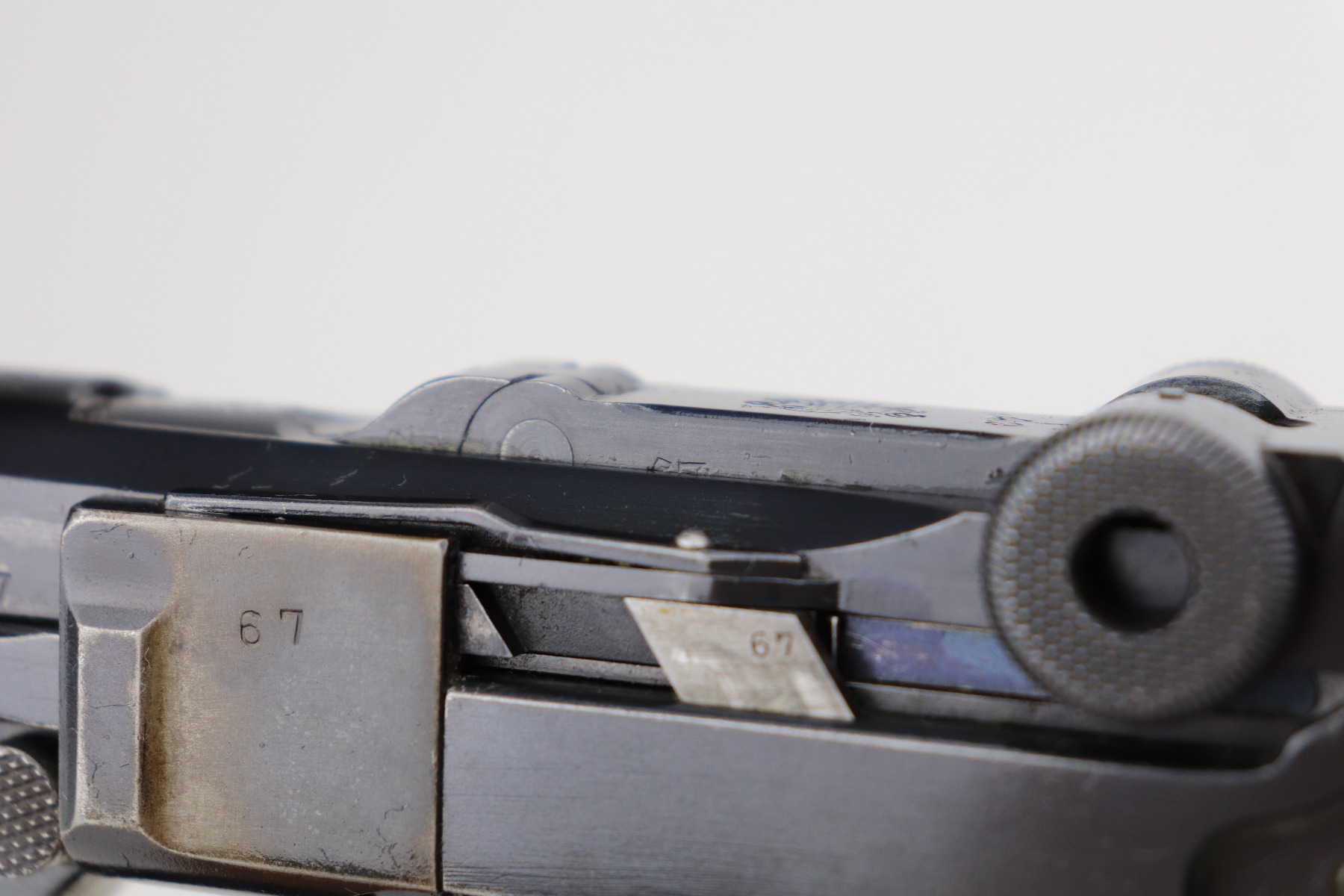 3/23/21 – This is a rare chamber-dated 1915 DWM Luger that was originally sold in the commercial market and then reworked for issue to the German police during the Weimar era. The gun is all matching and has commercial “Crown N” proofs. It has a “1920” rework marking on the chamber, an added police seer safety, and and a mostly-peened police unit marking on the front strap. It also comes with a matching Haenel police magazine. When it was reworked, the barrel was replaced to make the gun 9mm and the gun was refinished. It has retained about 94-95% of its bluing. There is wear on the side plate and hints of wear around the muzzle and front edges of the frame. Very minor freckling on the straps. It comes with nice grips. The bore has decent rifling, but there is pin-pricking throughout.