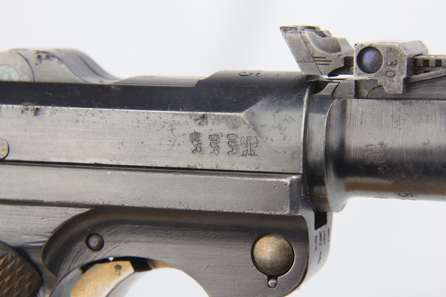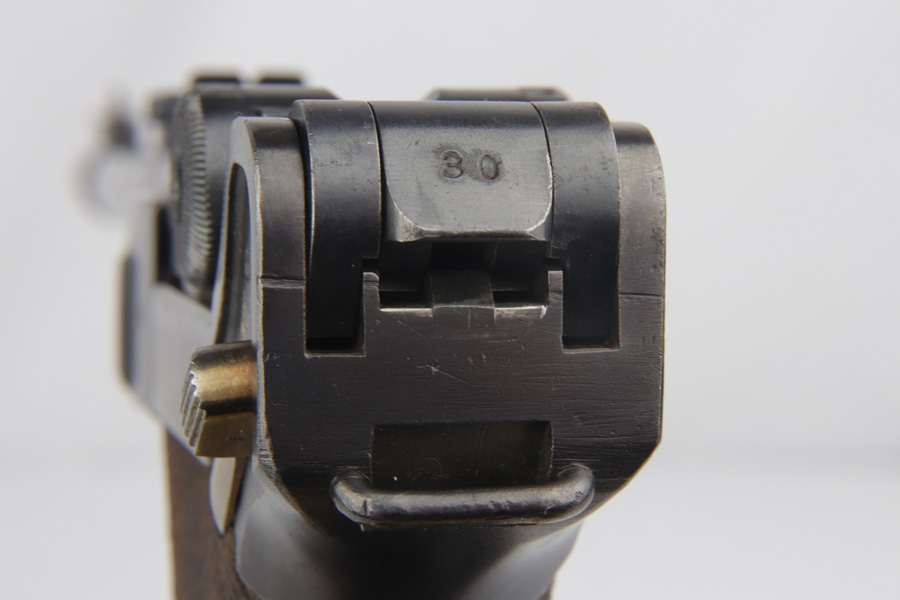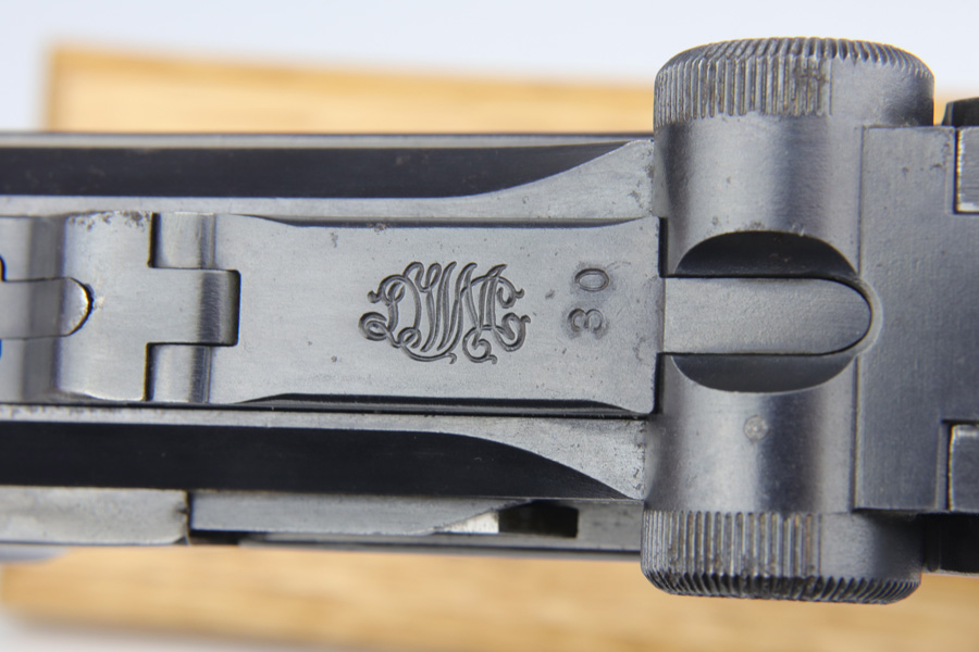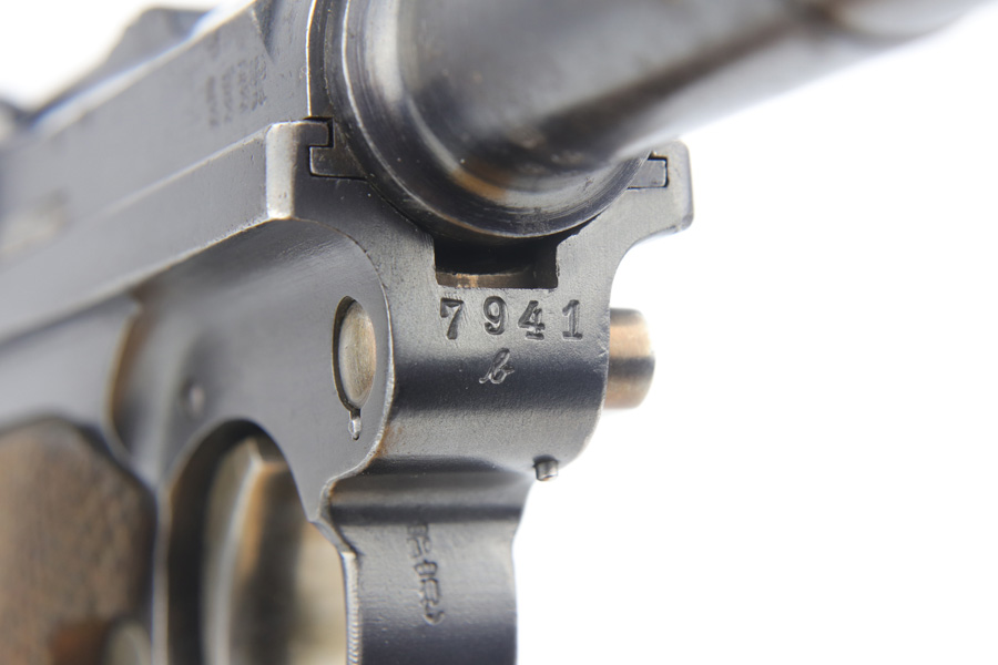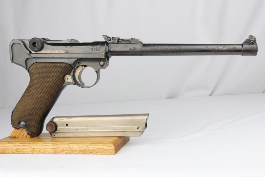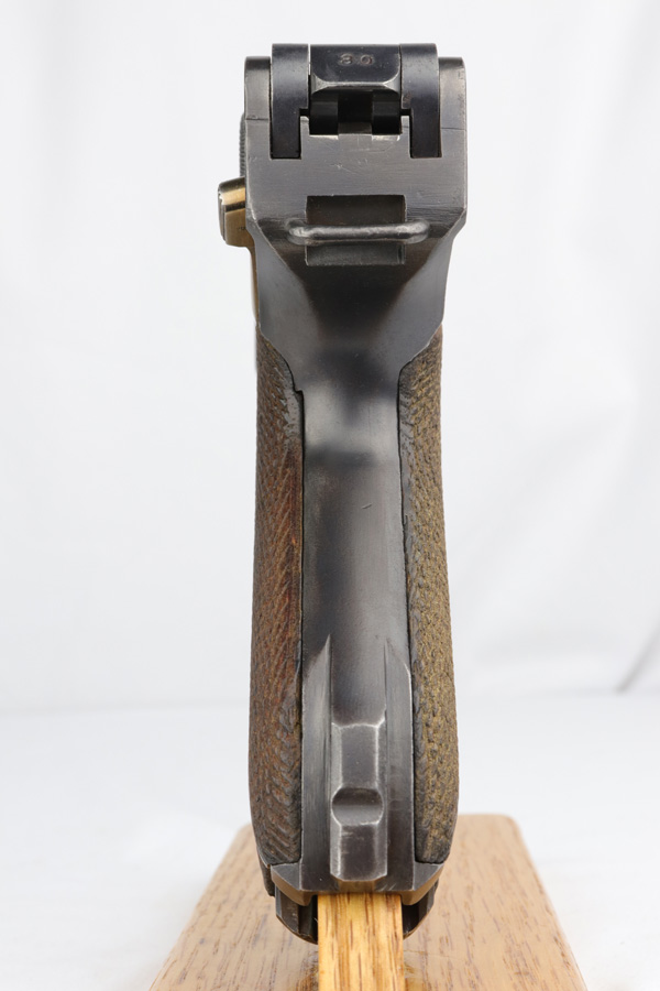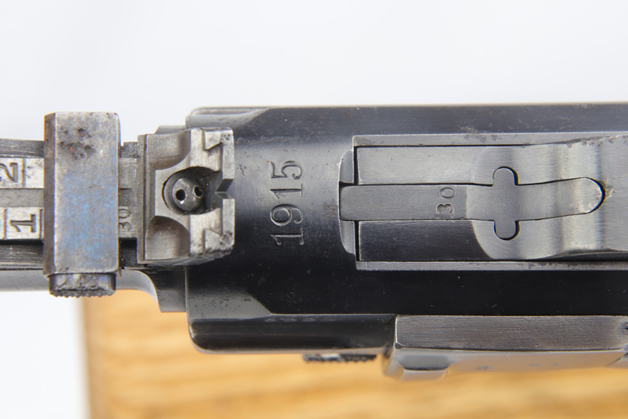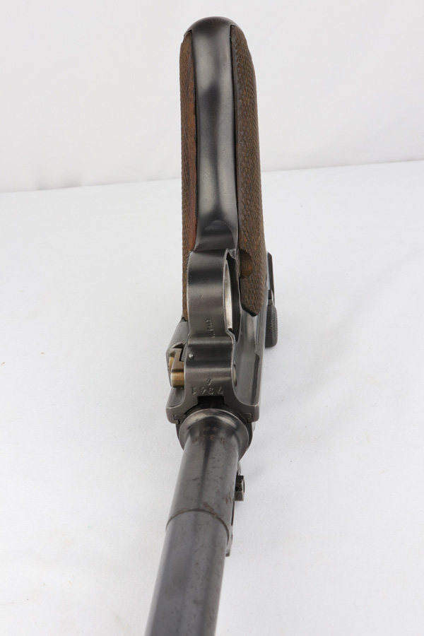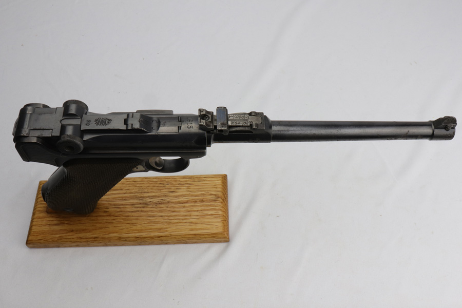 12/10/18 – This is a WW1 era Artillery Luger with matching Erfurt lower and matching DWM upper. The bluing shows only minor finish loss, but there is a fair amount of pitting on the upper, especially the barrel. Small parts show very nice straw. Mismatched grips. Wood bottom magazine with police style numbering and a chip in it. Bore shows minor frosting but decent overall with good rifling, and should still fire just fine.