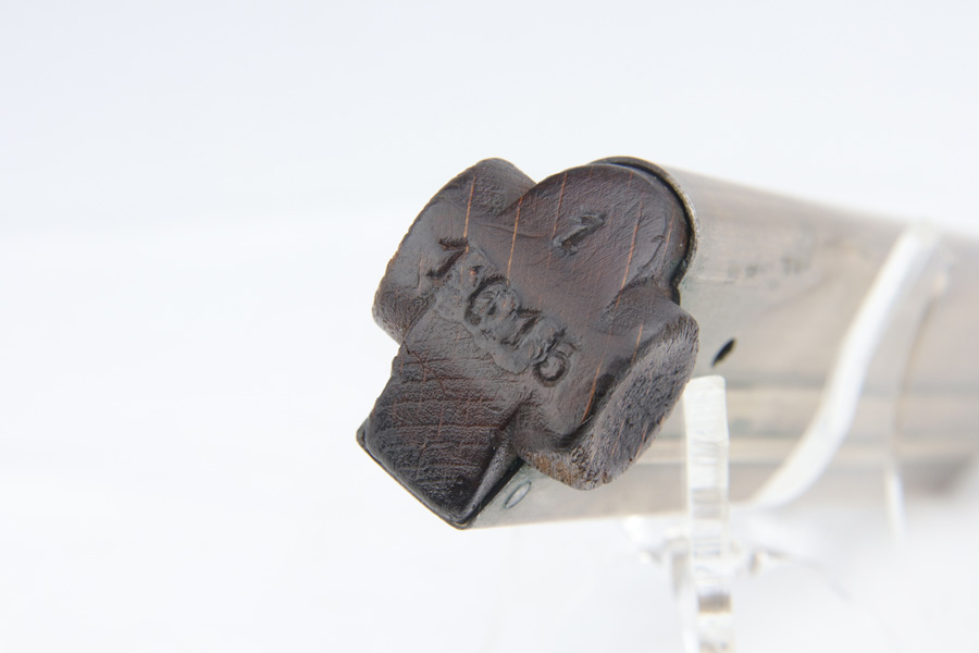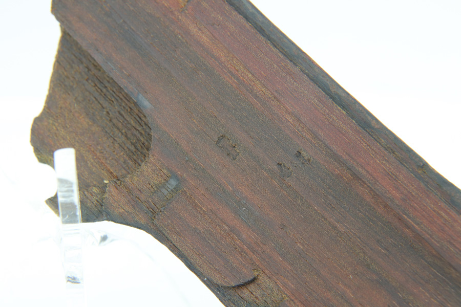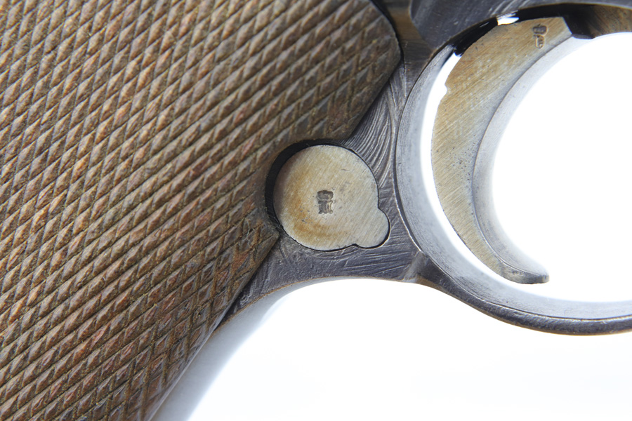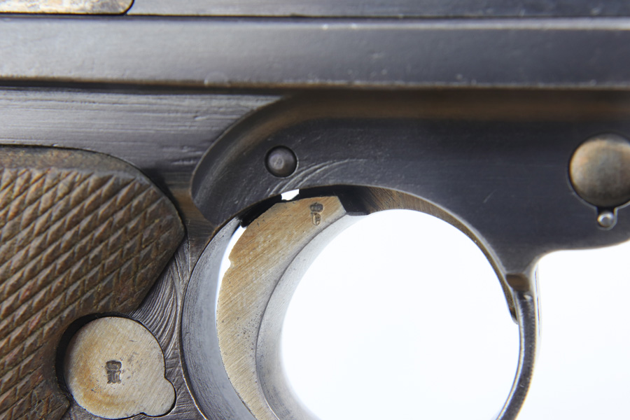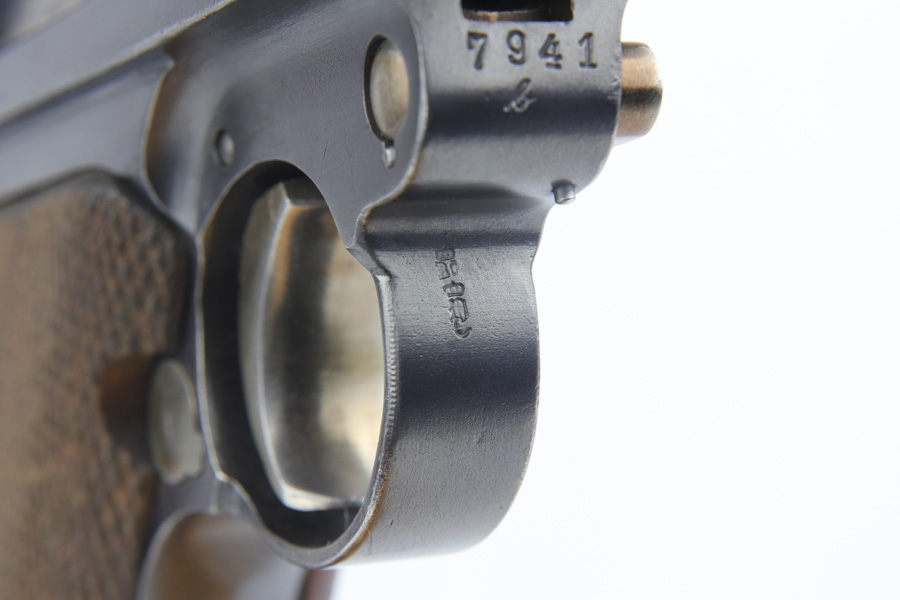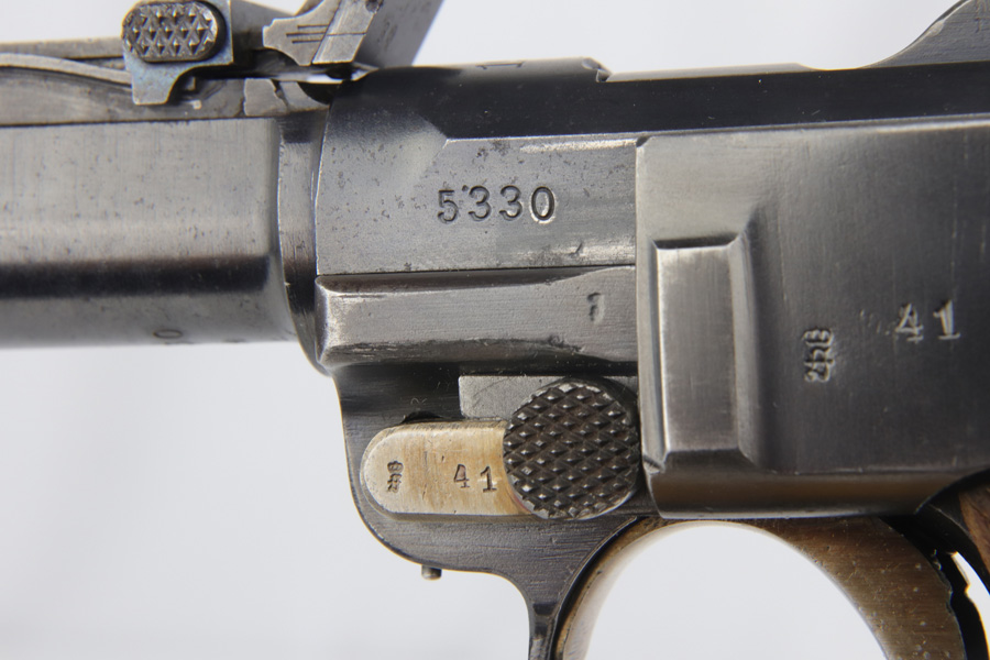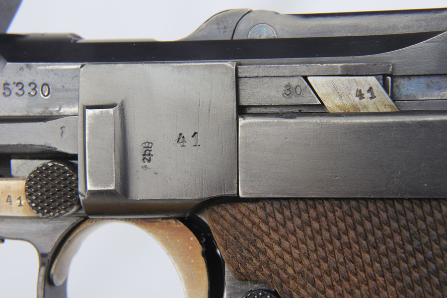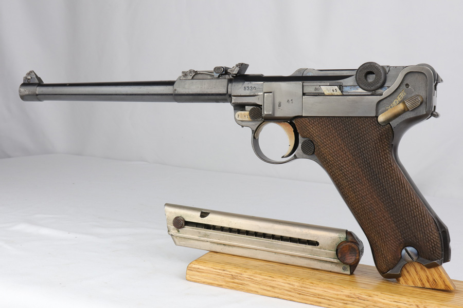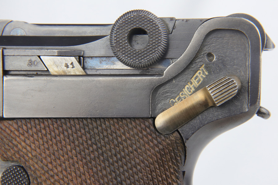 12/10/18 – This is a WW1 era Artillery Luger with matching Erfurt lower and matching DWM upper. The bluing shows only minor finish loss, but there is a fair amount of pitting on the upper, especially the barrel. Small parts show very nice straw. Mismatched grips. Wood bottom magazine with police style numbering and a chip in it. Bore shows minor frosting but decent overall with good rifling, and should still fire just fine.