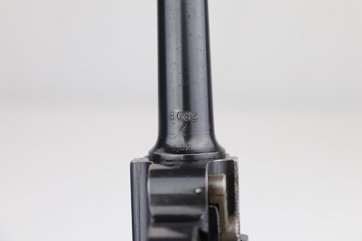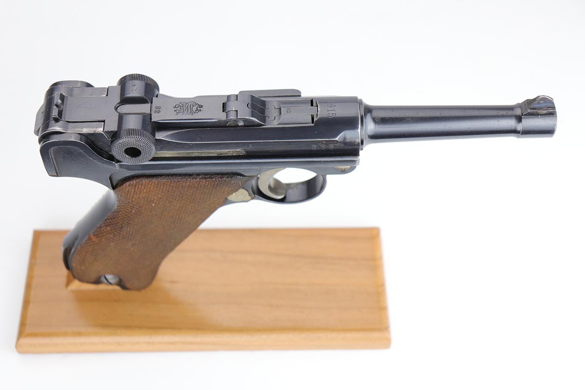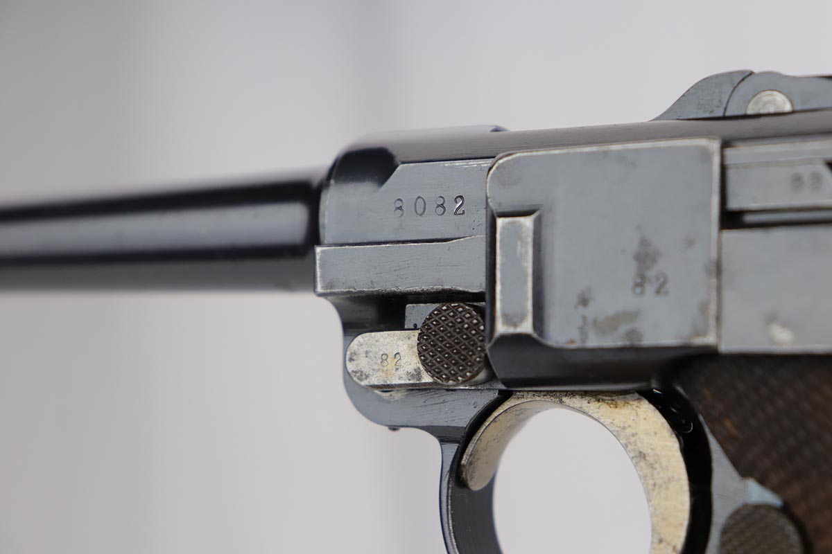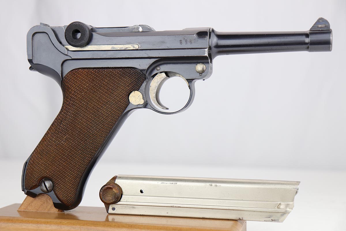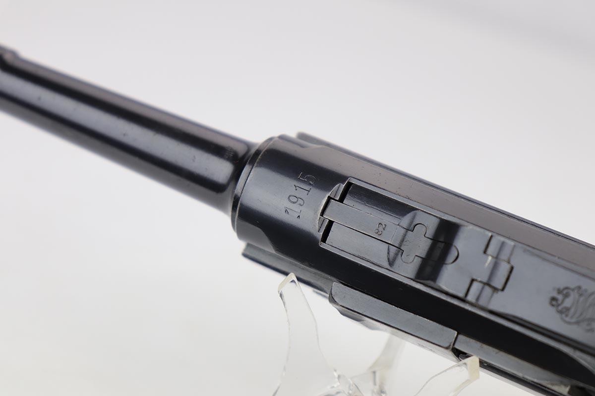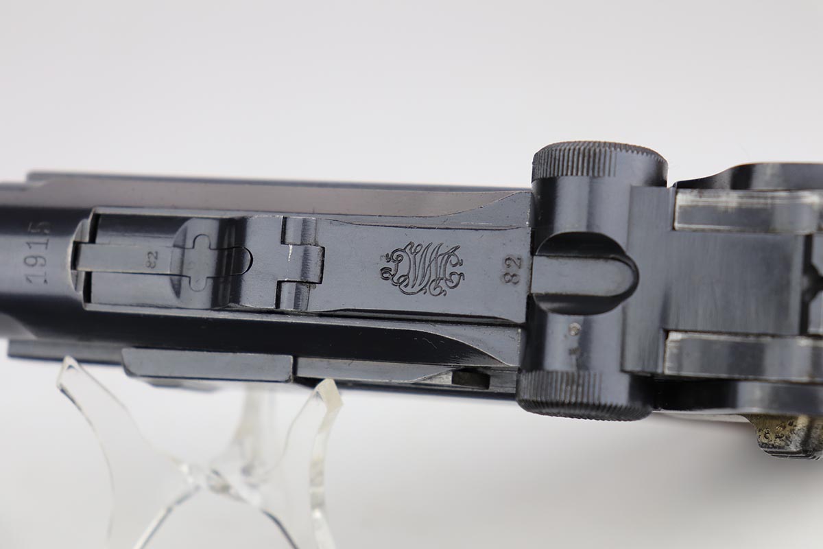 10/18/19 – This is an excellent example of an all matching and original DWM Luger from 1915. The bluing rates at about 95% with standard high edge wear, a few areas of finish loss on the left side of the frame, and some pinpricking on the sideplate. The original matching grips are present and in terrific shape, with no major defects. Strong, shiny bore. Period original but mismatched magazine.