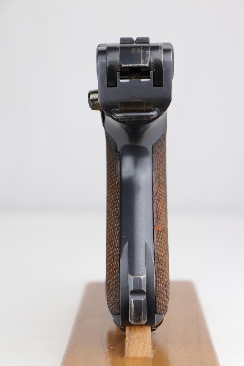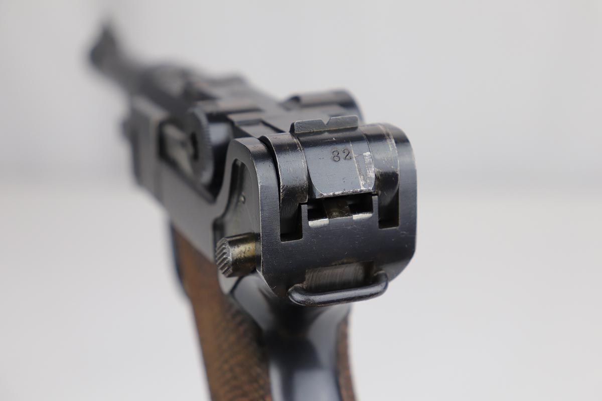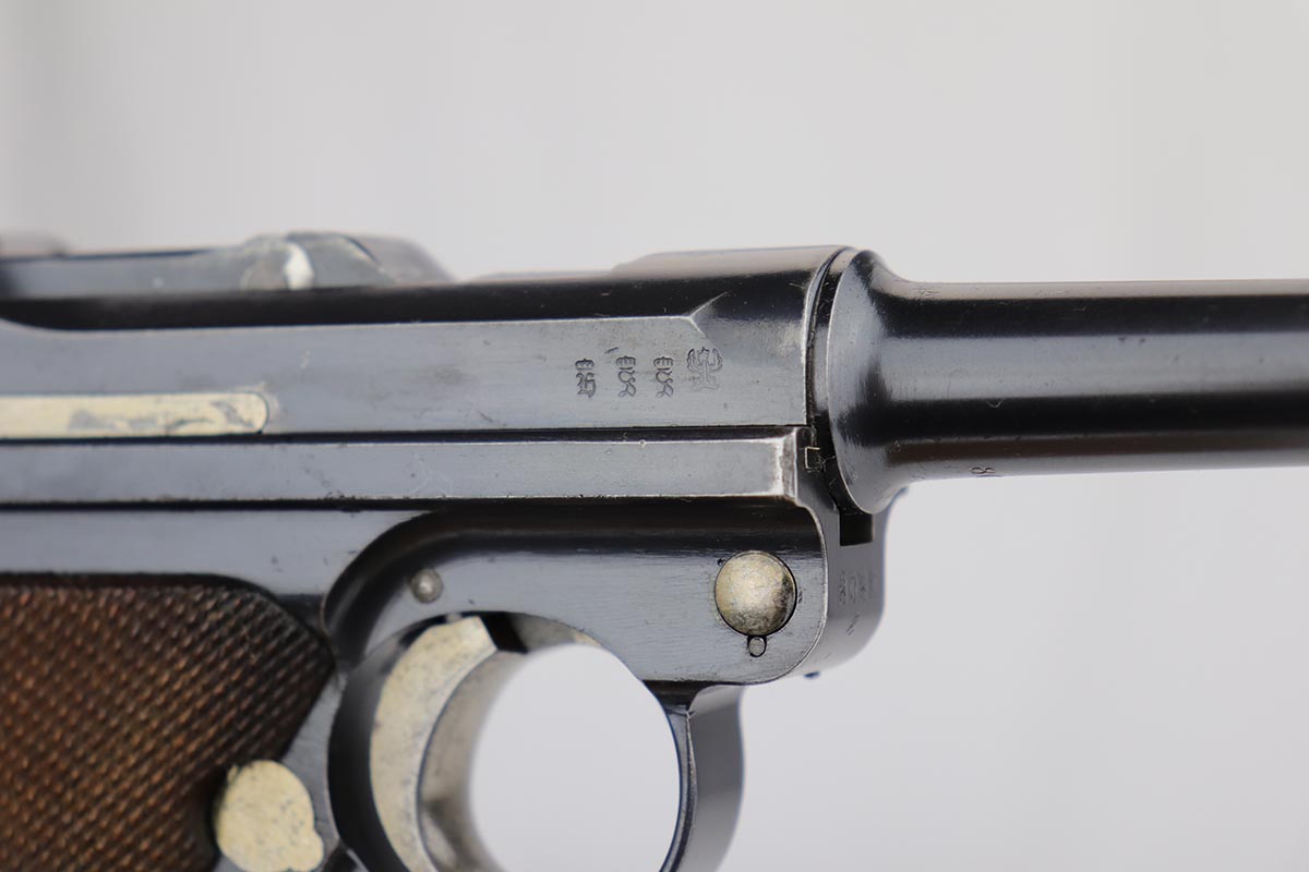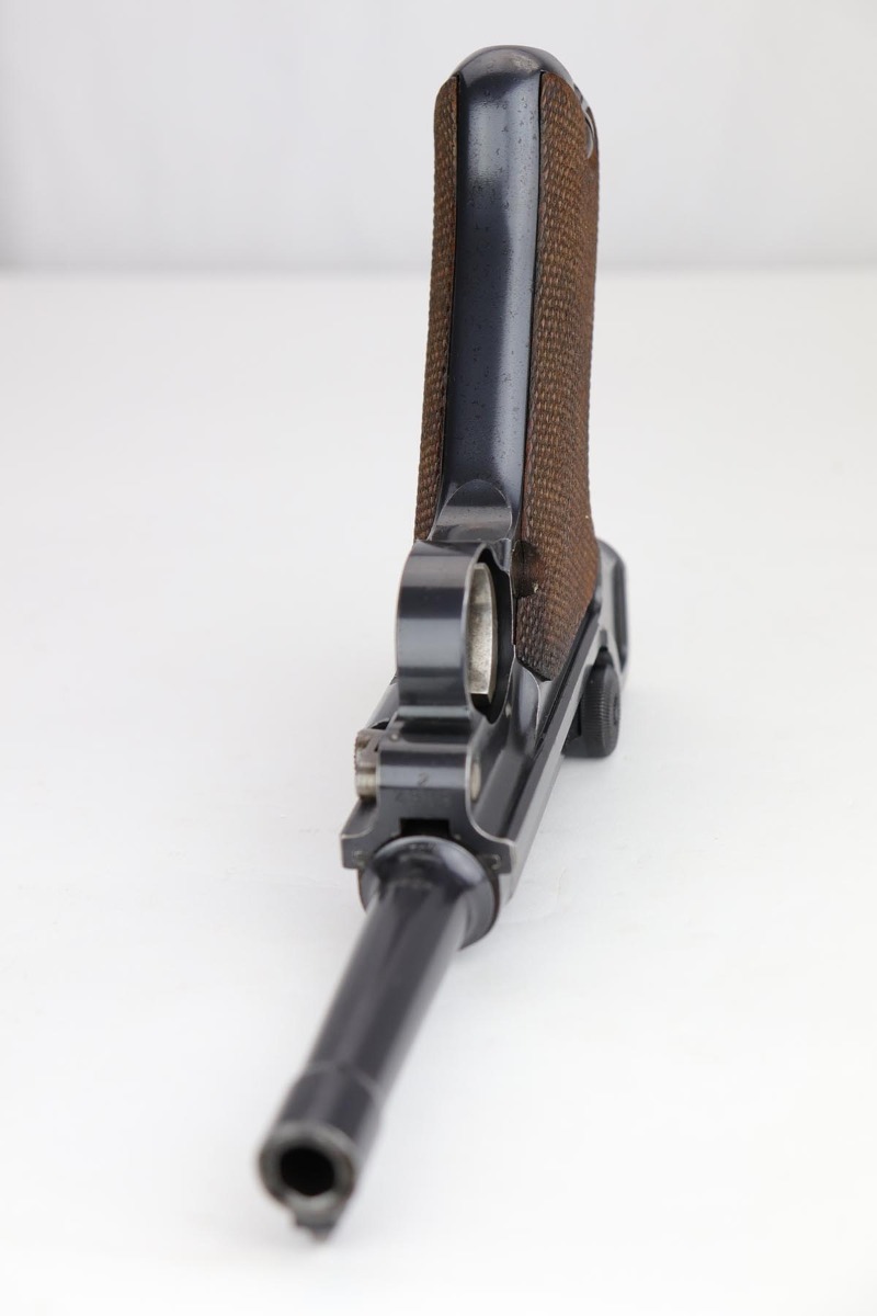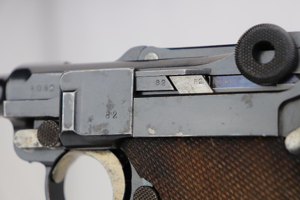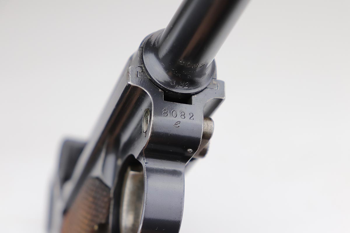 10/18/19 – This is an excellent example of an all matching and original DWM Luger from 1915. The bluing rates at about 95% with standard high edge wear, a few areas of finish loss on the left side of the frame, and some pinpricking on the sideplate. The original matching grips are present and in terrific shape, with no major defects. Strong, shiny bore. Period original but mismatched magazine.
