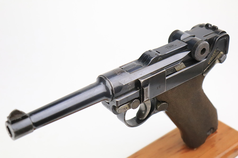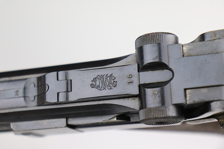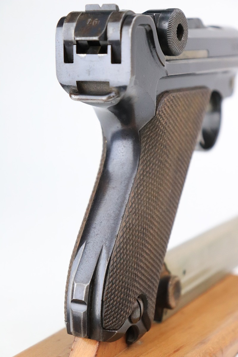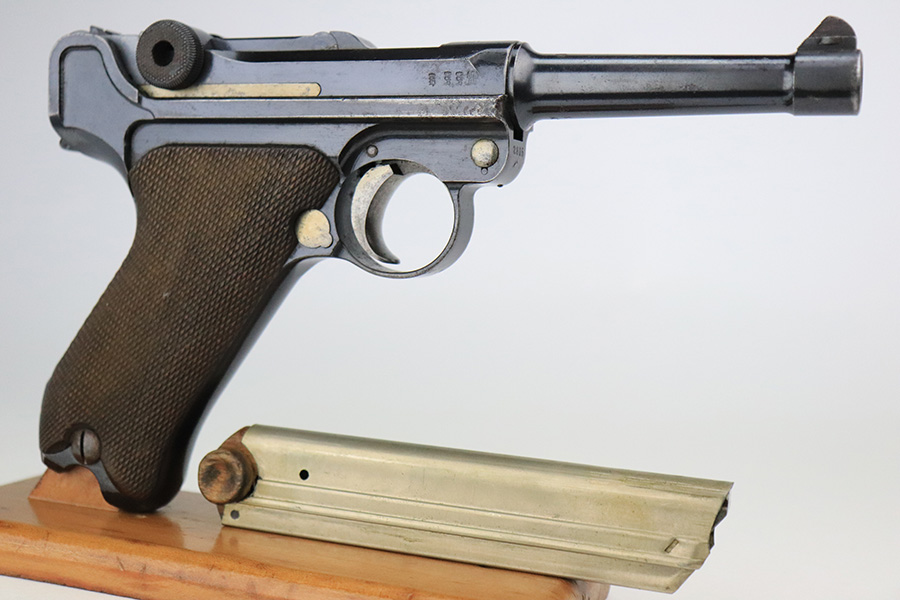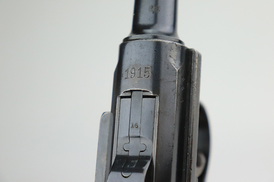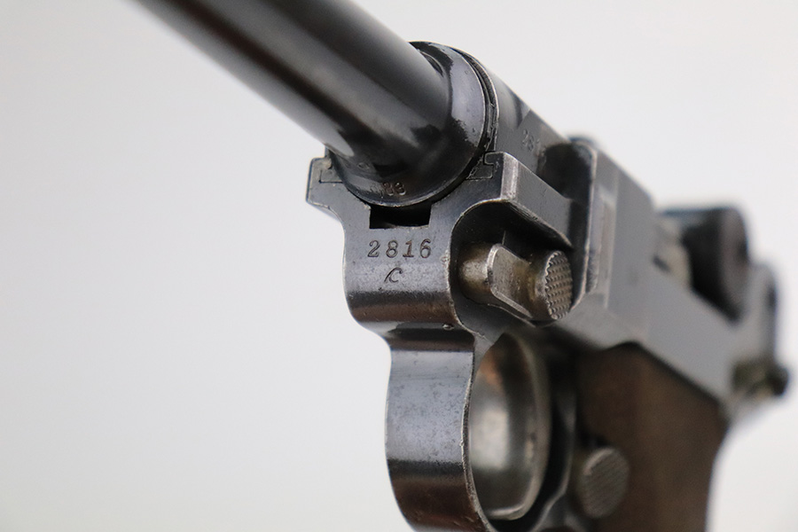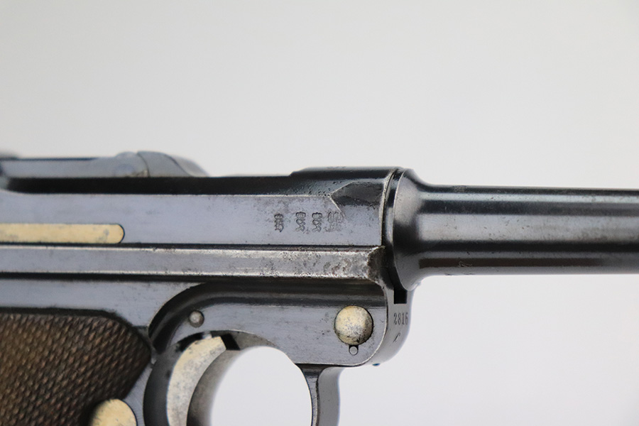 7/14/22 – This is a very nice example of a DWM Luger issued to the Imperial German military in 1915. It is all matching and has the proper Imperial proofs. It has retained about 94% of its original bluing. There are areas of wear on the side plate, side rails, and around the muzzle. While there isn’t a ton of actual finish loss, there areas of spotty oxidation here and there and areas of pitting at the front edge of the right side of the frame and on the underside of the trigger guard. Freckling on both grip straps and along the barrel. Comes with matching-numbered wood grips and a mismatched magazine (two chips in the mag bottom). The rifling in the bore is a little worn with tiny pits throughout.
