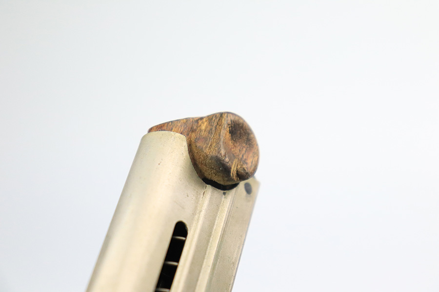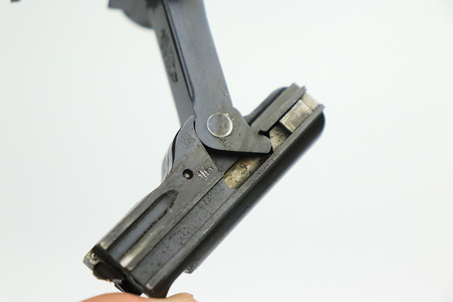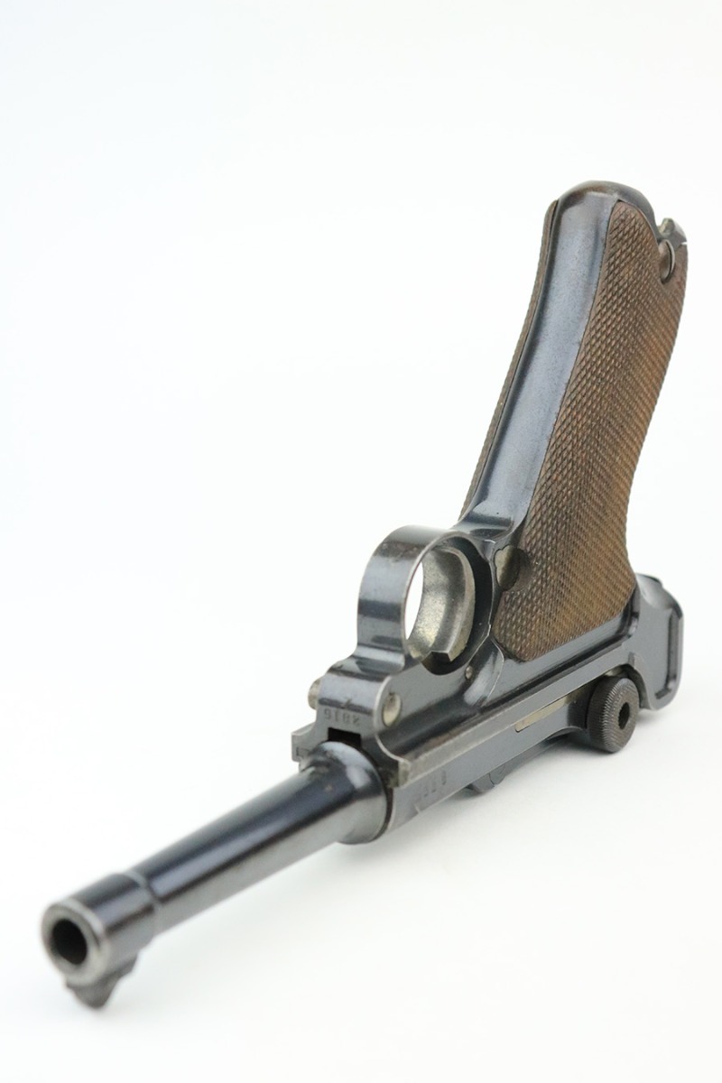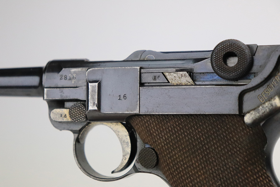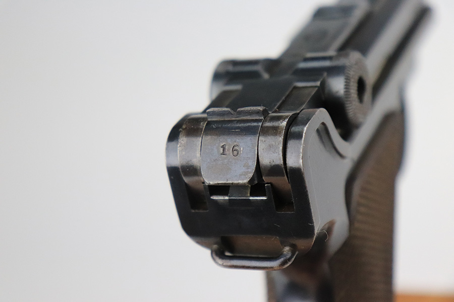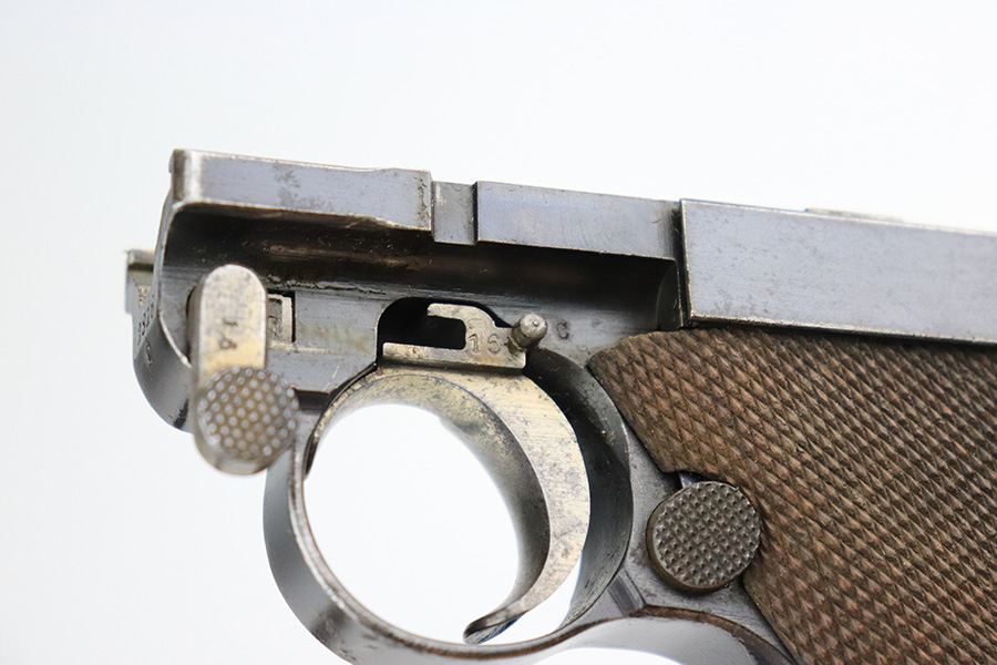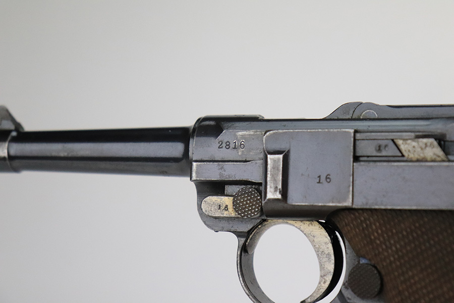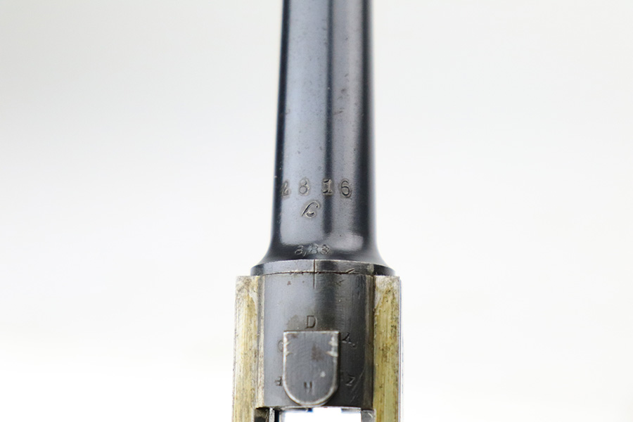 7/14/22 – This is a very nice example of a DWM Luger issued to the Imperial German military in 1915. It is all matching and has the proper Imperial proofs. It has retained about 94% of its original bluing. There are areas of wear on the side plate, side rails, and around the muzzle. While there isn’t a ton of actual finish loss, there areas of spotty oxidation here and there and areas of pitting at the front edge of the right side of the frame and on the underside of the trigger guard. Freckling on both grip straps and along the barrel. Comes with matching-numbered wood grips and a mismatched magazine (two chips in the mag bottom). The rifling in the bore is a little worn with tiny pits throughout.