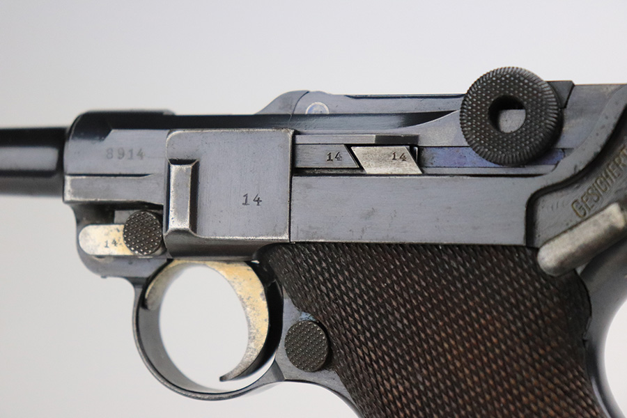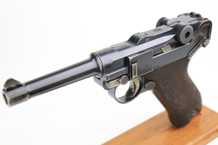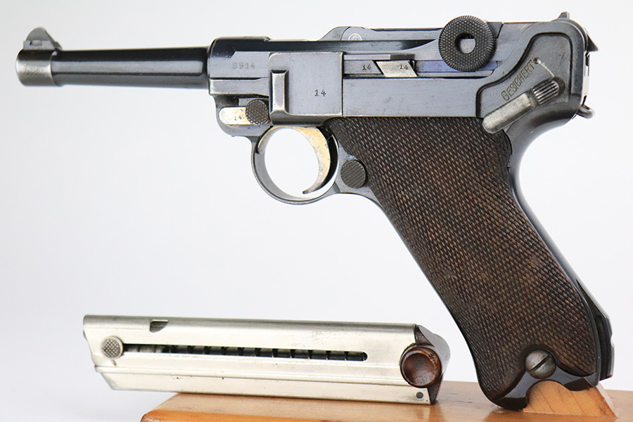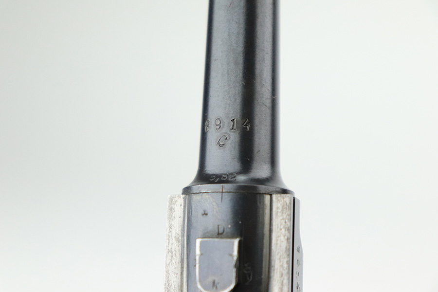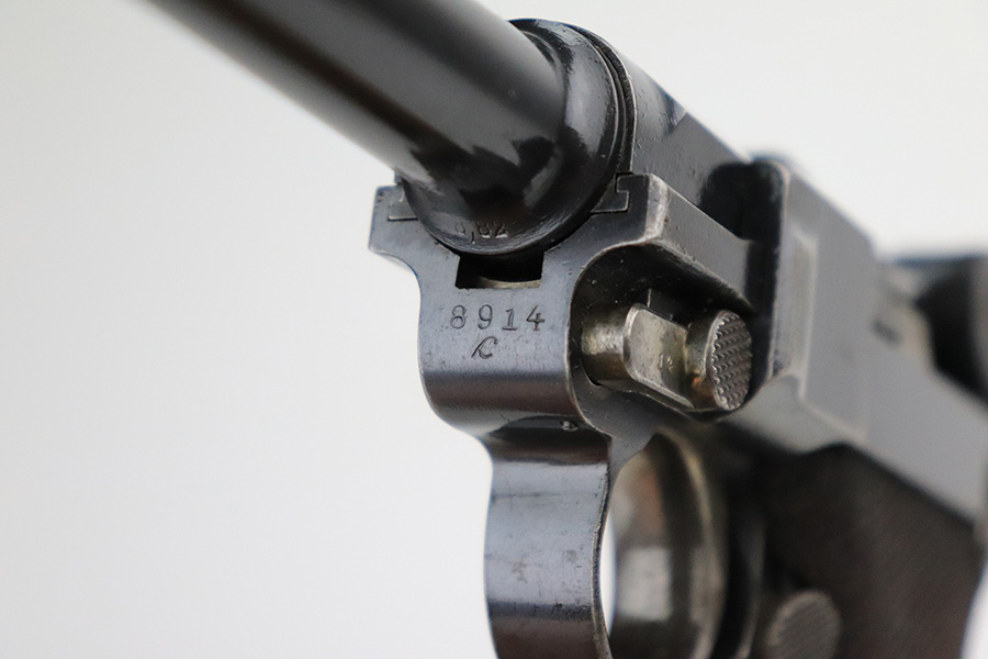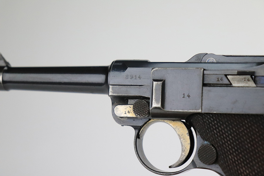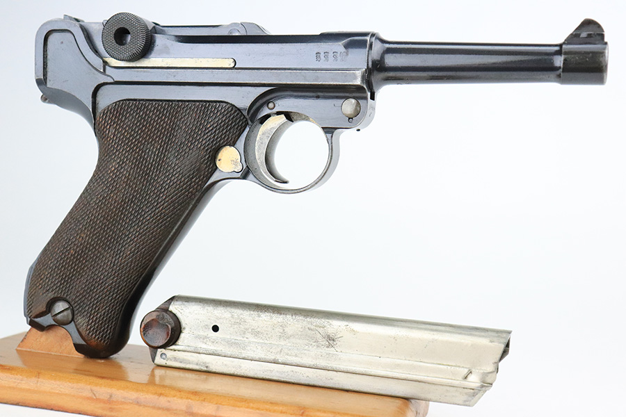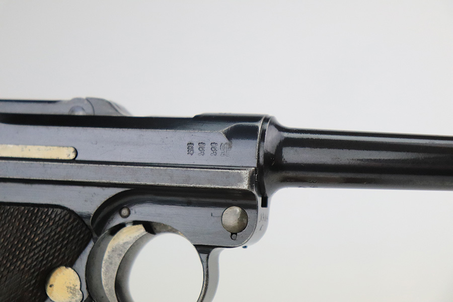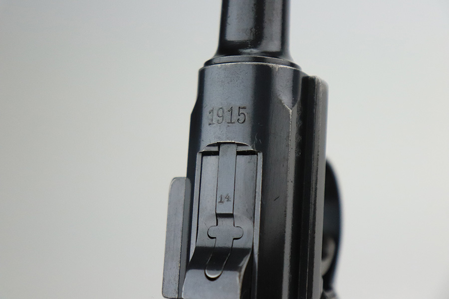 7/13/22 – This is an excellent example of a DWM Luger issued to the Imperial German military in 1915. It is all matching, has the proper Imperial military acceptance proofs, and comes with one original matching-numbered magazine. It has retained about 96% of its original finish. There are areas of minor wear on the side plate, side rails, around the muzzle, and at the base of the grip straps. Tiny dots of oxidation here and there. Some pin-pricking around the muzzle. Light brown patina and very light freckling on the grip straps. Comes with nice wood grips – the right panel is numbered and matching, the left is un-numbered. The rifling in the bore is worn with pin-pricking throughout.