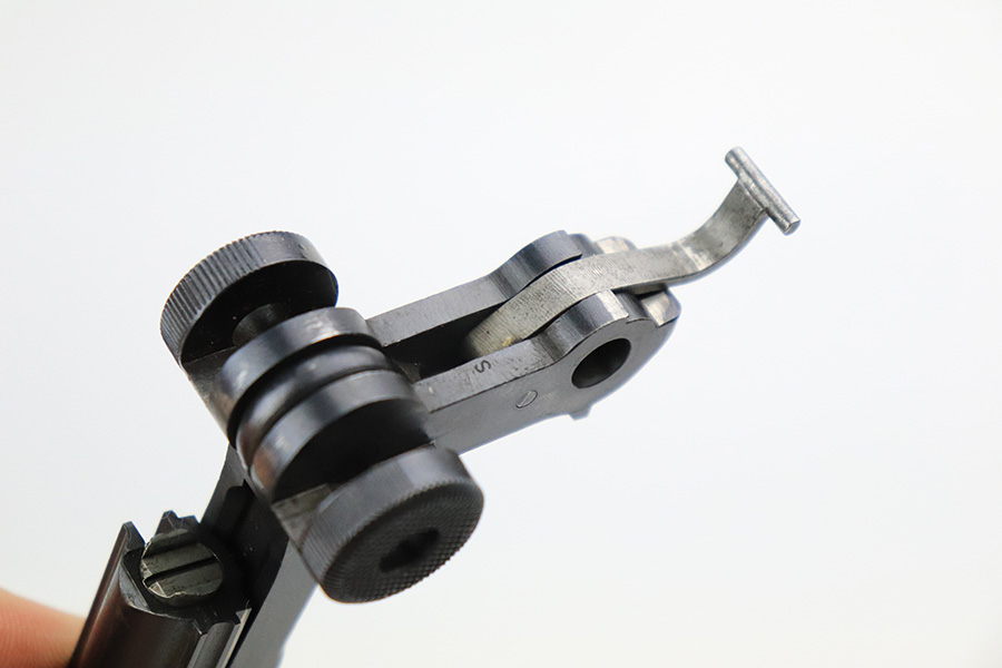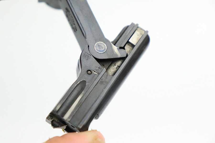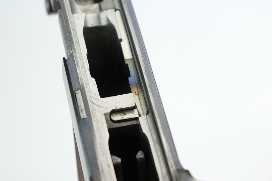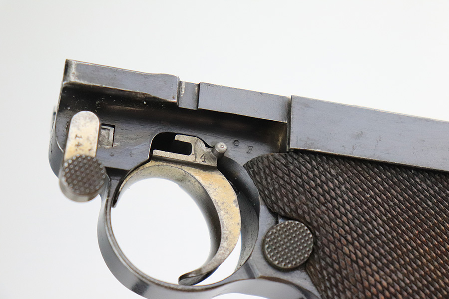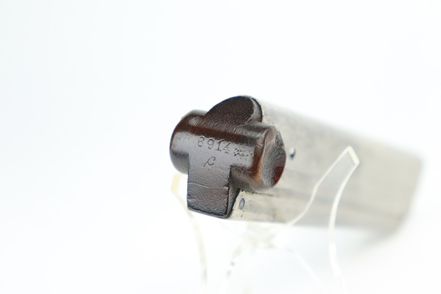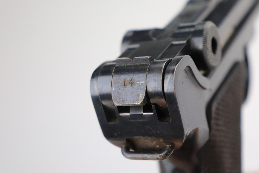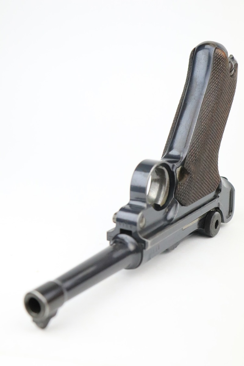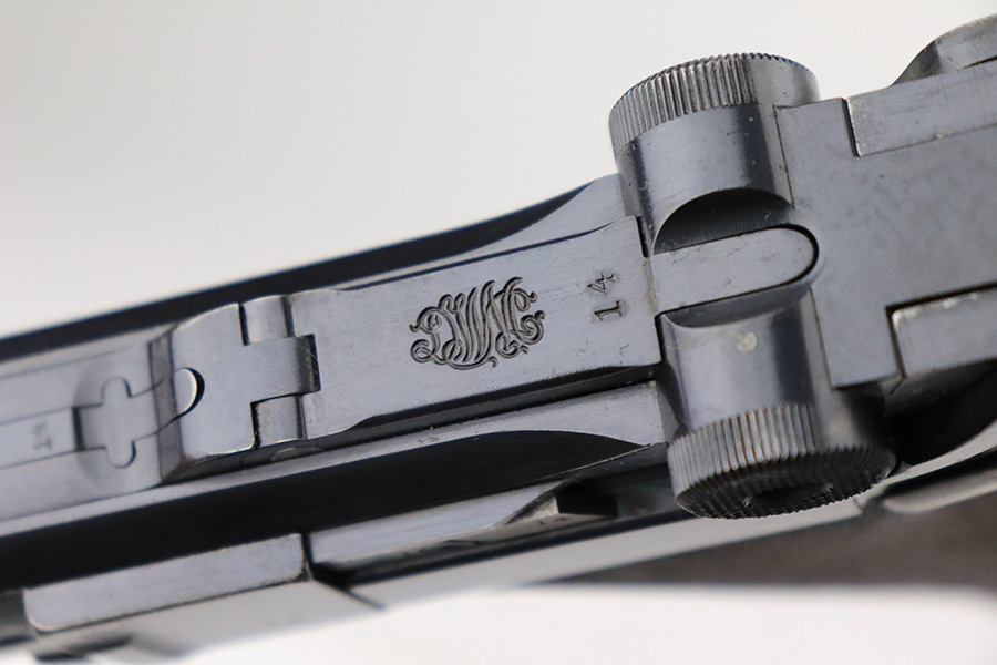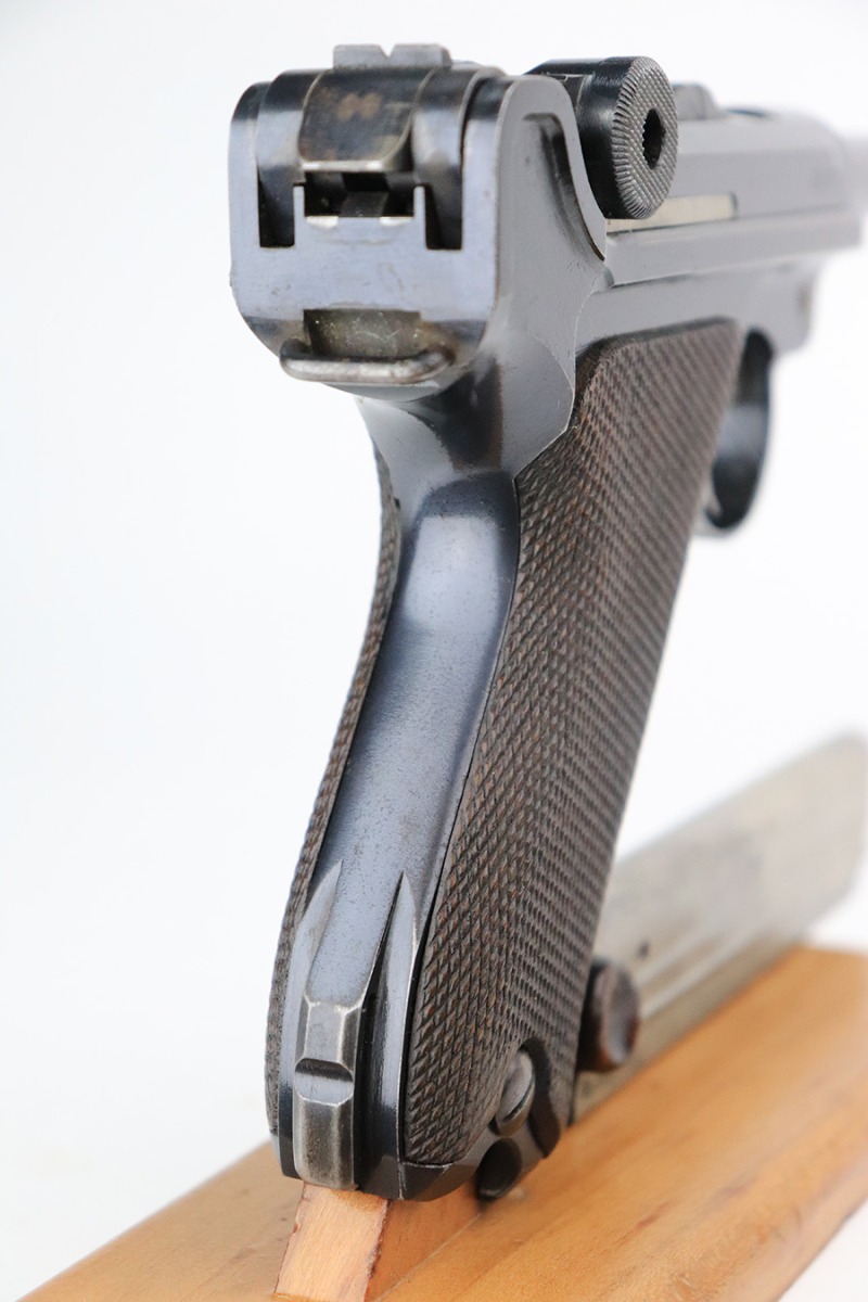 7/13/22 – This is an excellent example of a DWM Luger issued to the Imperial German military in 1915. It is all matching, has the proper Imperial military acceptance proofs, and comes with one original matching-numbered magazine. It has retained about 96% of its original finish. There are areas of minor wear on the side plate, side rails, around the muzzle, and at the base of the grip straps. Tiny dots of oxidation here and there. Some pin-pricking around the muzzle. Light brown patina and very light freckling on the grip straps. Comes with nice wood grips – the right panel is numbered and matching, the left is un-numbered. The rifling in the bore is worn with pin-pricking throughout.