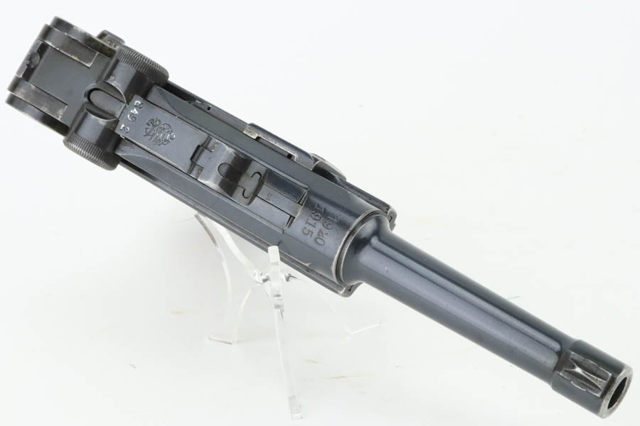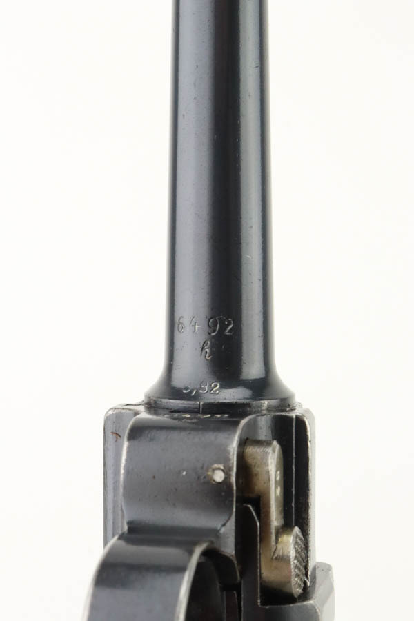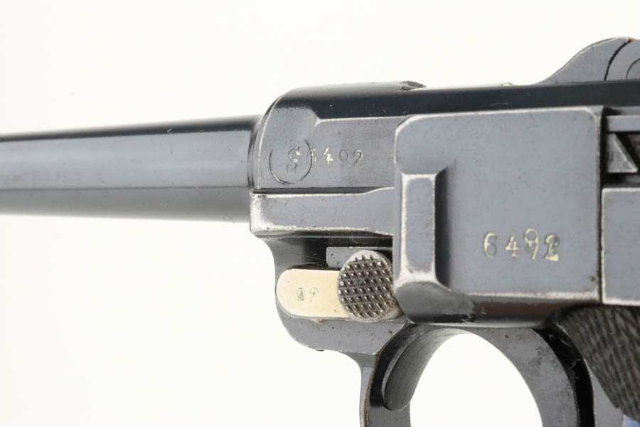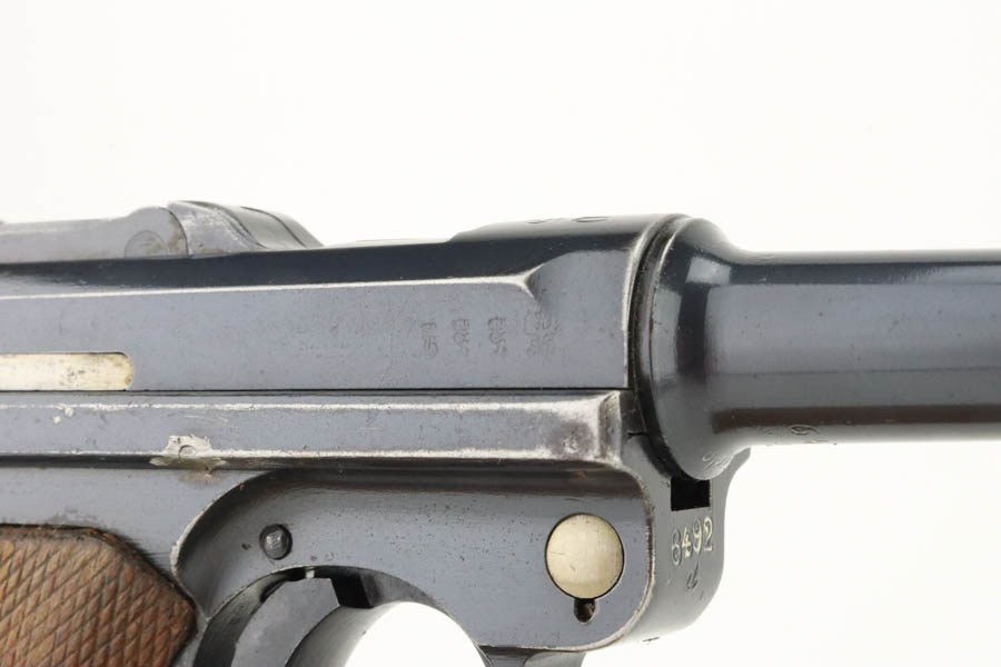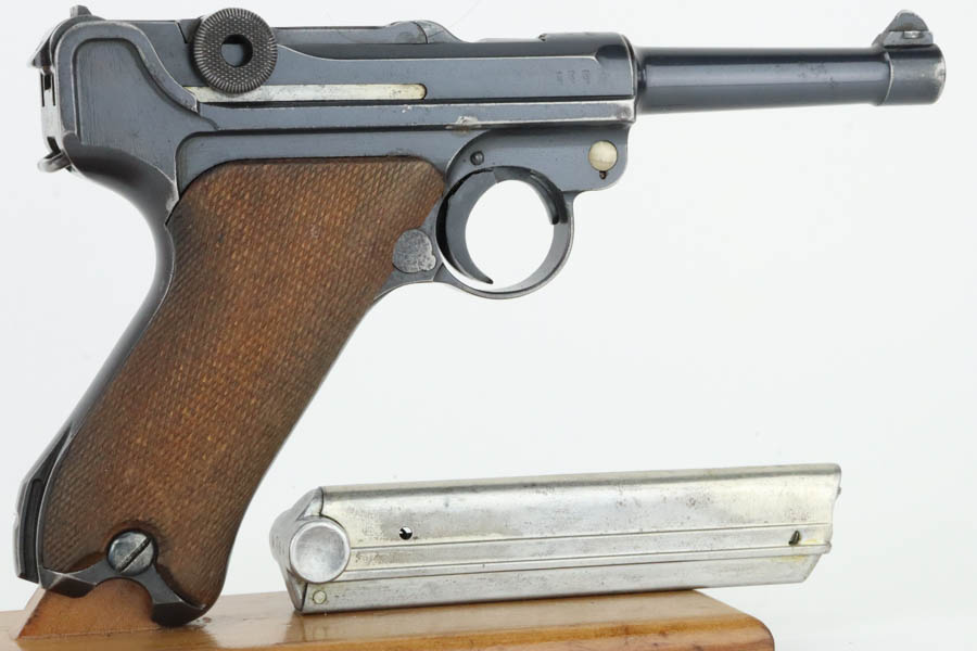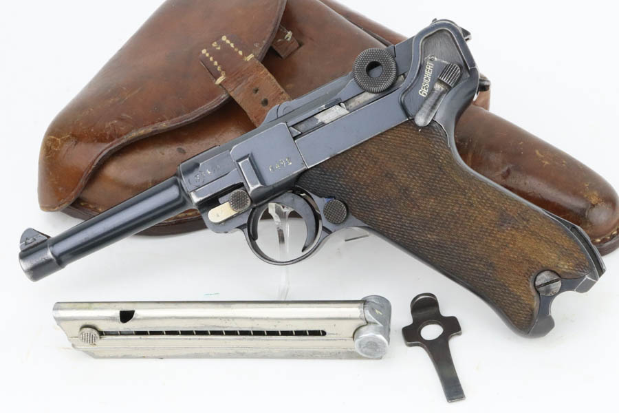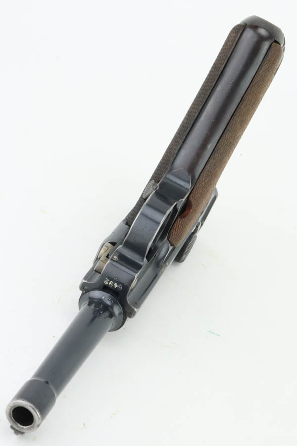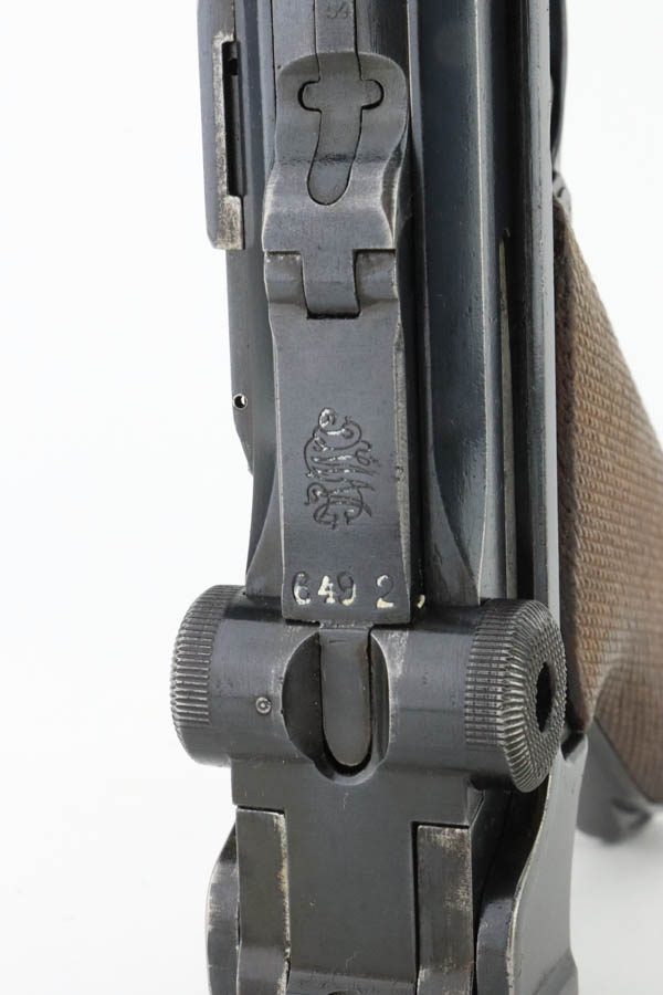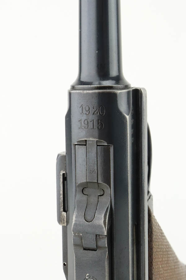 5/31/24 – This is a DWM Luger that was originally issued to the Imperial German military in 1915. It was later reworked and issued to the police. There is a “1920” government property marking on the chamber, tapped for a police sear safety (has been removed), and a unit marking on the back of the frame. There is also a “Circle S” marking on the left side of the slide. Some of the small parts are mismatched, and many of the parts have been re-numbered to match. Comes as a rig with a 1916-dated holster, a blank luger tool, and a police arsenal-numbered but mismatched magazine. The finish rates about 94-95% with minor muzzle and high edge wear. Fitted with mismatched wood grips. The bore shows pitting throughout.