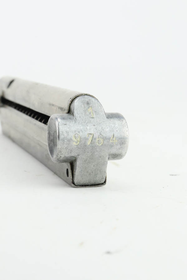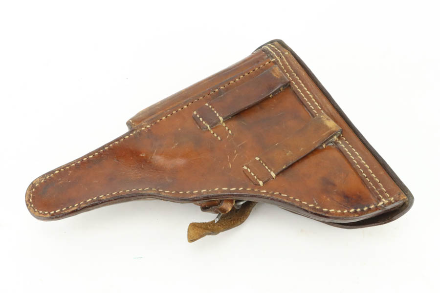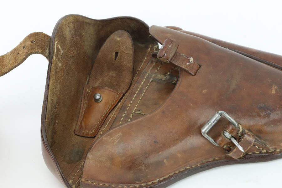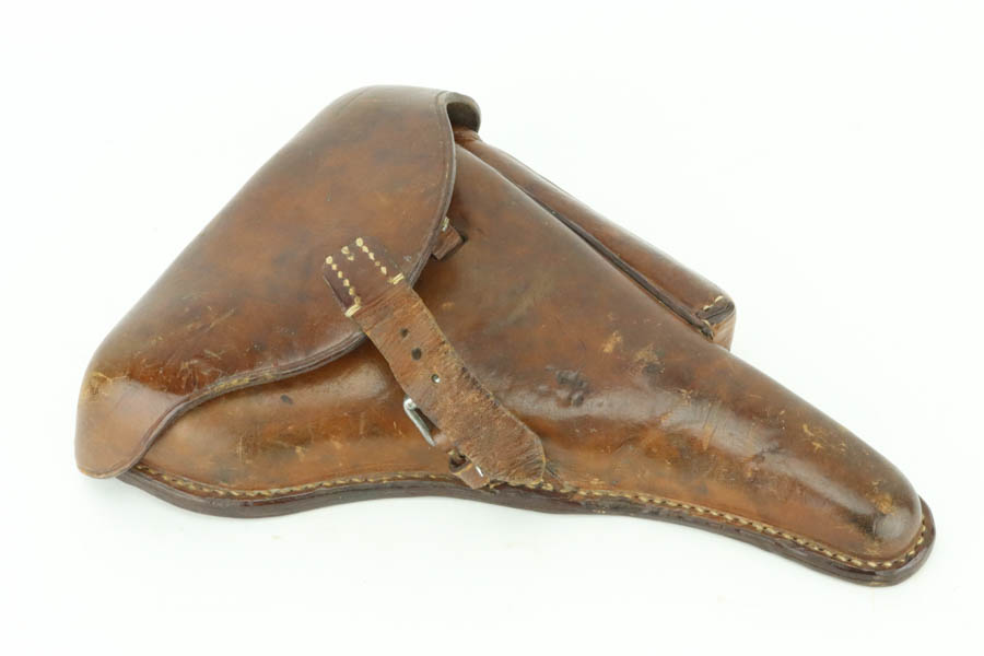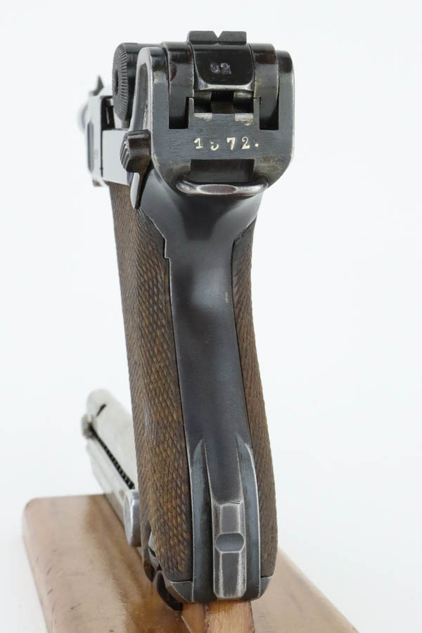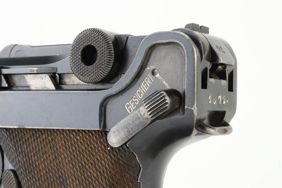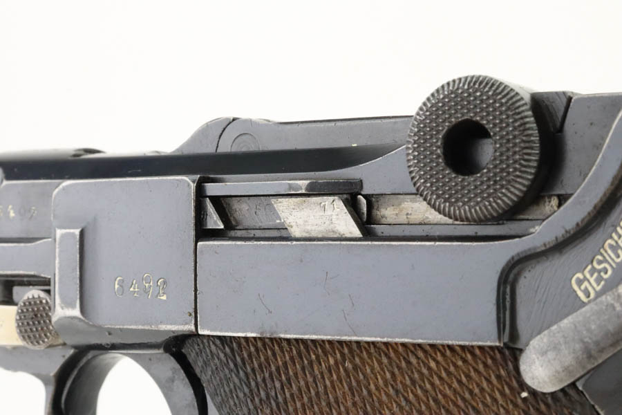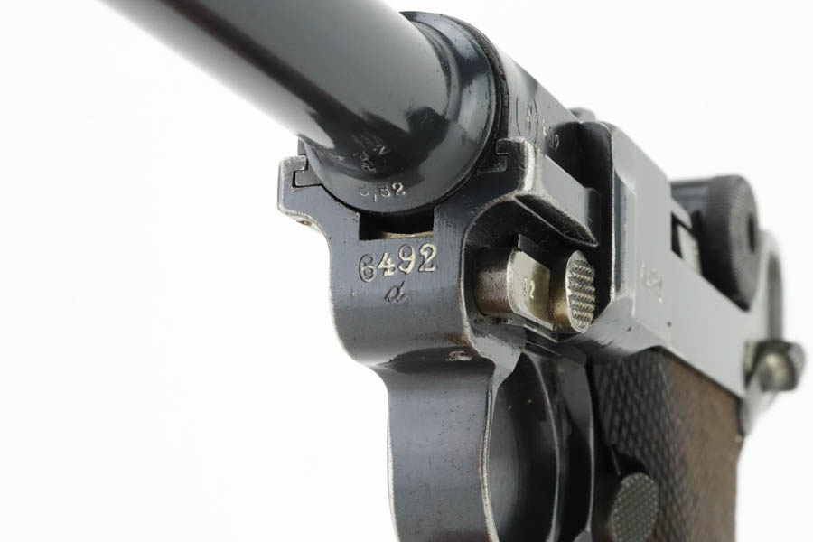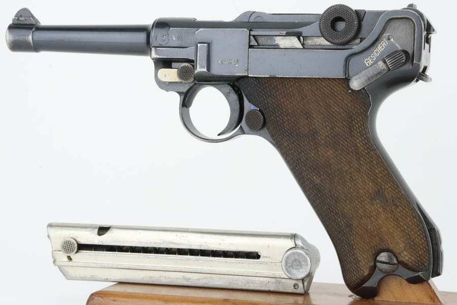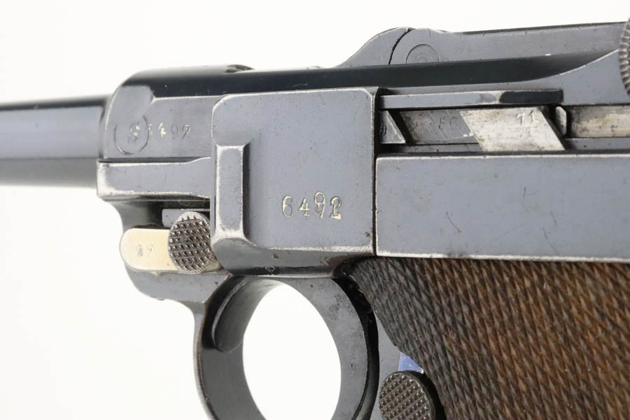 5/31/24 – This is a DWM Luger that was originally issued to the Imperial German military in 1915. It was later reworked and issued to the police. There is a “1920” government property marking on the chamber, tapped for a police sear safety (has been removed), and a unit marking on the back of the frame. There is also a “Circle S” marking on the left side of the slide. Some of the small parts are mismatched, and many of the parts have been re-numbered to match. Comes as a rig with a 1916-dated holster, a blank luger tool, and a police arsenal-numbered but mismatched magazine. The finish rates about 94-95% with minor muzzle and high edge wear. Fitted with mismatched wood grips. The bore shows pitting throughout.