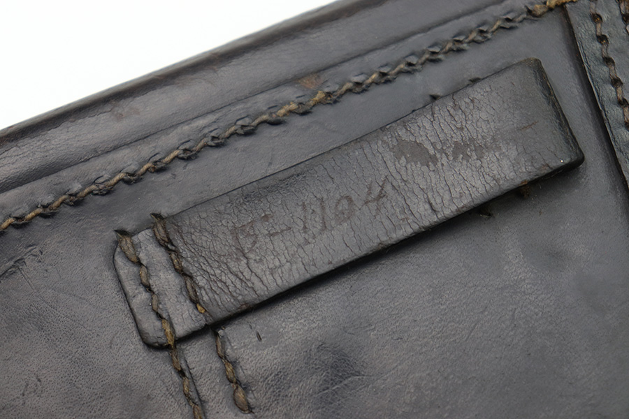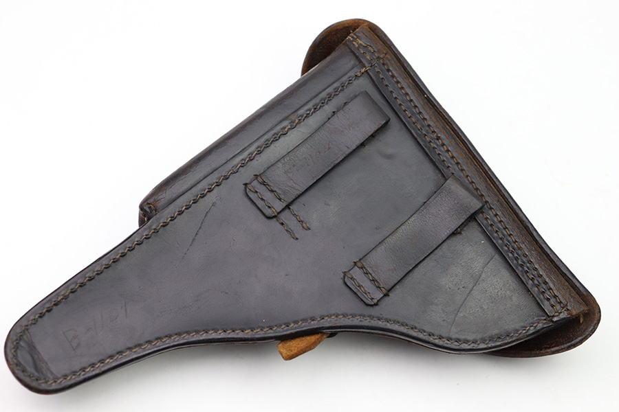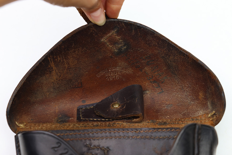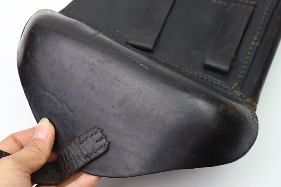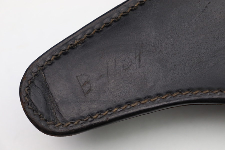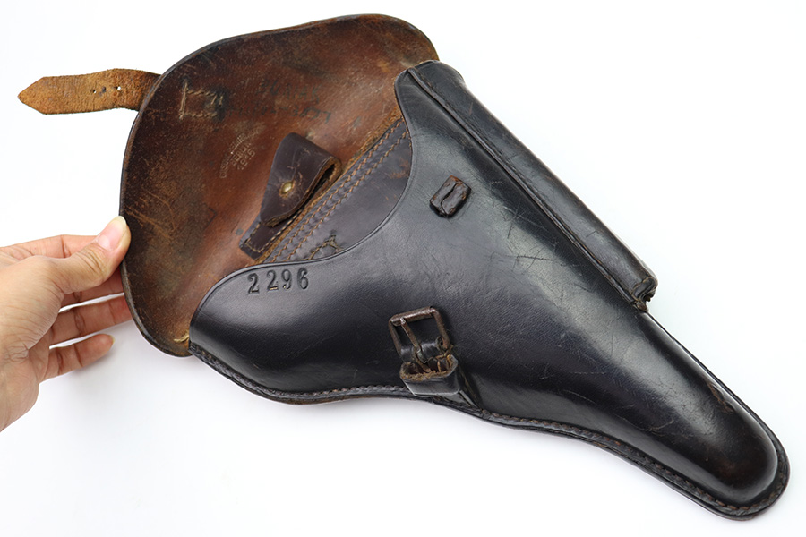 8/25/22 – This is an original WW1 Luger holster in great condition. The holster is maker stamped and dated on the interior lid with crisp markings. There’s also a faint, square-shaped ink stamp on the interior leather that’s mostly faded and illegible. The front leather is unit or serial numbered “2296”. The leather has normal pliability and is in great shape for its age. There is some mild surface scratches and wrinkling on the closure strap but no deep cracks or issues. All original stitching is intact as well. A great example from WW1.