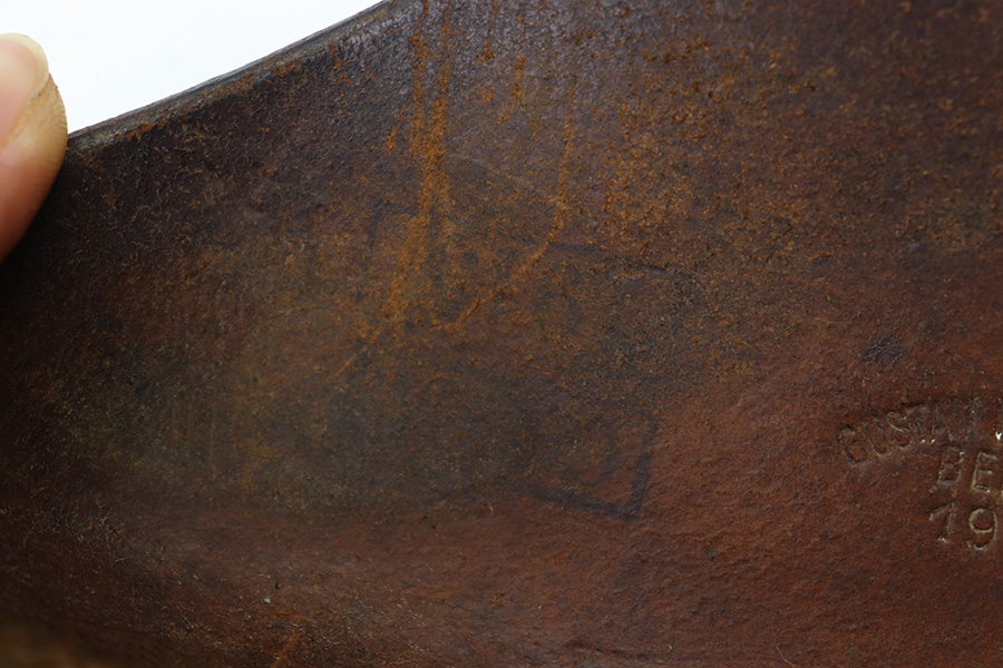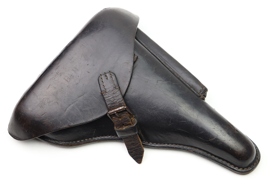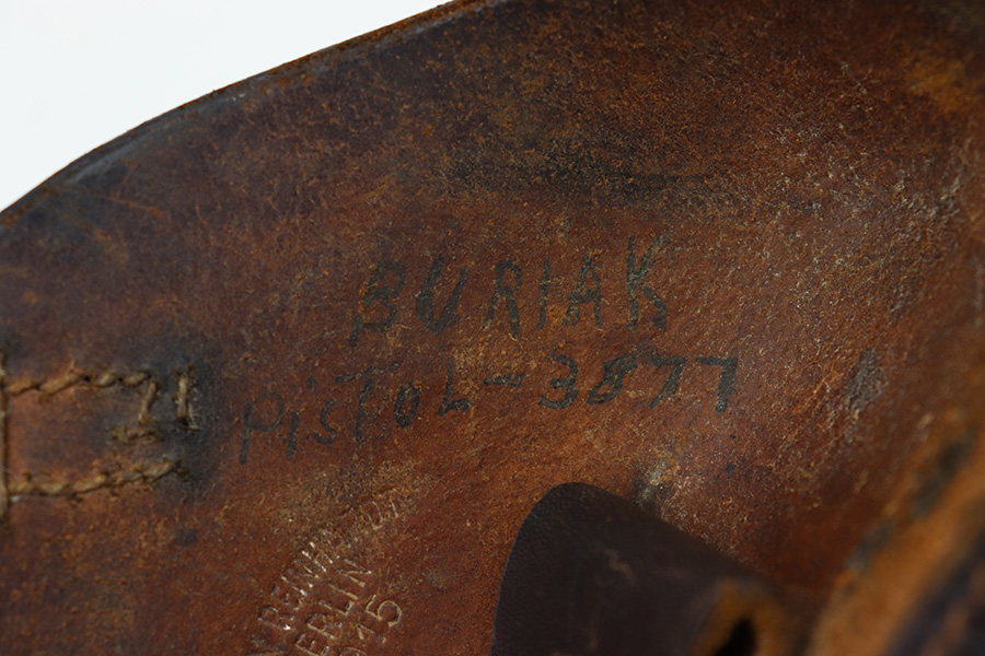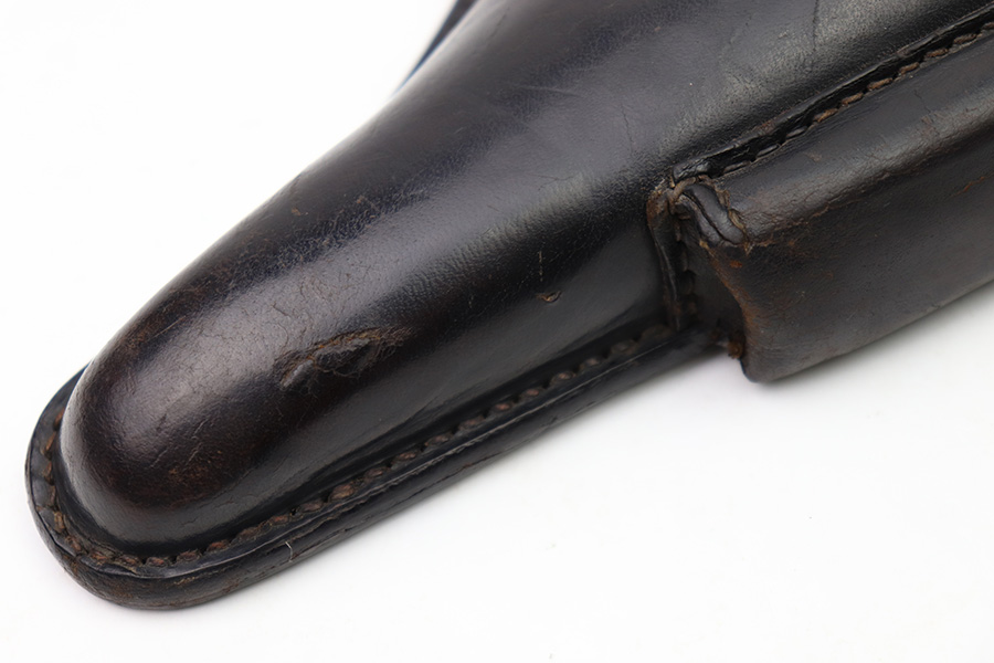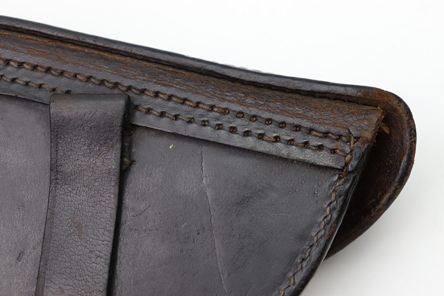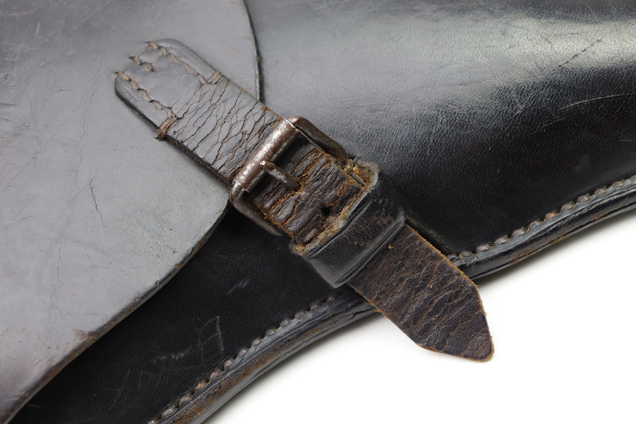 8/25/22 – This is an original WW1 Luger holster in great condition. The holster is maker stamped and dated on the interior lid with crisp markings. There’s also a faint, square-shaped ink stamp on the interior leather that’s mostly faded and illegible. The front leather is unit or serial numbered “2296”. The leather has normal pliability and is in great shape for its age. There is some mild surface scratches and wrinkling on the closure strap but no deep cracks or issues. All original stitching is intact as well. A great example from WW1.