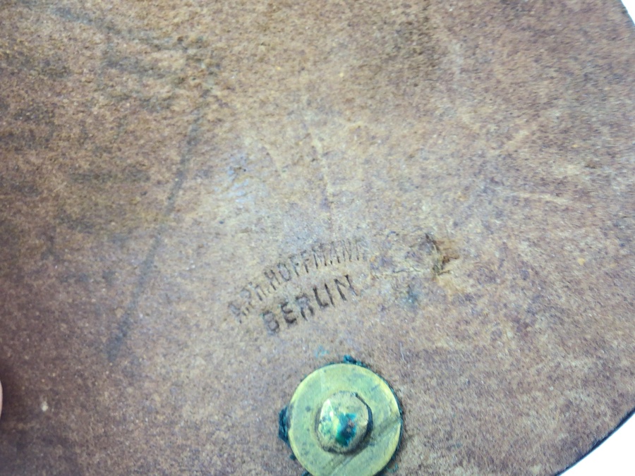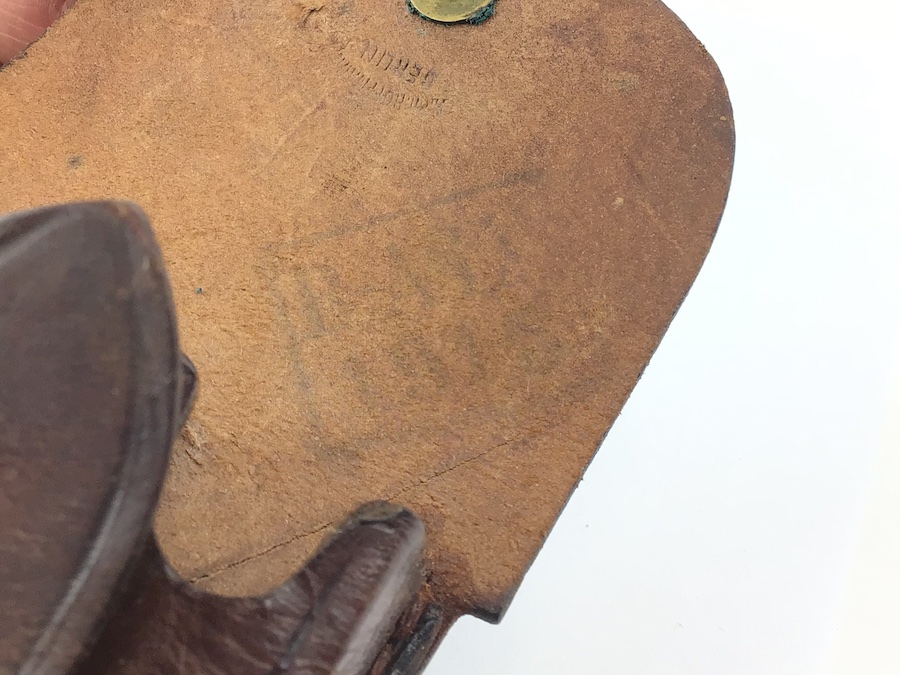 8/13/21 – This is an original WW1 era Luger magazine pouch. These were paired with artillery lugers, as part of the rig attached to the shoulder straps. The leather is in great overall condition with minor surface cracking on one side of the pouch. The interior lid is maker stamped “Hoffman” and a very faint ink stamp with what appears to be the date “1915”. The stitching is all original and in tact.