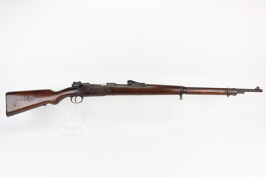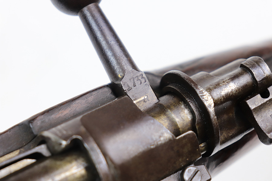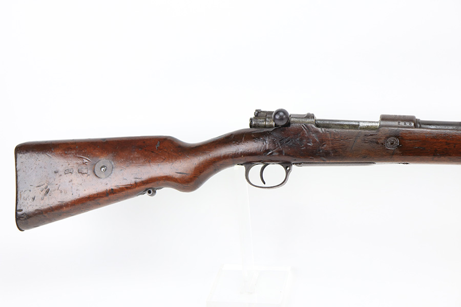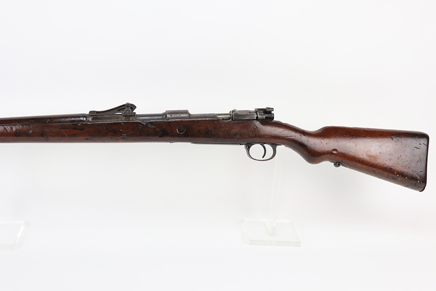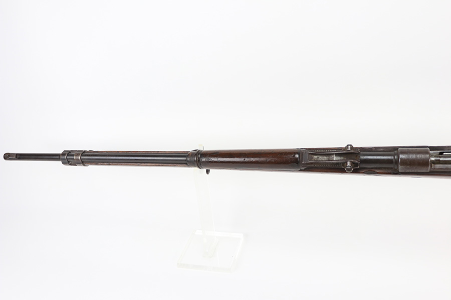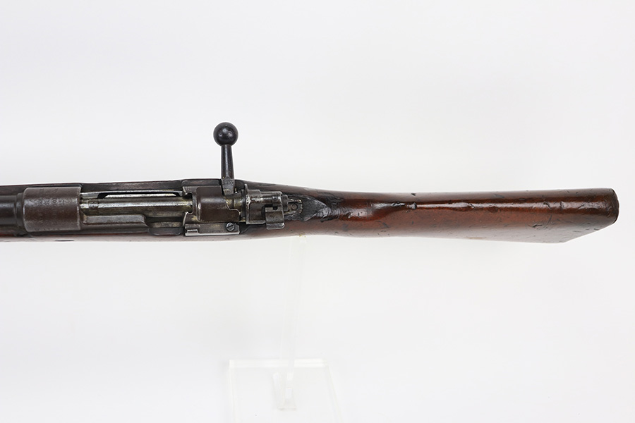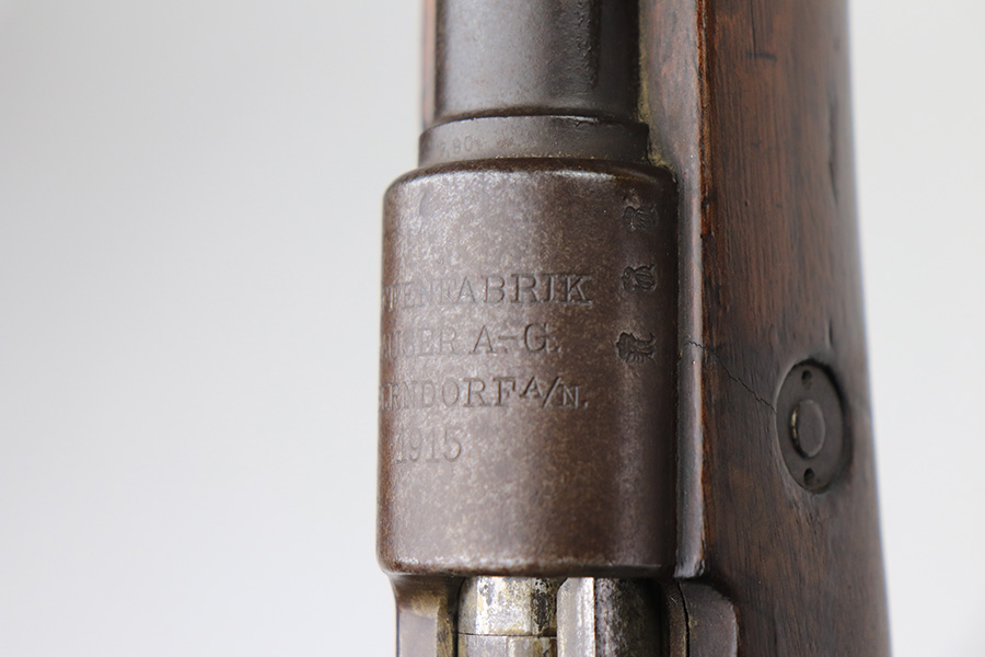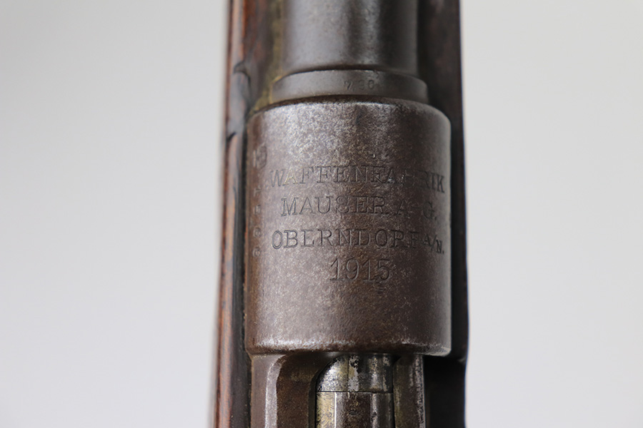 1/24/22 – This is a nice example of a Mauser Gewehr 98 rifle issued to the Imperial German military in 1915. The gun is mostly matching (including the butt plate and wood stock), but the bolt is mismatched. No import marks. This is a “Bond Gun” example. These guns were handed out in the civilian market following WW1 to those who contributed to the war effort by purchasing war bonds. For all of these rifles, the barrels have a plug in the muzzle end. Overall, the gun is in nice condition, but there is noticeable spotty brown patina on all of the metal parts. There is also a series of small dings on the front barrel band. The stock is in decent condition, but there are noticeable dents, bruises, and scratches throughout. The barrel is plugged, so we could not get a bore rating.