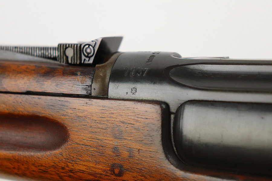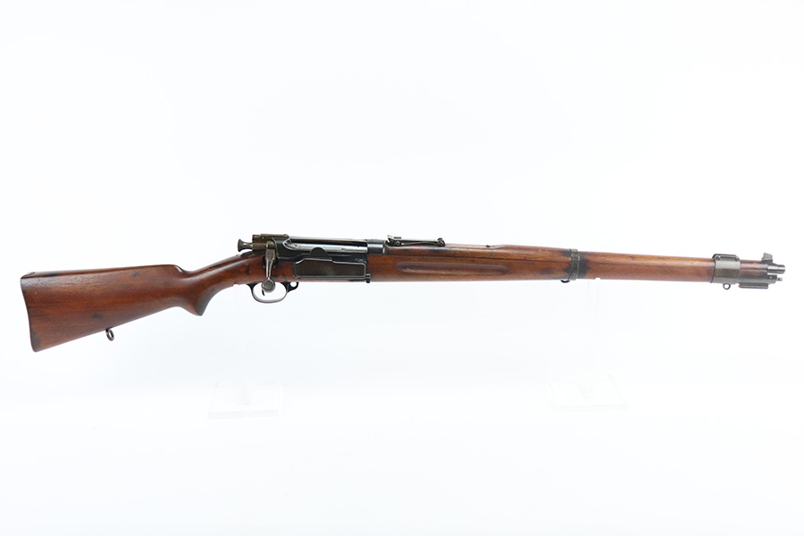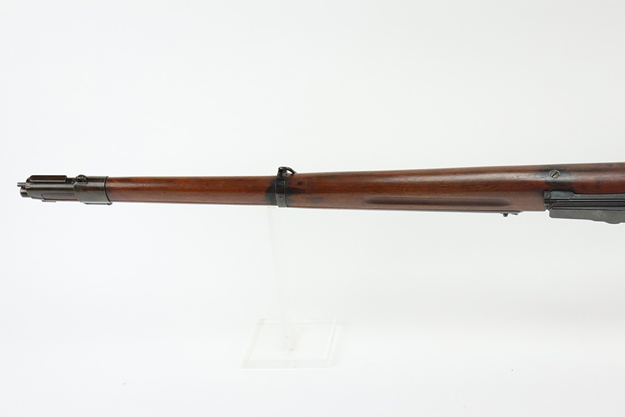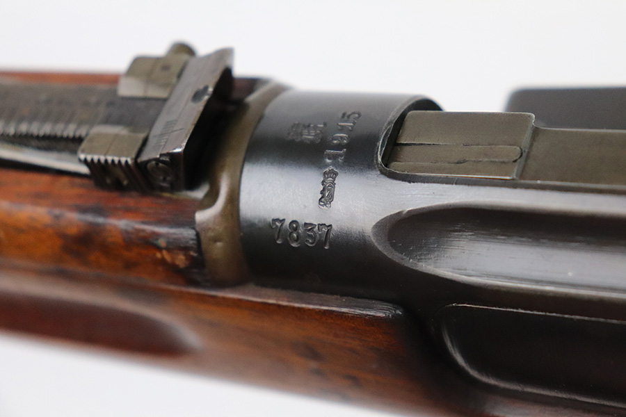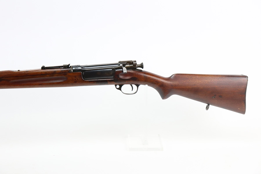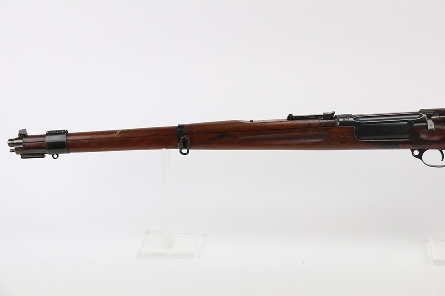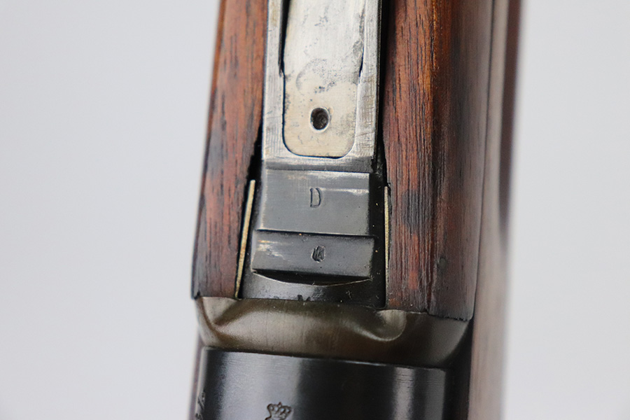 8/16/21 – This is an excellent example of a Krag-Jorgensen Model 1912 issued to the Norwegian military in 1915. This one has the proper Norwegian proofs and Kongsberg “Crown K” on the receiver. The rear barrel band, rear sight, and trigger guard are mismatched. It has retained most of its finish, but there is thinning and light brown patina around the muzzle, on the barrel bands, and on the magazine. Some spotty wear and patina on the left side plate as well. Very nice stock with minor dings throughout and a small chip in the wood on the front half of the gun. Excellent bore with strong rifling.