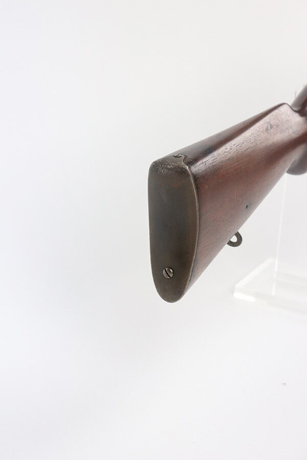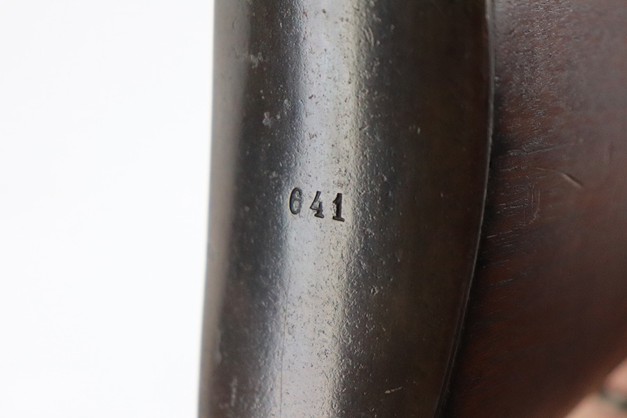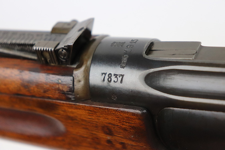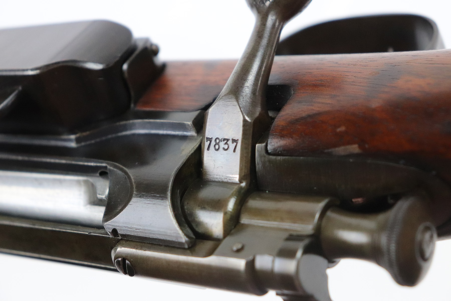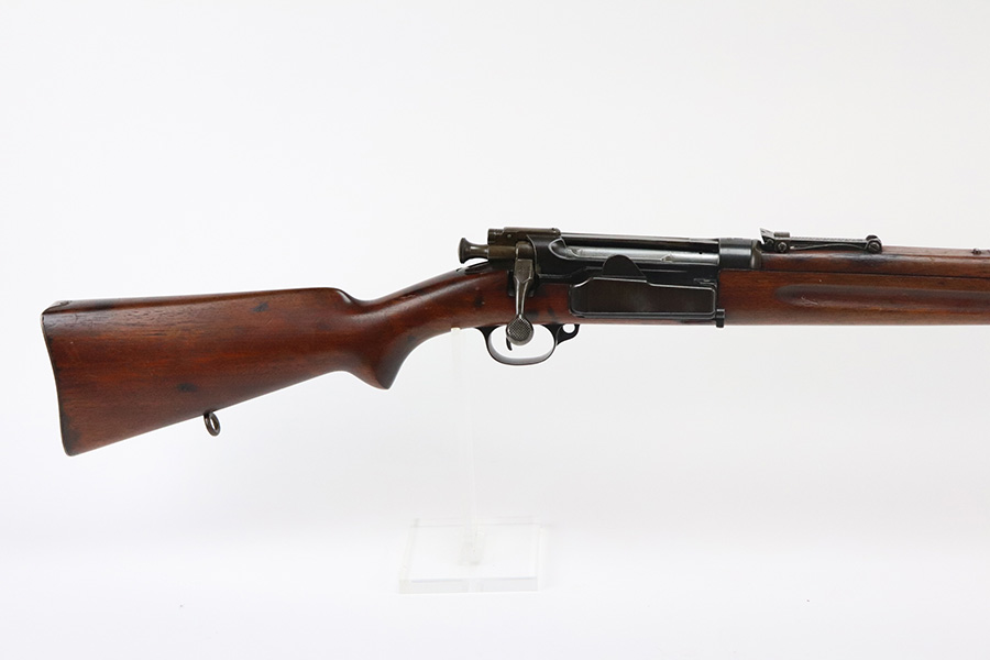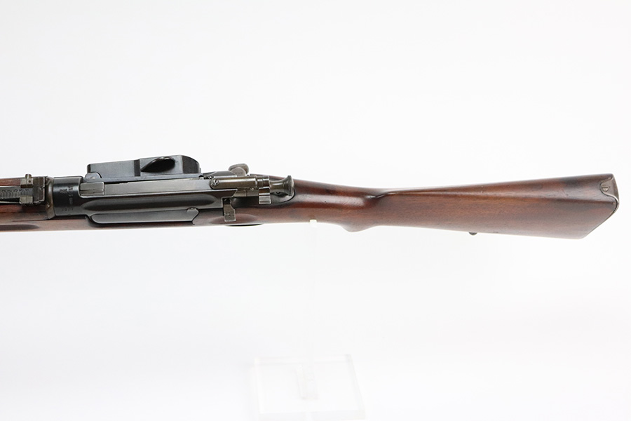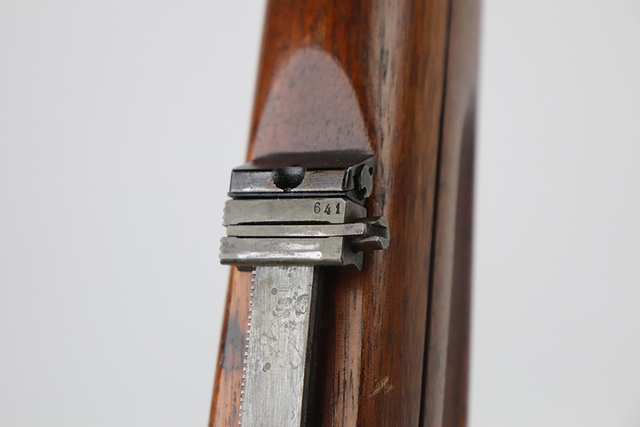 8/16/21 – This is an excellent example of a Krag-Jorgensen Model 1912 issued to the Norwegian military in 1915. This one has the proper Norwegian proofs and Kongsberg “Crown K” on the receiver. The rear barrel band, rear sight, and trigger guard are mismatched. It has retained most of its finish, but there is thinning and light brown patina around the muzzle, on the barrel bands, and on the magazine. Some spotty wear and patina on the left side plate as well. Very nice stock with minor dings throughout and a small chip in the wood on the front half of the gun. Excellent bore with strong rifling.