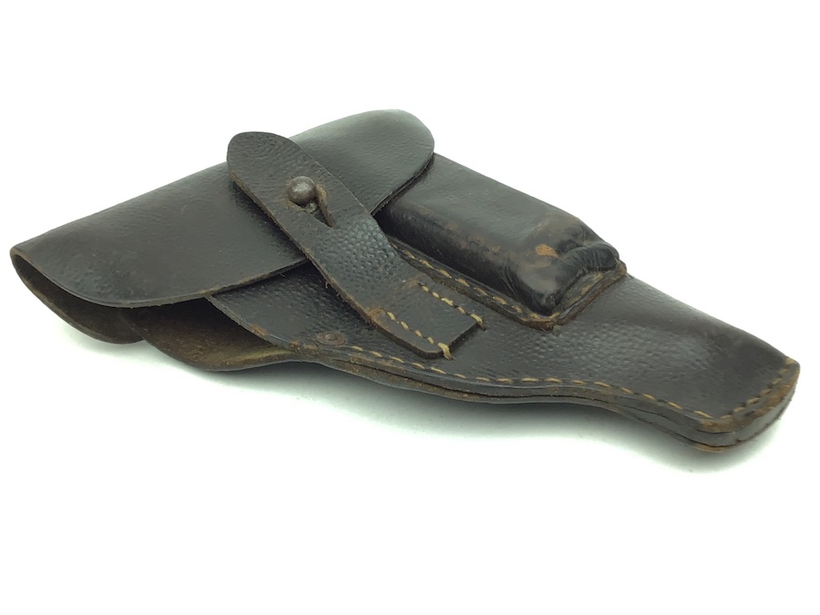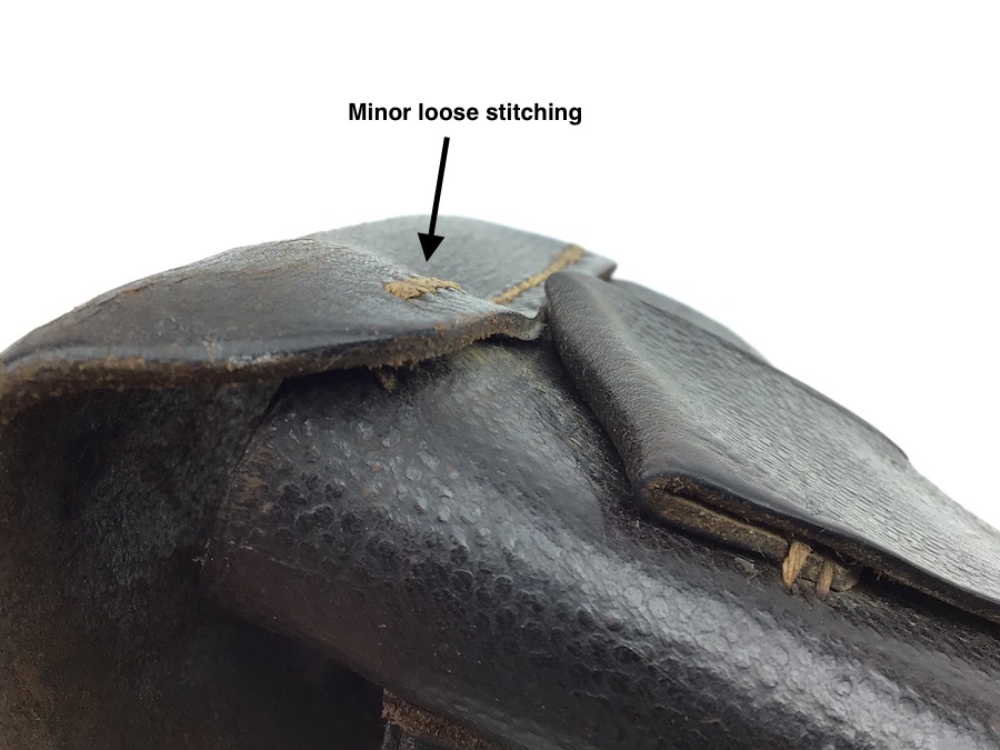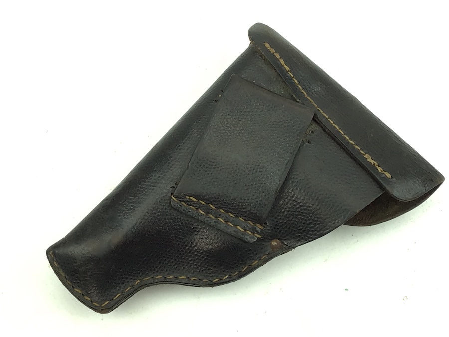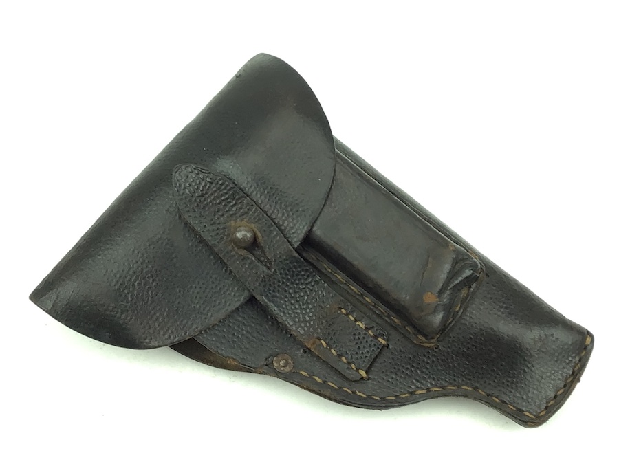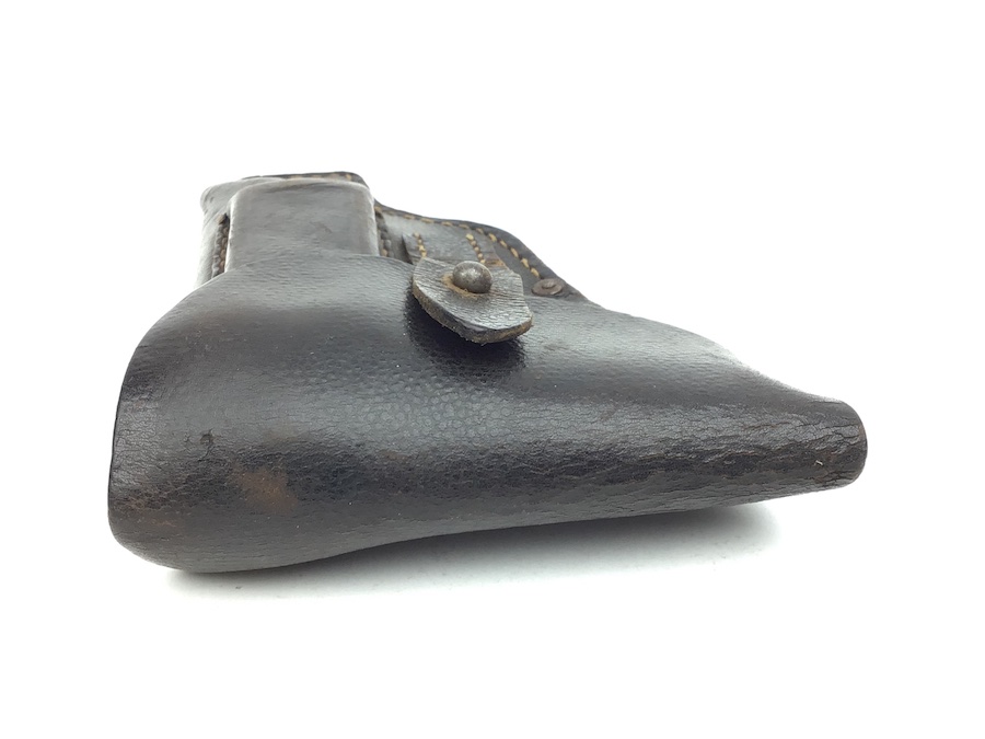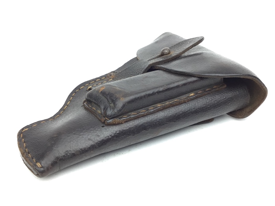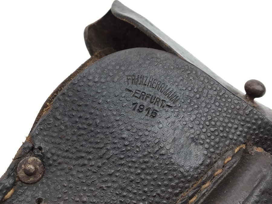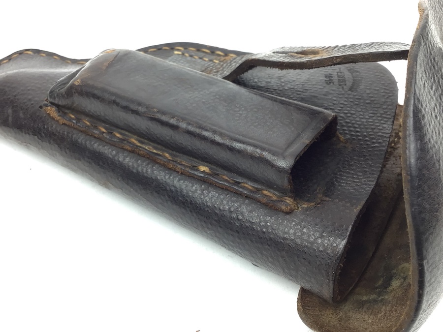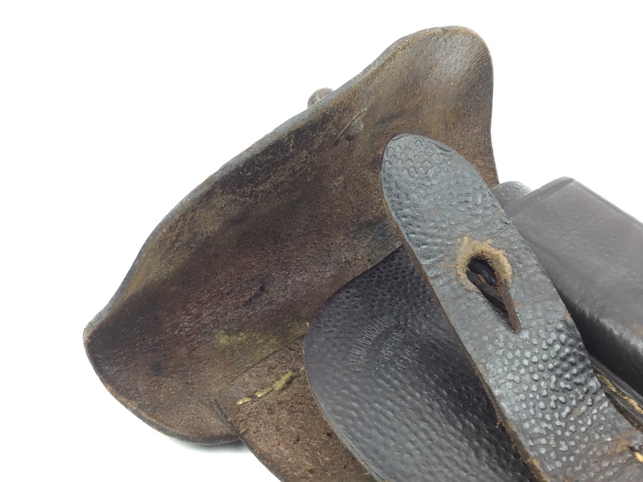 10/6/21 – Original and great condition. Black, pebble grain holster for a Sauer & Sohn M1913 handgun. Maker stamped & dated under the closure flap. “FRANZ HERRMANN ERFURT 1915” Leather is stiff but still pliable. Minor wrinkling at the toe of the magazine pouch. Small area of loose stitching at the closure flap, but it is secure. Scarce piece.