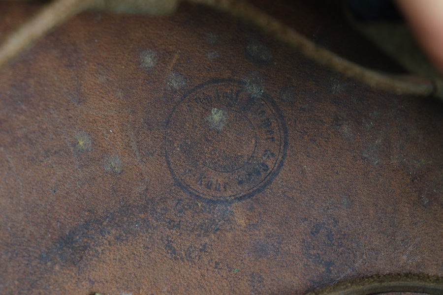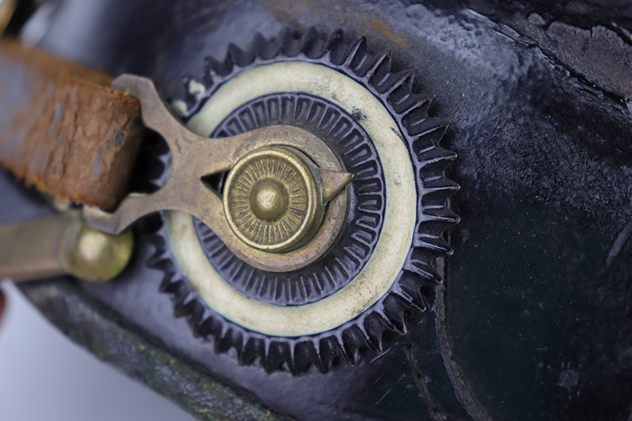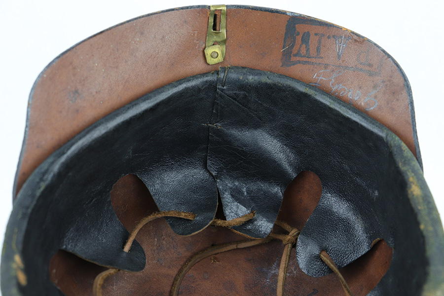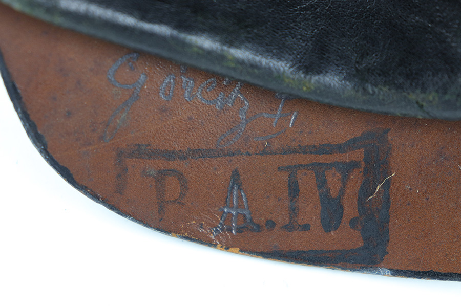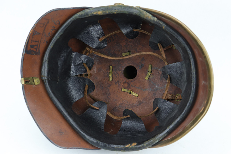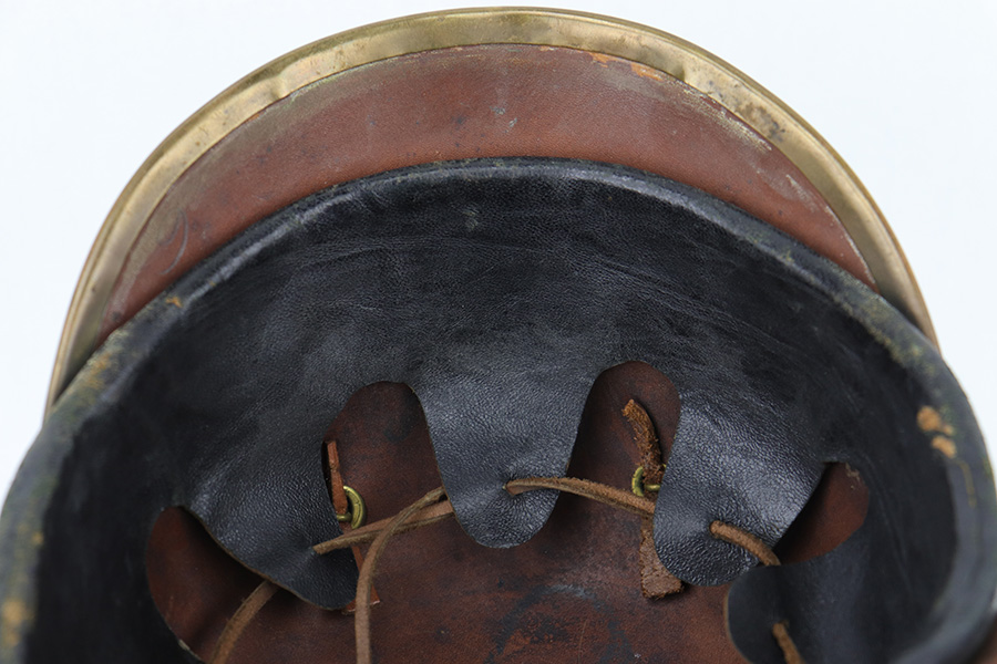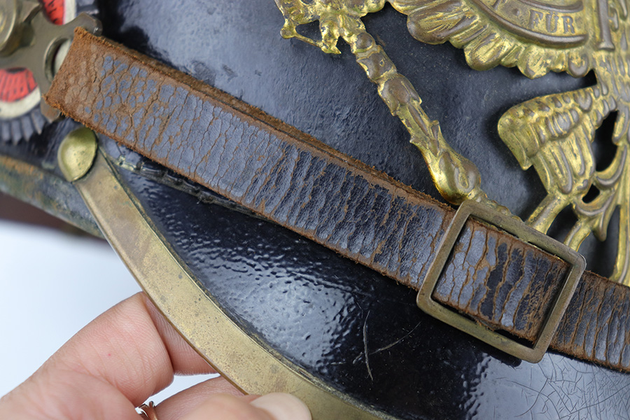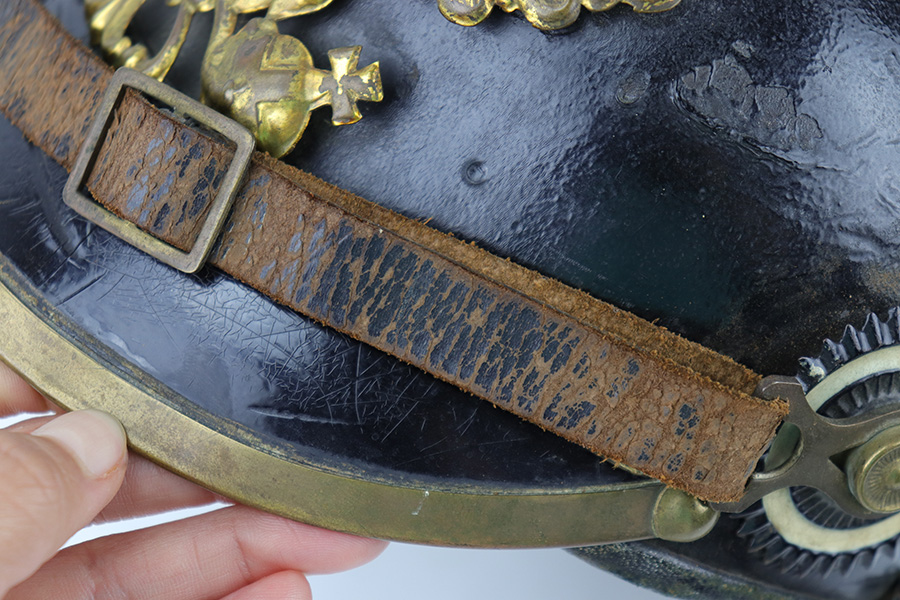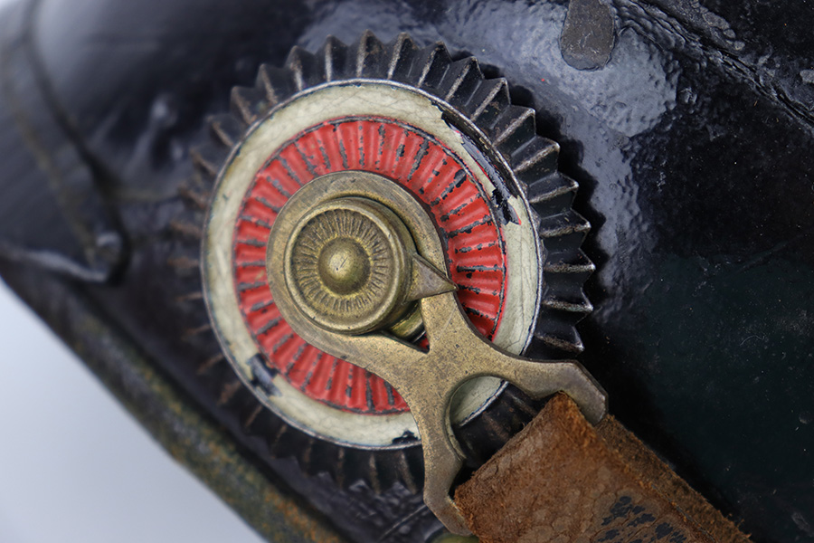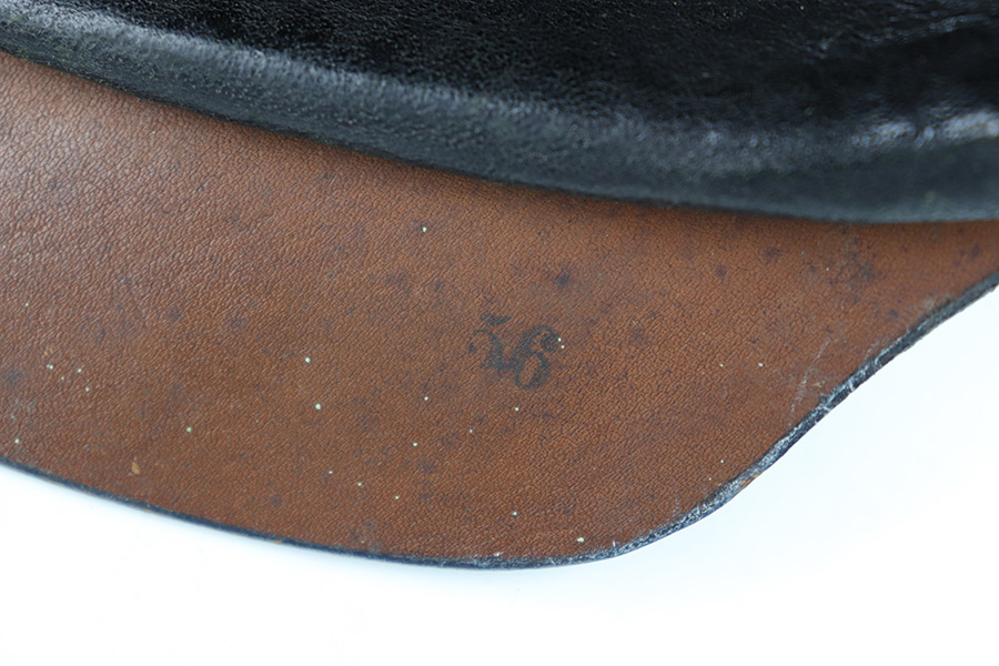 5/12/23 – This is an original WW1 era production Prussian Infantry Pickelhaube. The helmet features a black lacquered leather exterior with some surface wrinkling and cracking. This is mostly surface wear, including a few small scuffs, as shown. The front rounded visor has a non-magnetic brass rim. The stitching is all present and original, and the front and back brims are secure. The front eagle plate is a standard Prussian eagle with inscription “Mitt Gott Fur Koenig und Vaterland”. Great condition with normal surface patina. The top spike is standard infantry brass and non-removable, with a circular base and 4 mounting rivets. The circular base is the only non-brass magnetic metal throughout this example. The back spine is intact as well with no notable issues. The original leather chinstrap is still attached and completely intact with surface aging throughout but no breaks or rips. The cockades on each side of the helmet are present, but loose and fall out if the chin strap is moved. The original interior leather liner is intact and in excellent condition as shown. The back visor is depot ink stamped and size ink stamped, 56. The interior crown has a 1915 ink stamp, and a circular maker stamp still visible, as shown.