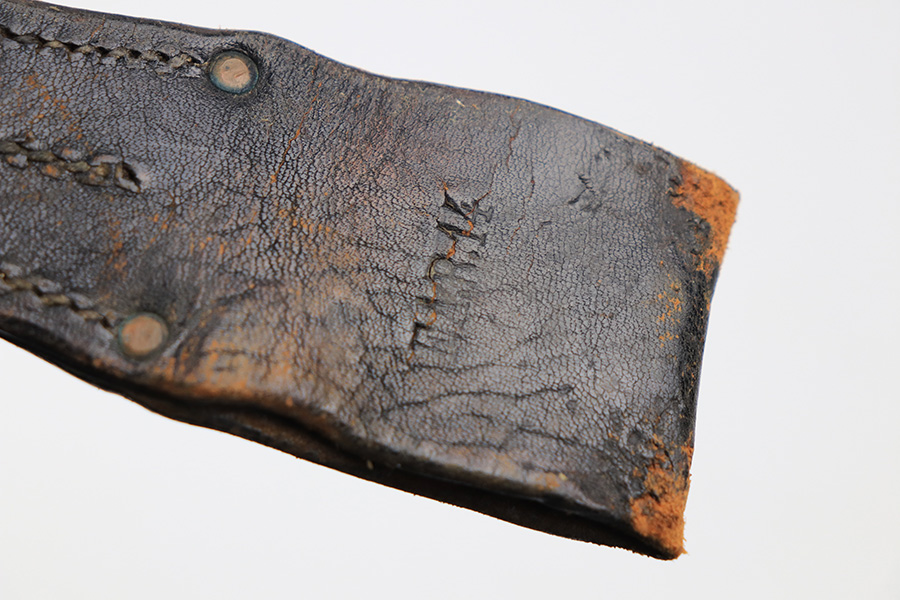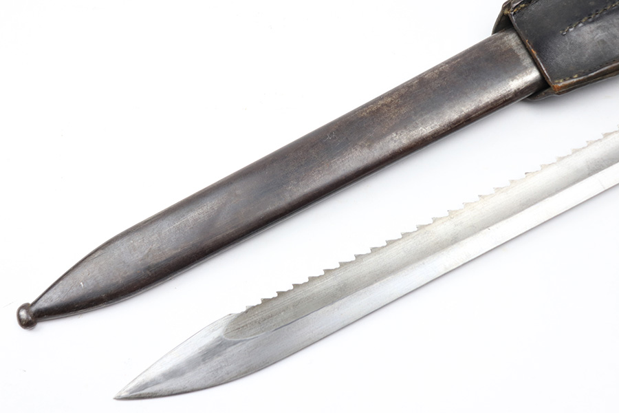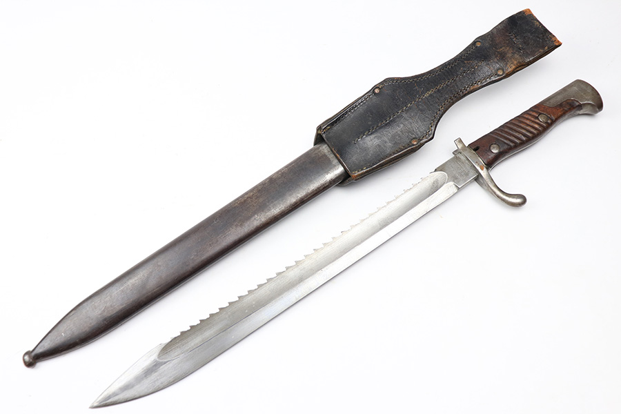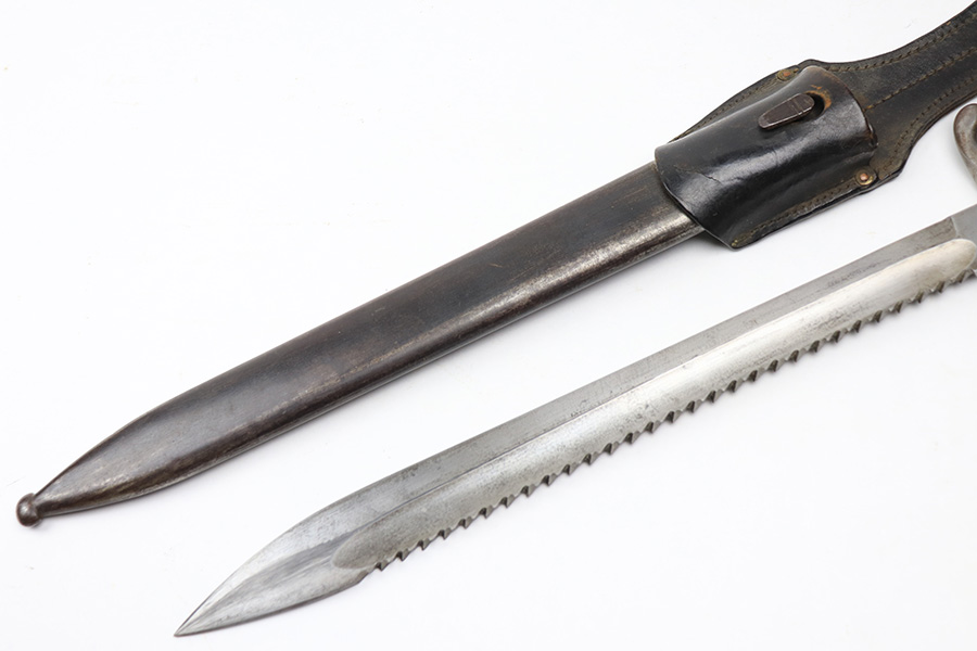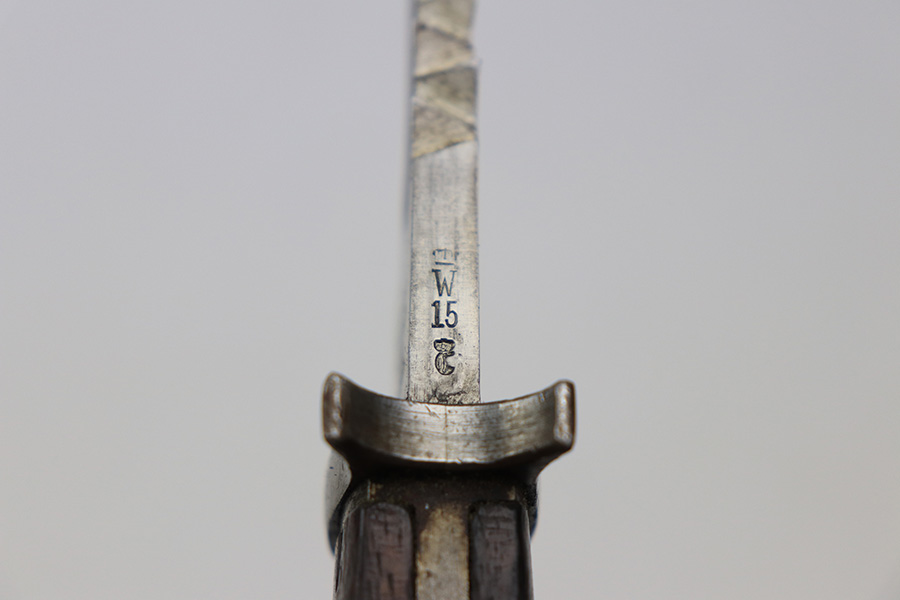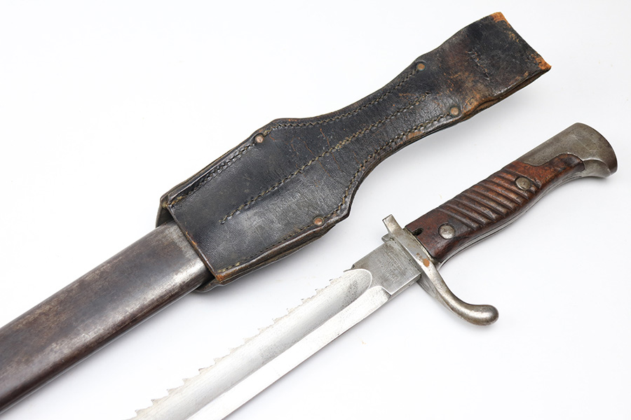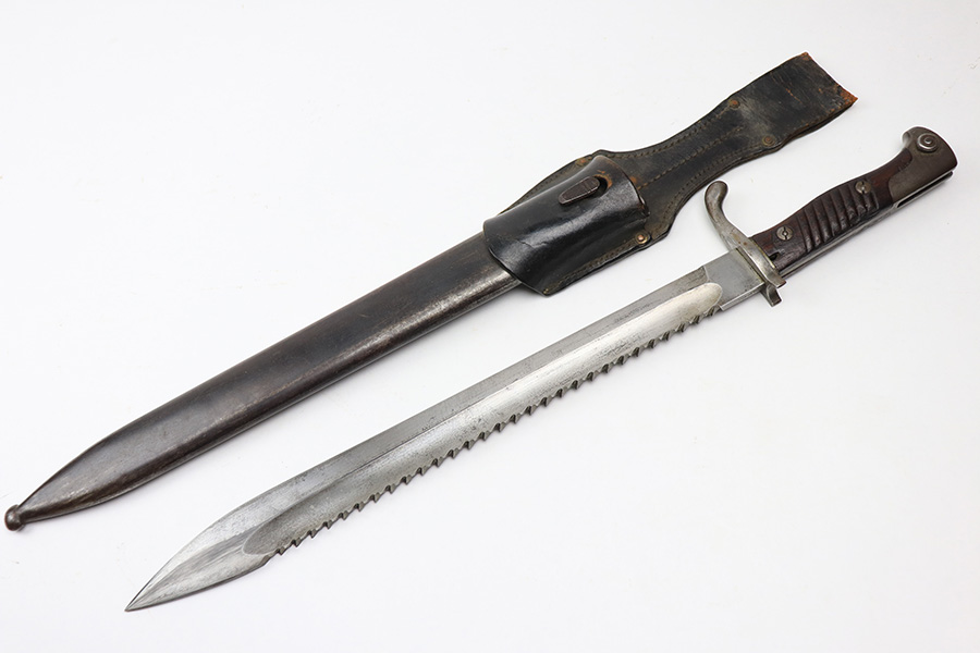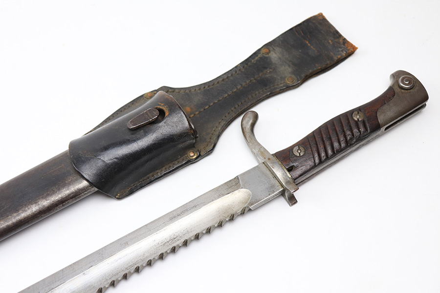 1/7/22 – This is an original WW1 production Gewehr bayonet. The bayonet is dated 1915 on the spine, along with proof stamps and a maker stamp at the base of the blade. The sawback blade is in great condition with some mild surface patina throughout and no signs of sharpening. The wood handle has no cracks or chips. Typical patina throughout the hand guard and pommel. The scabbard has patina throughout as well but no dents or excessive wear. The leather frog is maker stamped on the back and completely in tact.