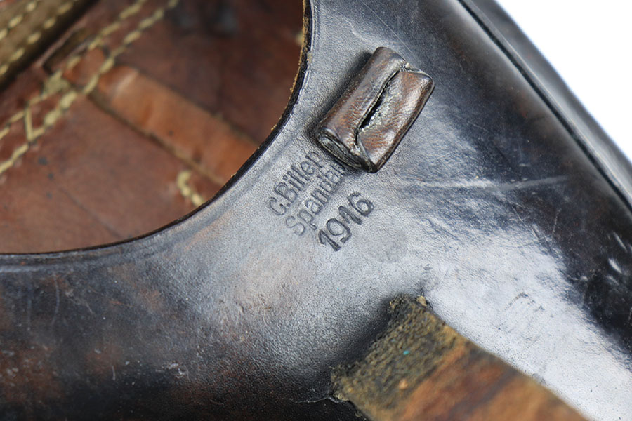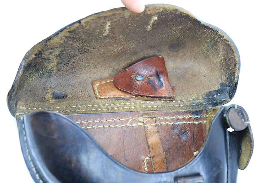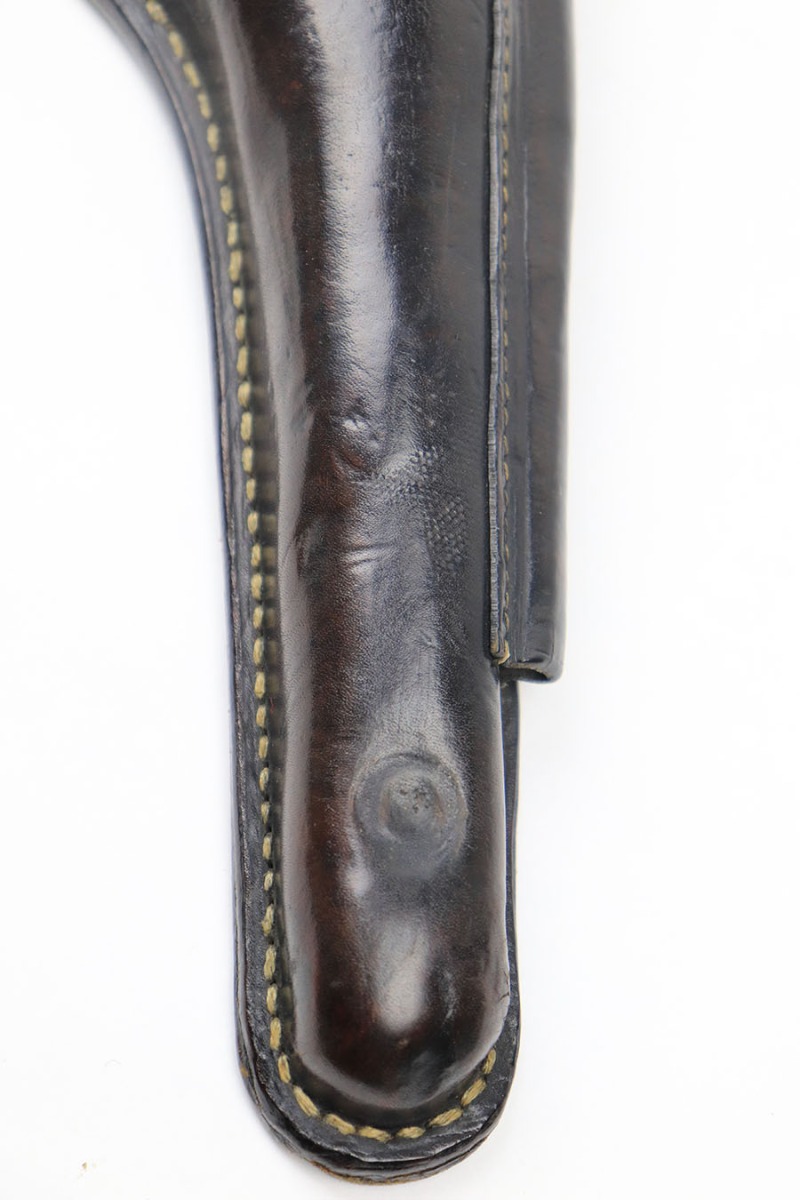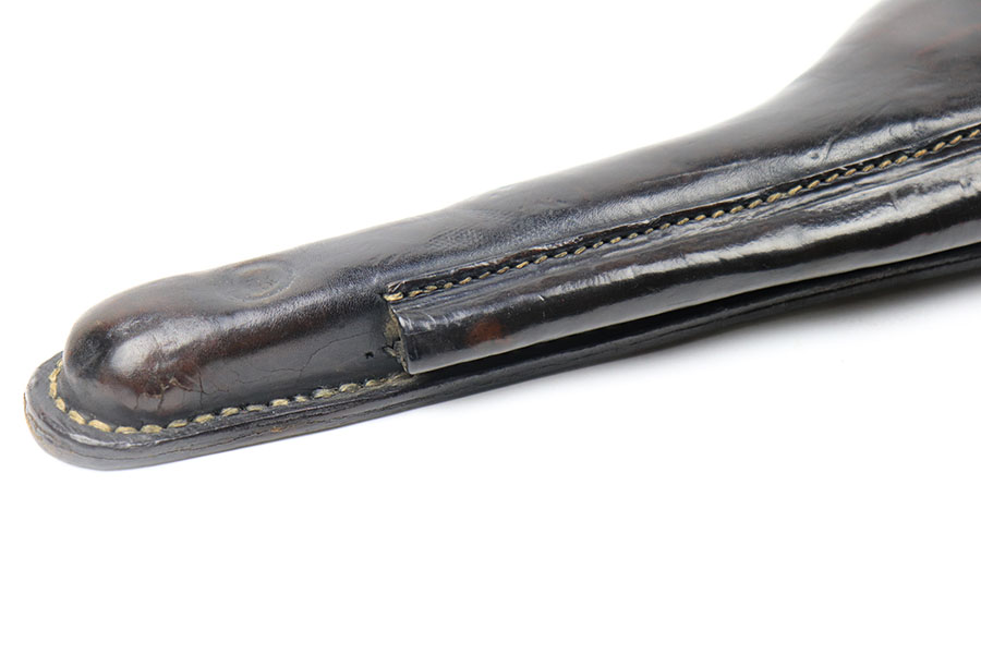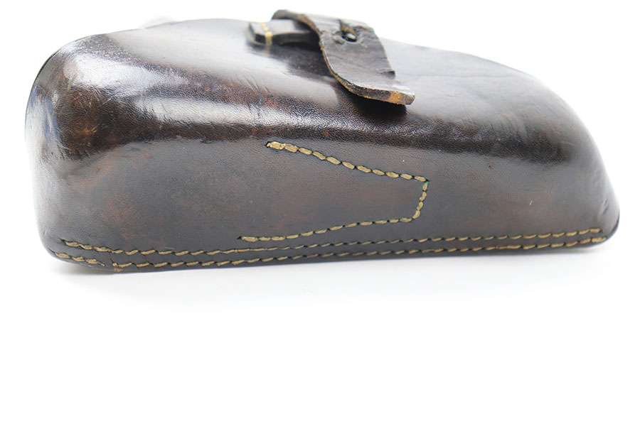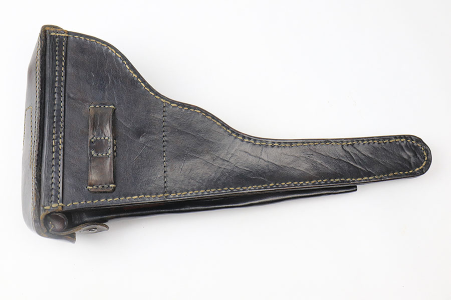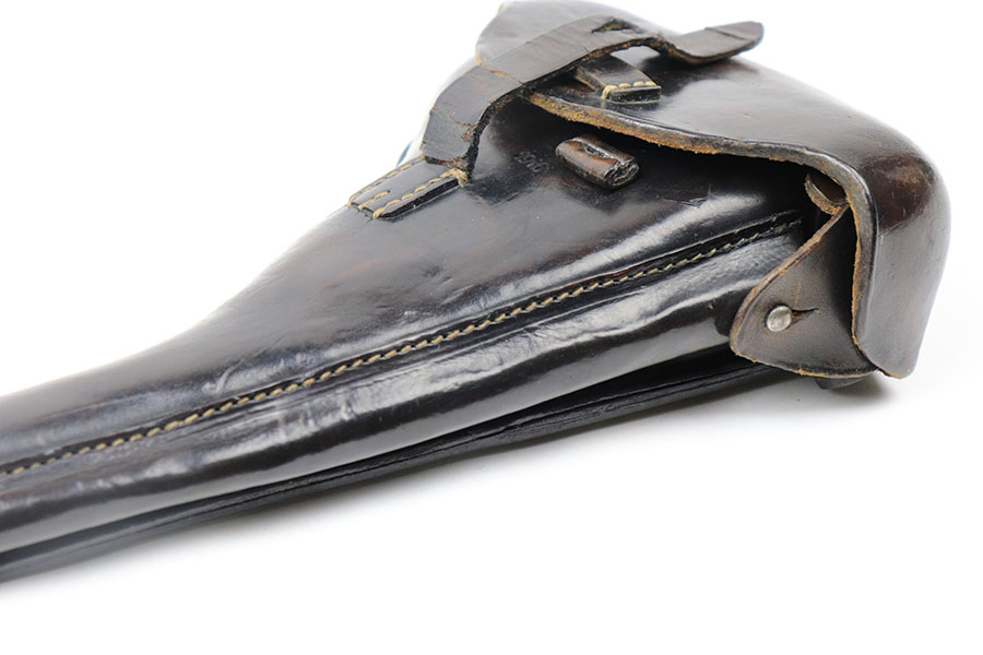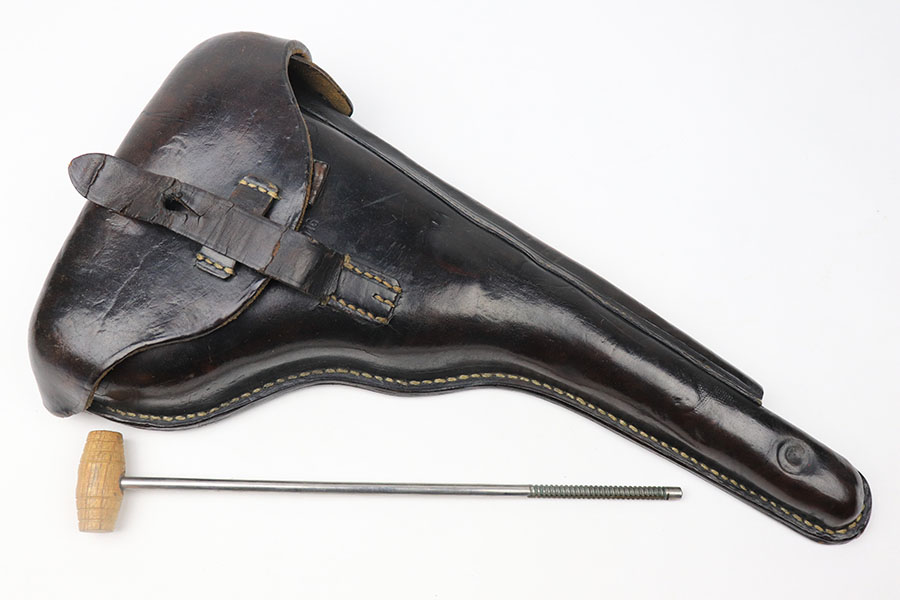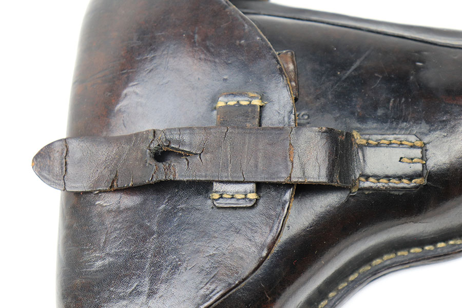 6/23/21 – This is an original 1916 dated Artillery Luger Holster. The holster comes with an Artillery Luger cleaning rod as well, but the rod is not WW1 original. The holster is maker stamped and dated under the closure strap on the front leather. The closure strap has some surface cracking on the leather but this doesn’t go very deep. The leather is otherwise strong and clean. Excellent stitching.