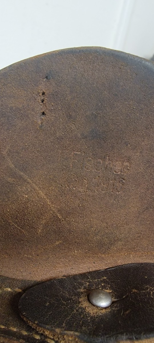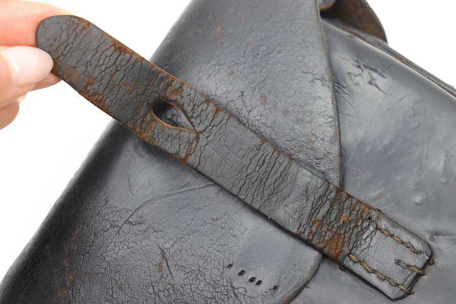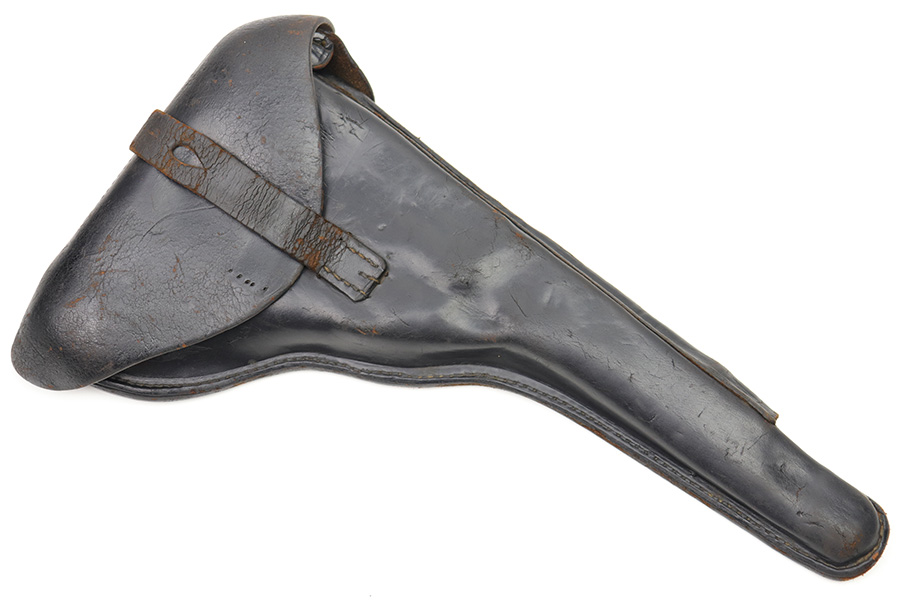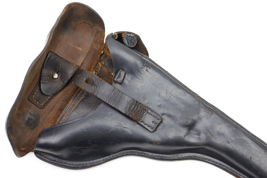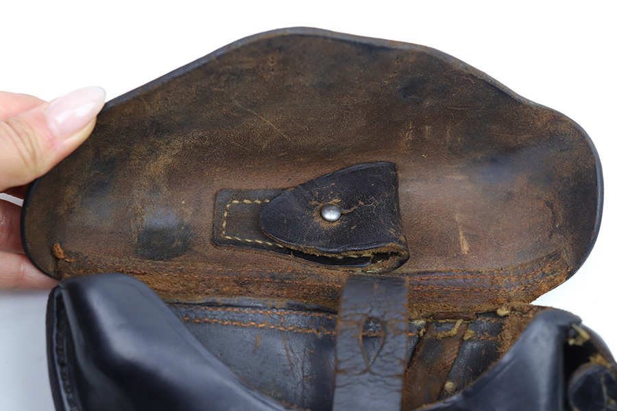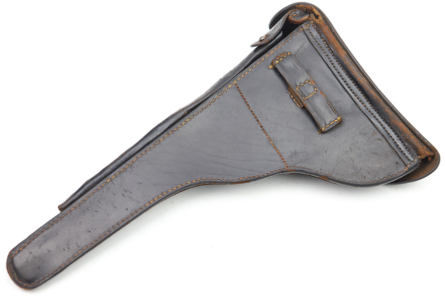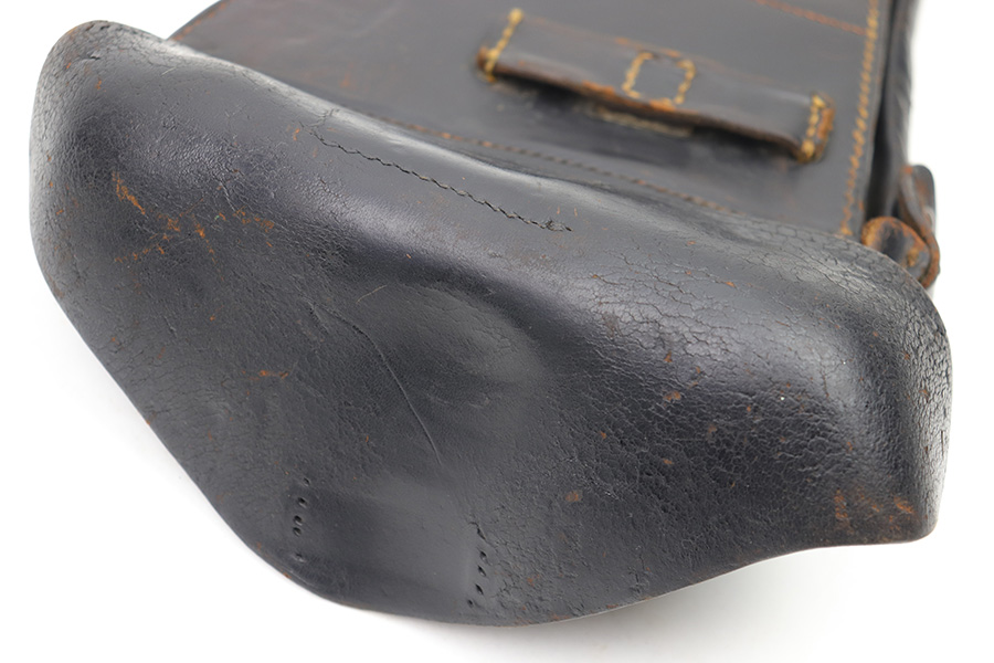 2/7/23 – This is an original 1916 dated Artillery Luger holster from WW1. The holster is maker stamped and dated on the interior lid of leather. The holster has nice leather that’s soft and pliable from age and previous use. The exterior leather has some scuffing and surface cracking, mostly on the top leather and closure strap. The side cleaning rod pouch has similar surface wear, but the leather is all original and intact throughout. All original stitching intact throughout the holster as well. The only notable flaw is the front secure strap is missing (horizontal strap sewn onto the lid). Otherwise a solid example with some honest use wear.