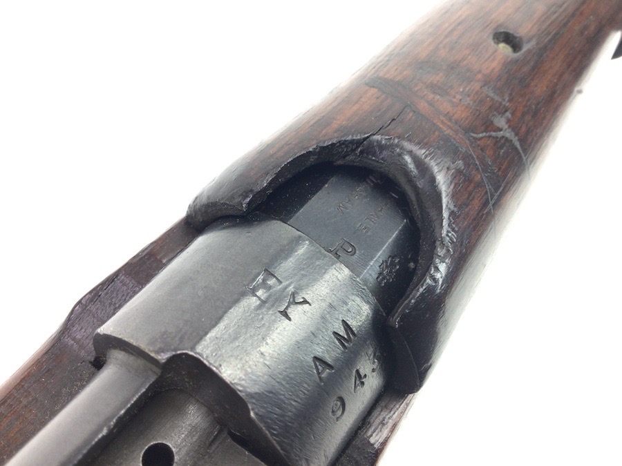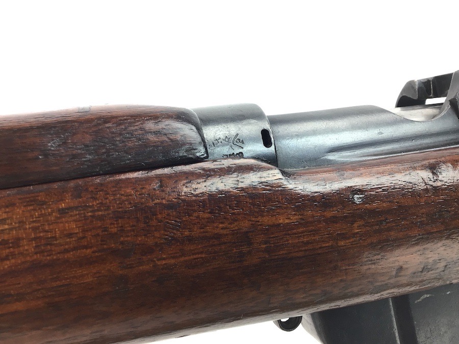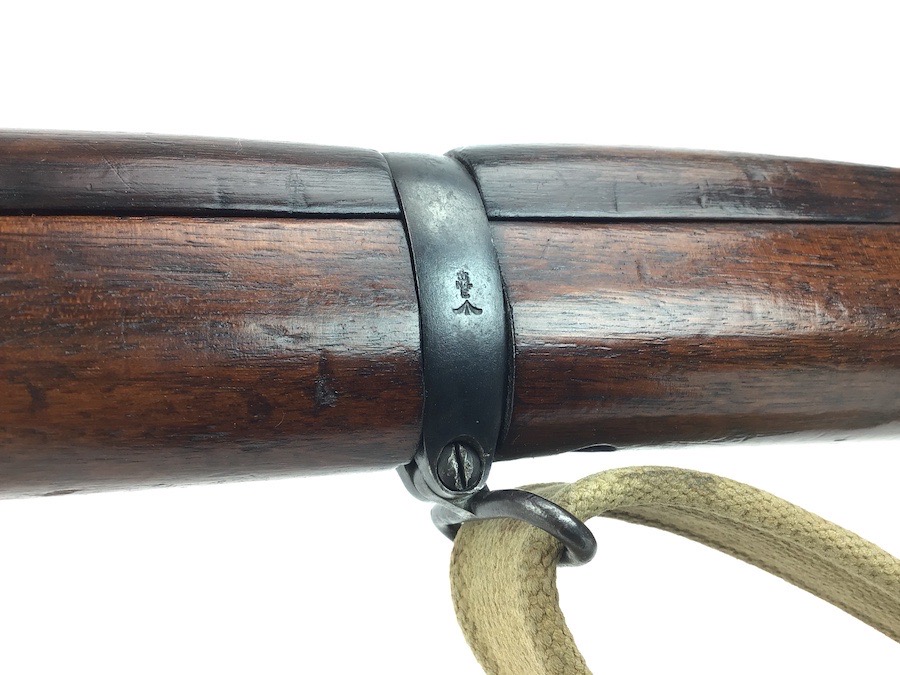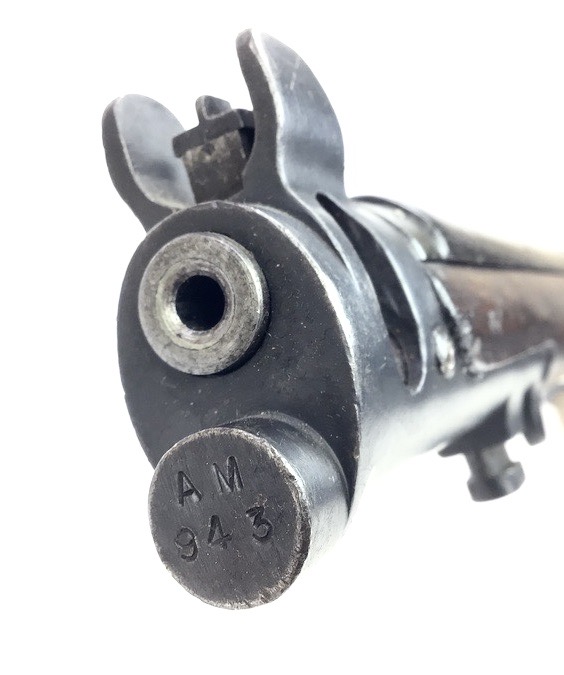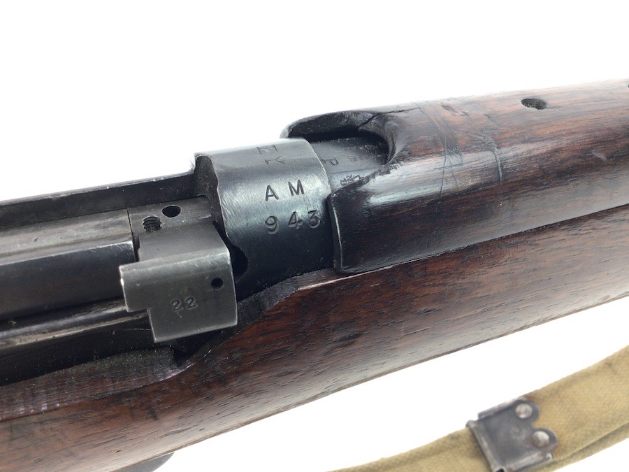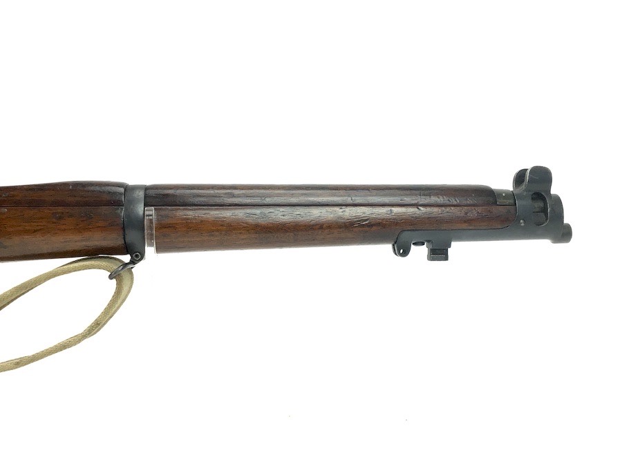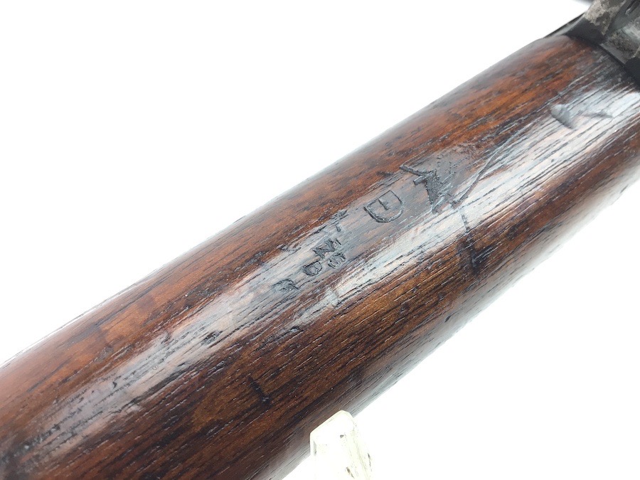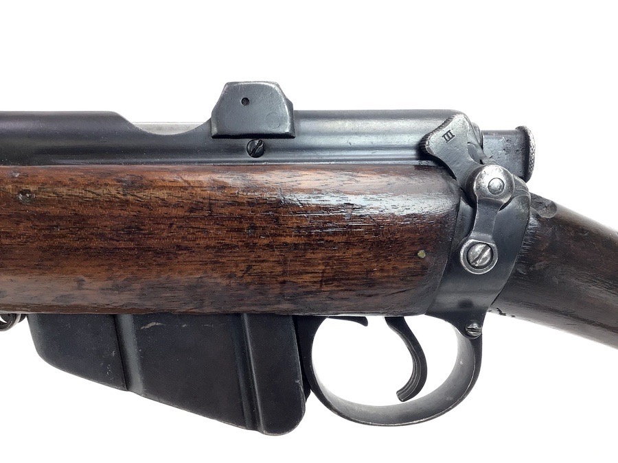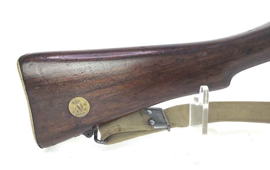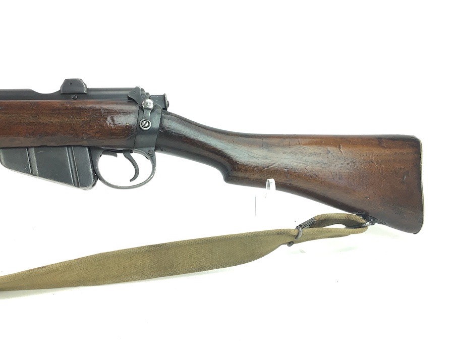 3/29/24 – This is a nice example of an Enfield marked, 1916 dated, SMLE III* rifle conversion that retains about 95% the armory applied finish. Chambered in .22 Long Rifle. The gun is almost entirely matching except for the rear sight and the front portion of the bolt. Import mark on the right side of the receiver. The stock has no visible numbering, but does have the British proof marks under the front hand guard. The brass stock disc is intact. There is no major damage to the wood stock, but there are noticeable dings, dents, and bruises throughout. Minty bore. Includes a green canvas sling.