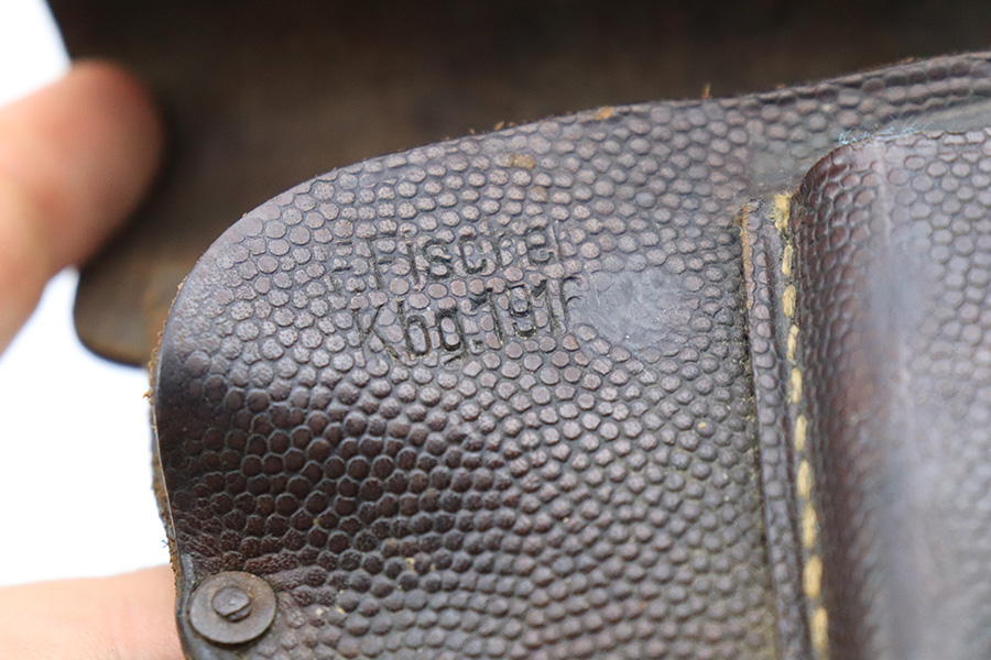 6/16/22 – This is a fairly scarce variation WW1 pistol holster. The holster is 1916 dated and maker stamped under the closure strap. The dark brown pebble grain leather shows signs of previous use and aging throughout. The leather is pliable but still in great shape overall considering its age. The stitching appears all original and without issues. This holster would fit a Mauser model 1910 / 1914. Measures about 6.5 inches long and 4.75 inches wide when closed.