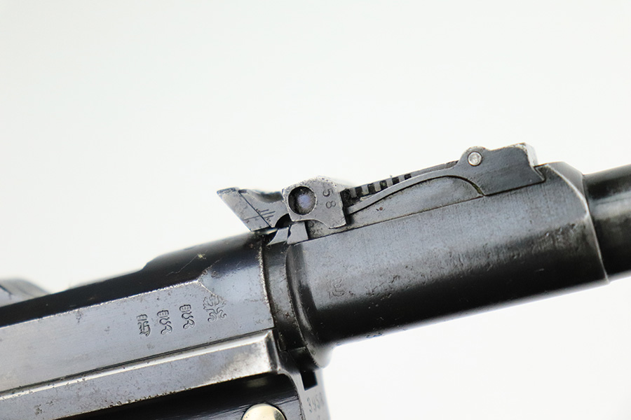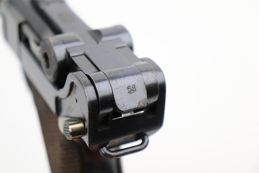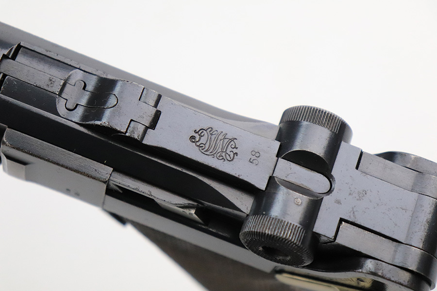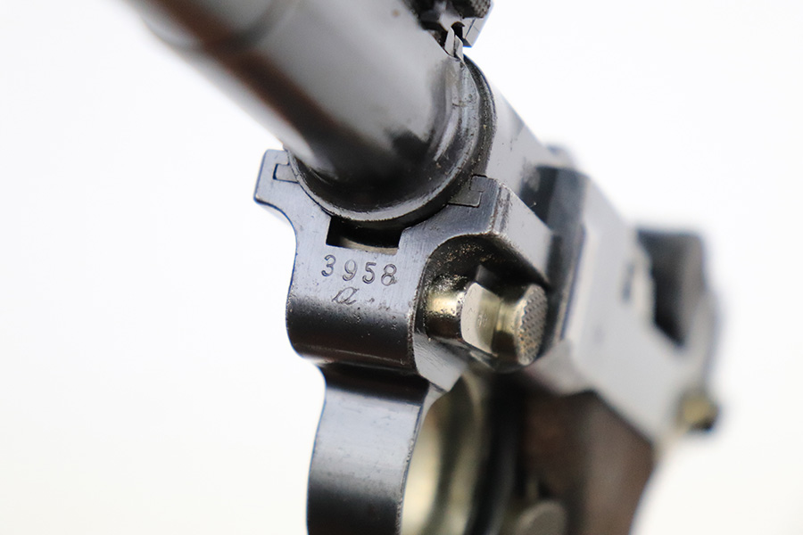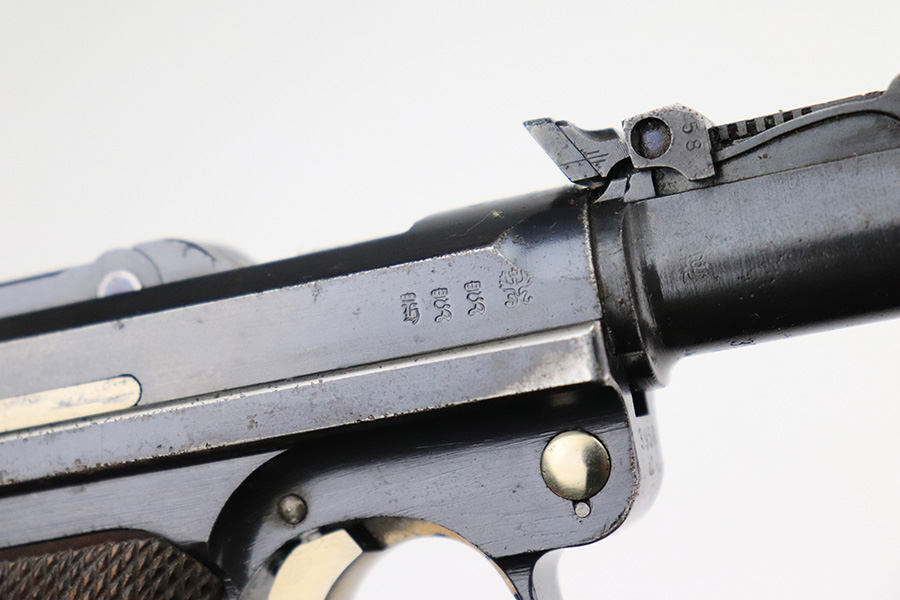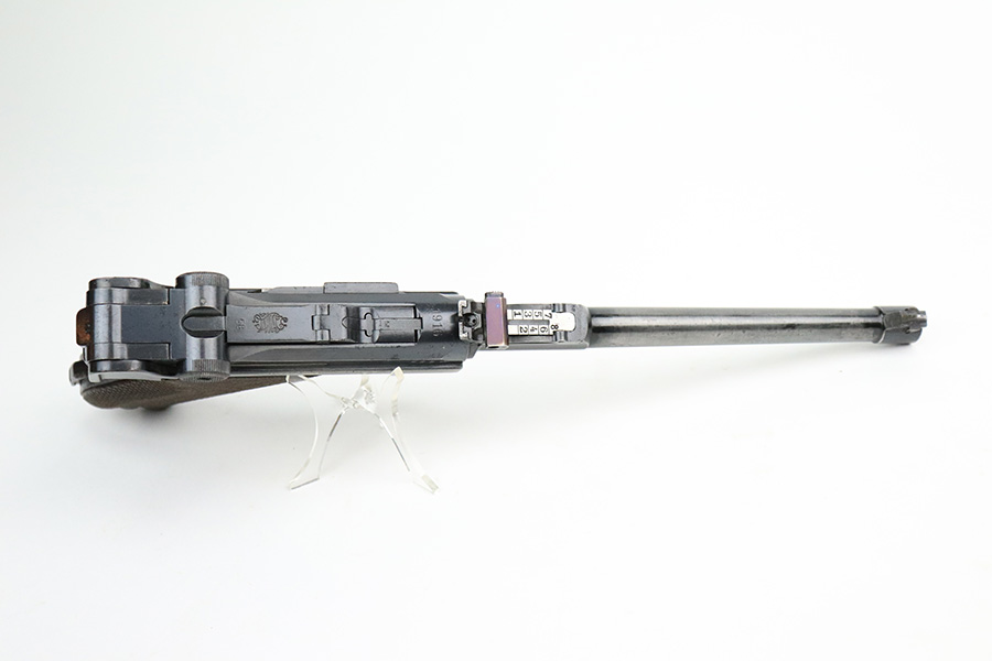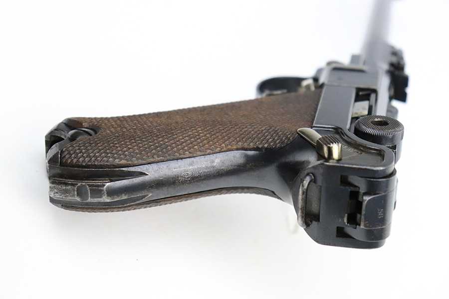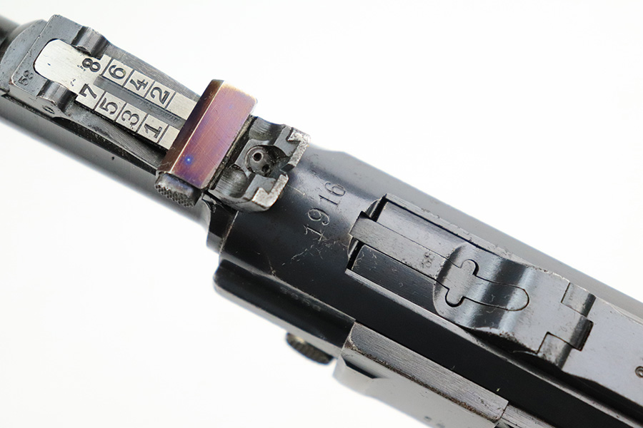7/7/22 – This is a matching and original DWM Artillery Luger rig from 1916. The pistol has all matching numbers, including the grips and mag. The grips are the factory original examples but the magazine was renumbered to match the pistol. The pistol has retained roughly 60% of its finish. The majority of the wear is along the barrel, but it also shows bluing wear on the muzzle, sideplate and barrel. There’s also oxidation all along the straps with minor bluing loss there, as well. The bore has strong rifling but there is a little freckling and frost in the grooves. The grips show minor smoothing of the checkering but no cracks or chips.