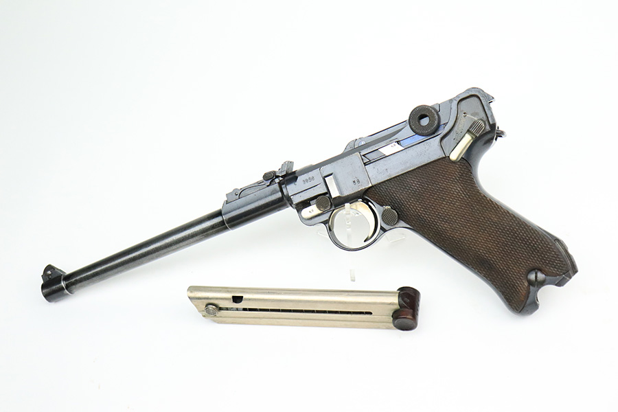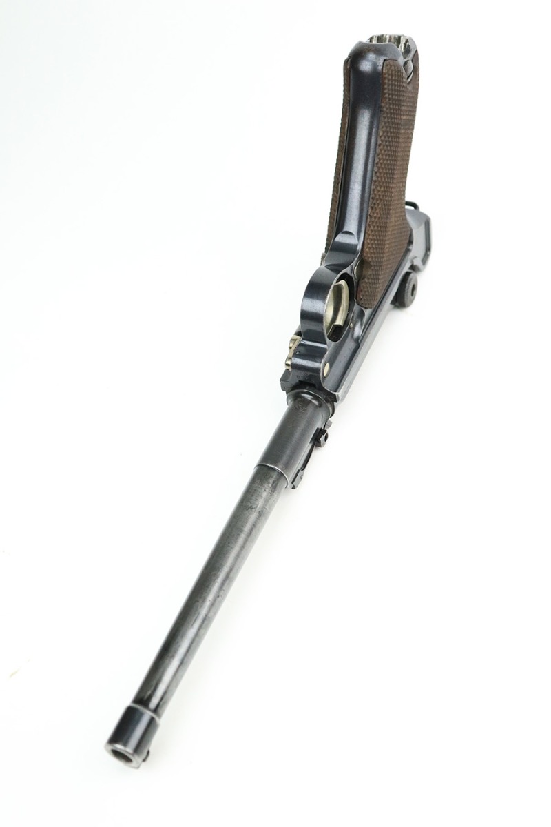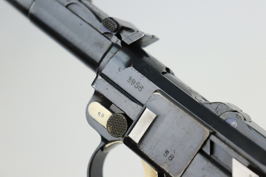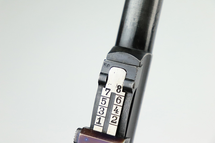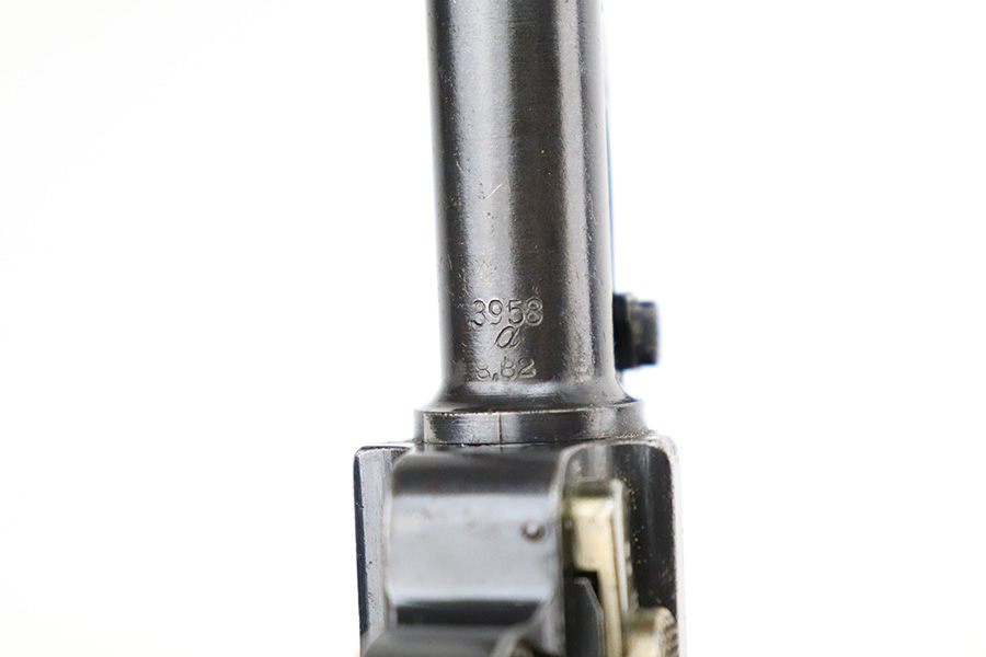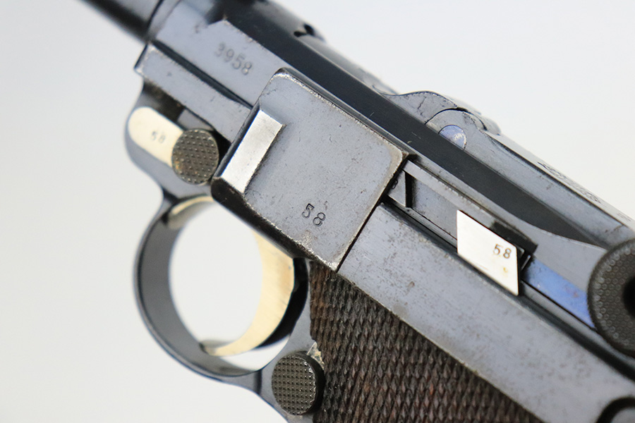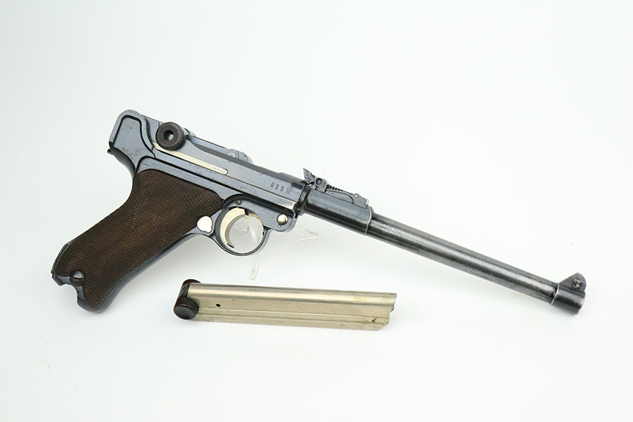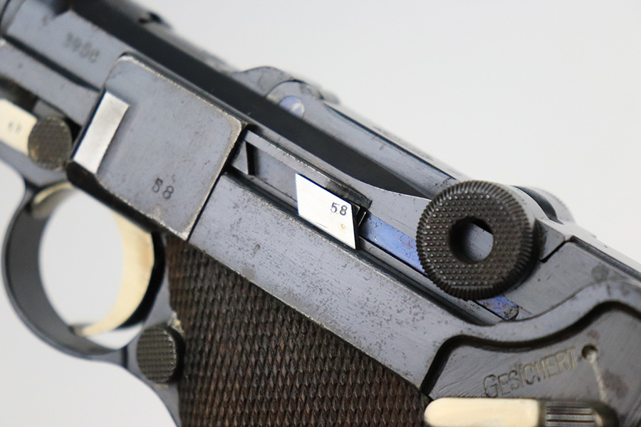 7/7/22 – This is a matching and original DWM Artillery Luger rig from 1916. The pistol has all matching numbers, including the grips and mag. The grips are the factory original examples but the magazine was renumbered to match the pistol. The pistol has retained roughly 60% of its finish. The majority of the wear is along the barrel, but it also shows bluing wear on the muzzle, sideplate and barrel. There’s also oxidation all along the straps with minor bluing loss there, as well. The bore has strong rifling but there is a little freckling and frost in the grooves. The grips show minor smoothing of the checkering but no cracks or chips.