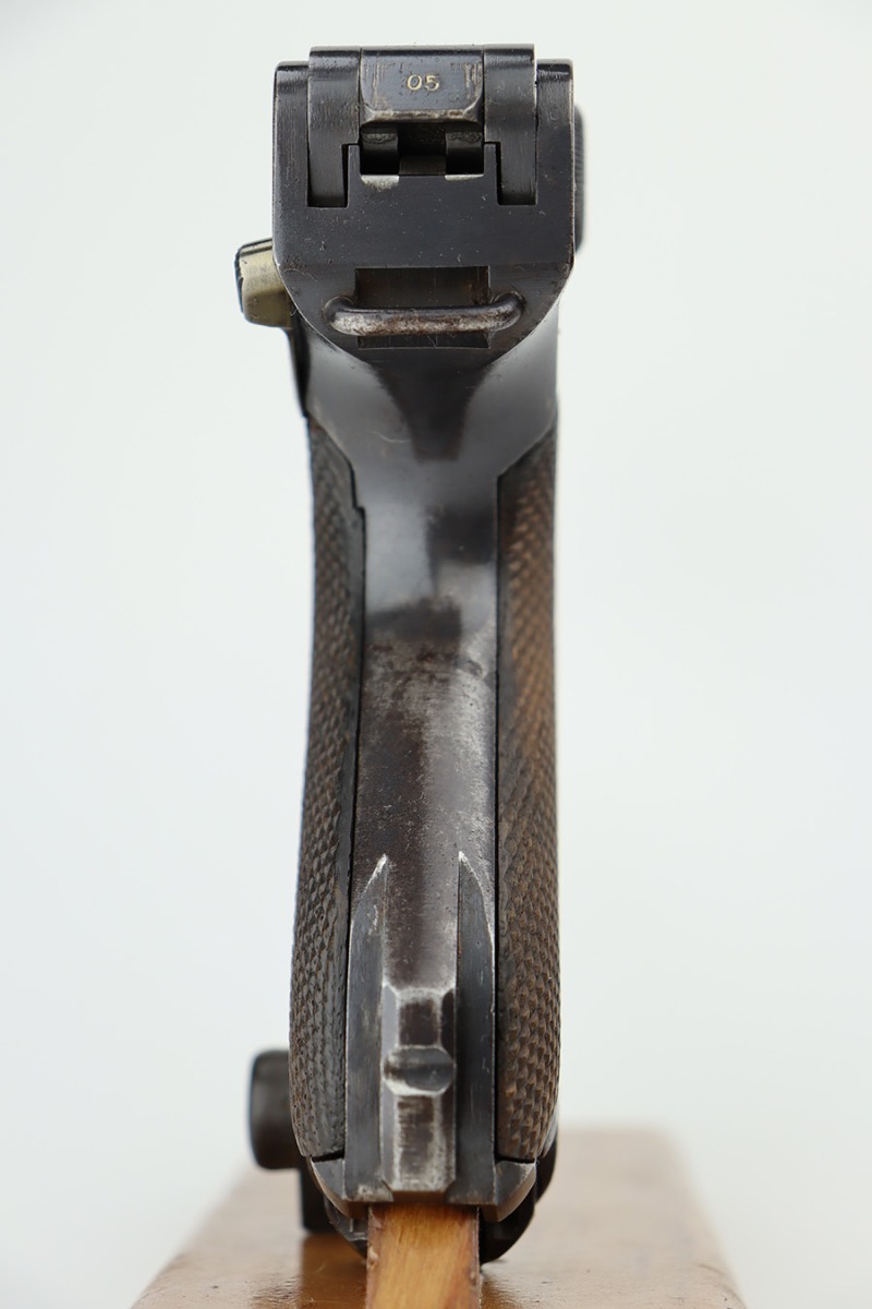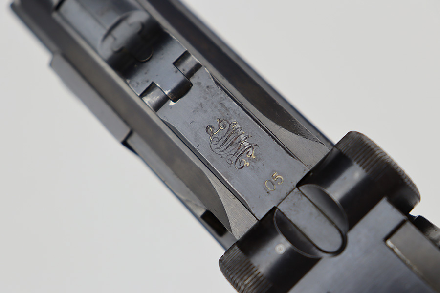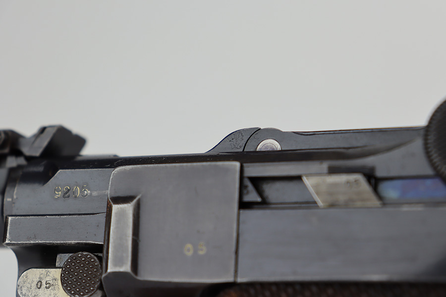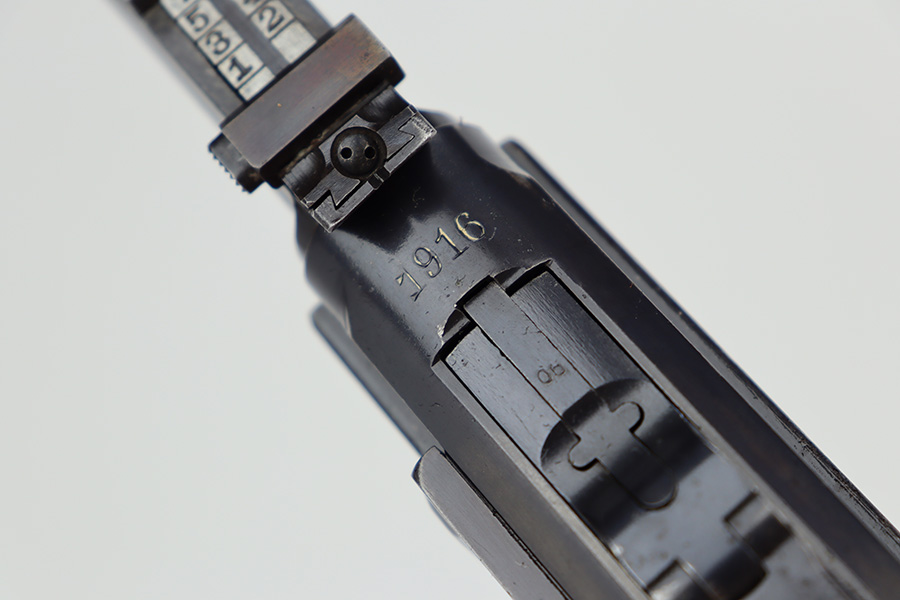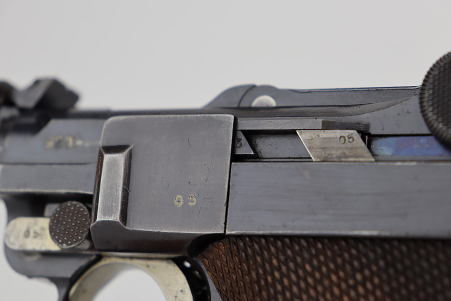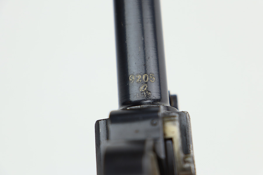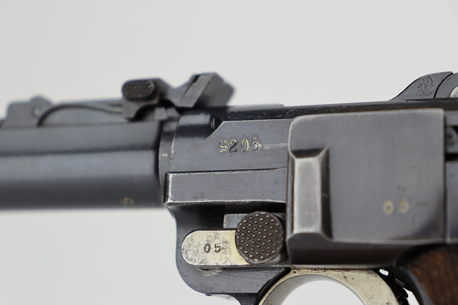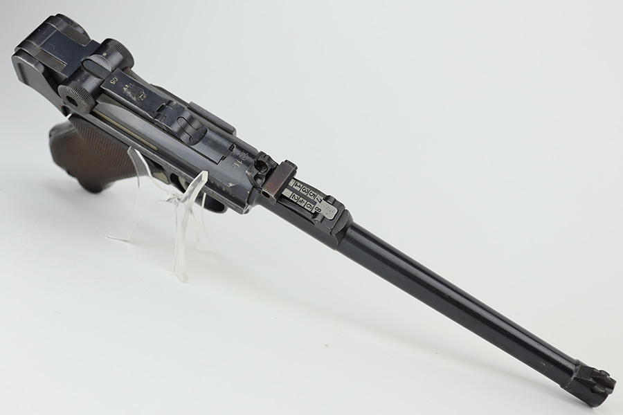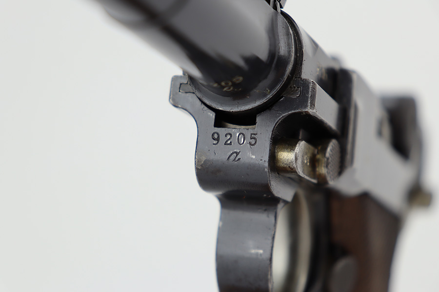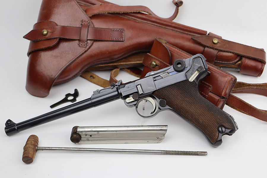 8/2/23 – This is a very nice example of a DWM Artillery Luger issued to the Imperial German military in 1916. It is all matching with the proper Imperial proofs. It comes as a rig with an excellent reproduction holster and leather harness, repro luger tool, repro cleaning rod, a period-correct but mismatched magazine, and what appears to be an original wood stock. The stock has been sanded and appears to have been force-matched to the gun. The gun itself has retained somewhere between 85-90% of its original finish. Most of the wear is on the grip straps, where there is also spotty oxidation. Some tiny pits on the back straps. Areas of minor wear around the muzzle and on the side plate. Minor pitting along the right side of the barrel and on the right side rail. Fitted with excellent matching-numbered wood grips. The bore has great rifling with just very minor pin-pricking throughout.