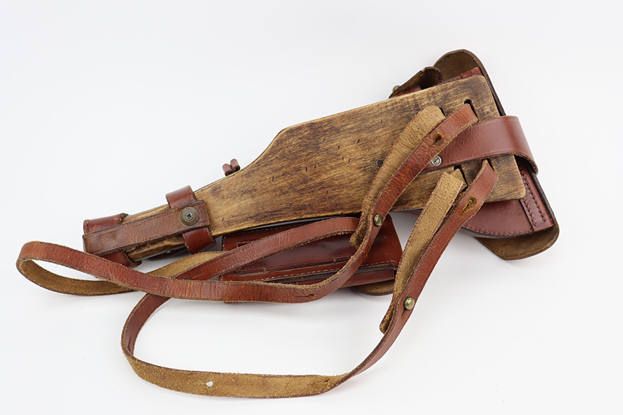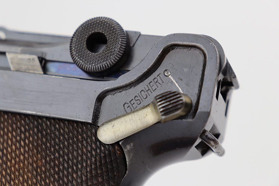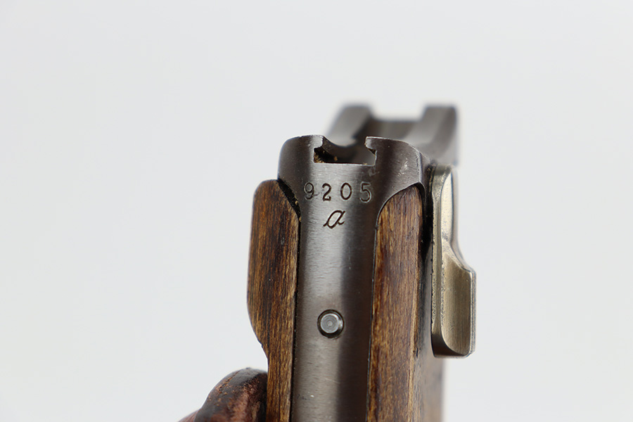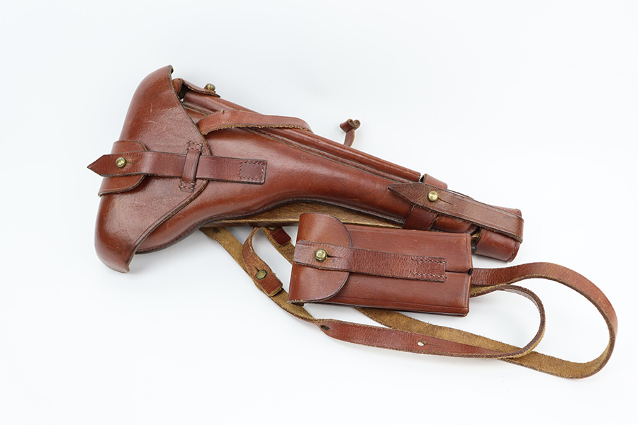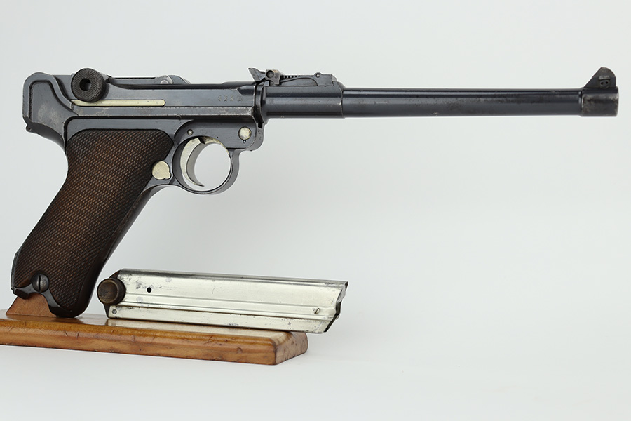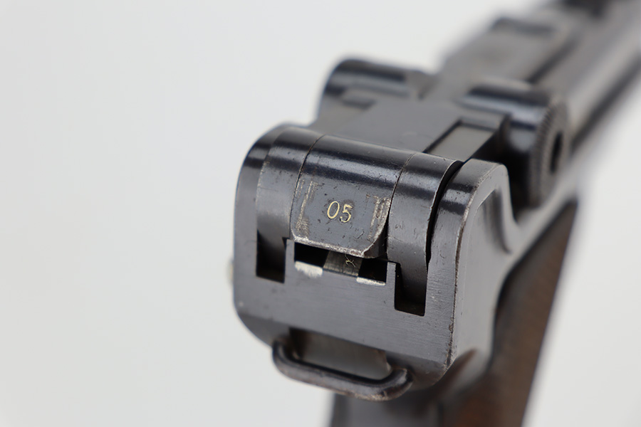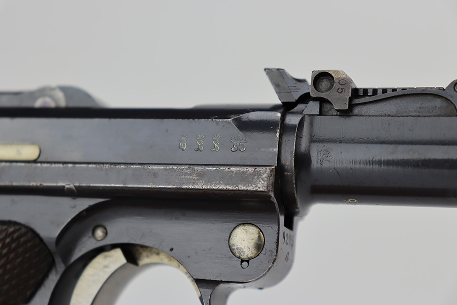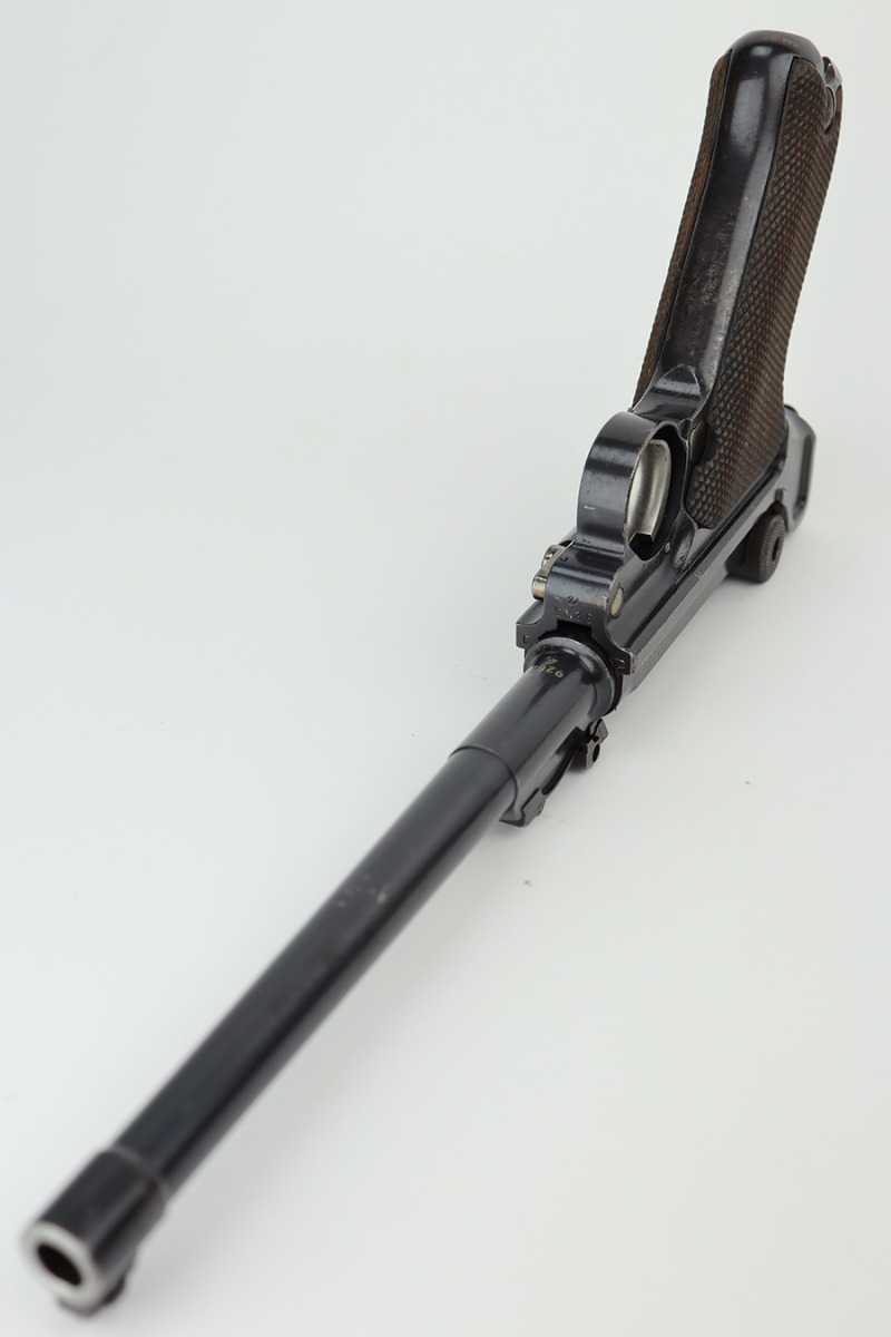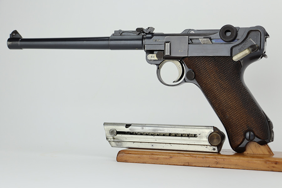 8/2/23 – This is a very nice example of a DWM Artillery Luger issued to the Imperial German military in 1916. It is all matching with the proper Imperial proofs. It comes as a rig with an excellent reproduction holster and leather harness, repro luger tool, repro cleaning rod, a period-correct but mismatched magazine, and what appears to be an original wood stock. The stock has been sanded and appears to have been force-matched to the gun. The gun itself has retained somewhere between 85-90% of its original finish. Most of the wear is on the grip straps, where there is also spotty oxidation. Some tiny pits on the back straps. Areas of minor wear around the muzzle and on the side plate. Minor pitting along the right side of the barrel and on the right side rail. Fitted with excellent matching-numbered wood grips. The bore has great rifling with just very minor pin-pricking throughout.