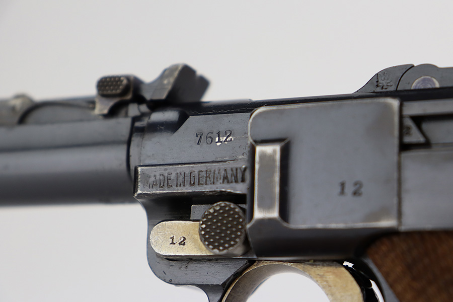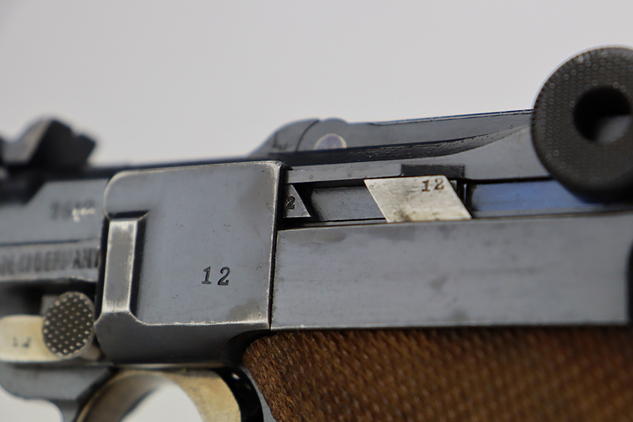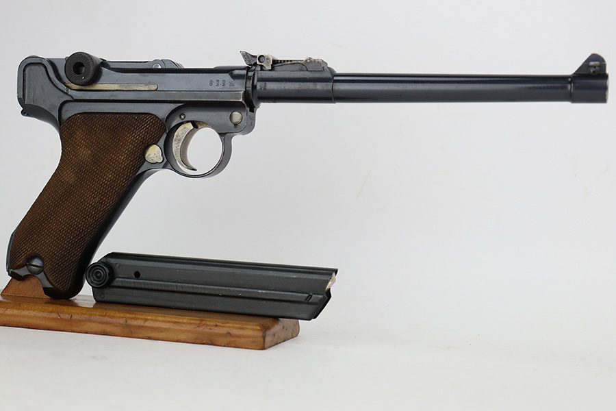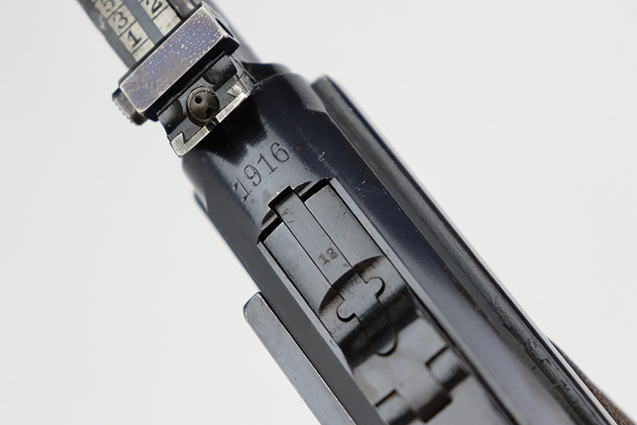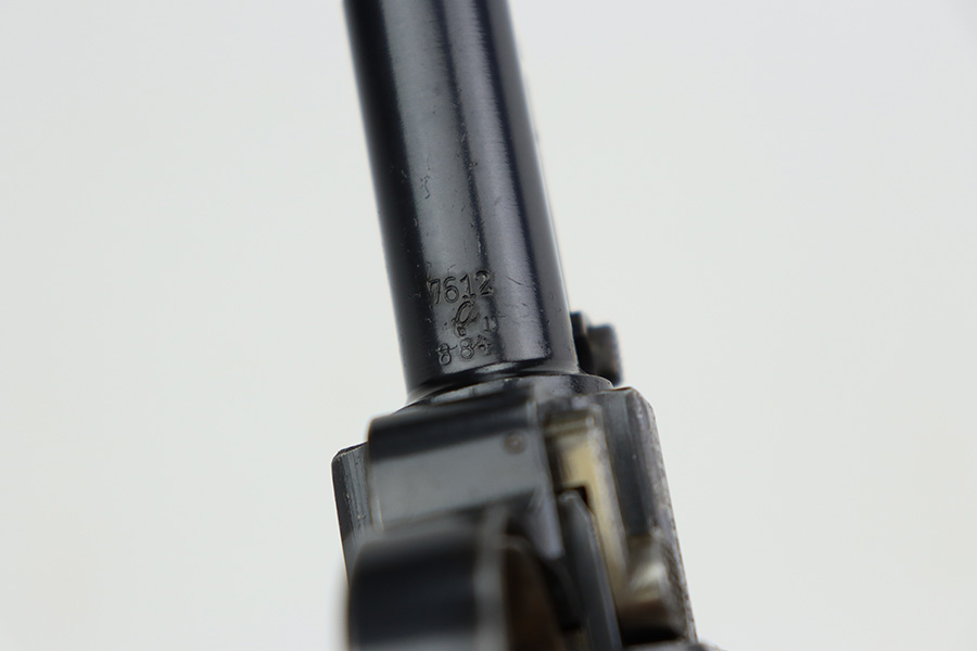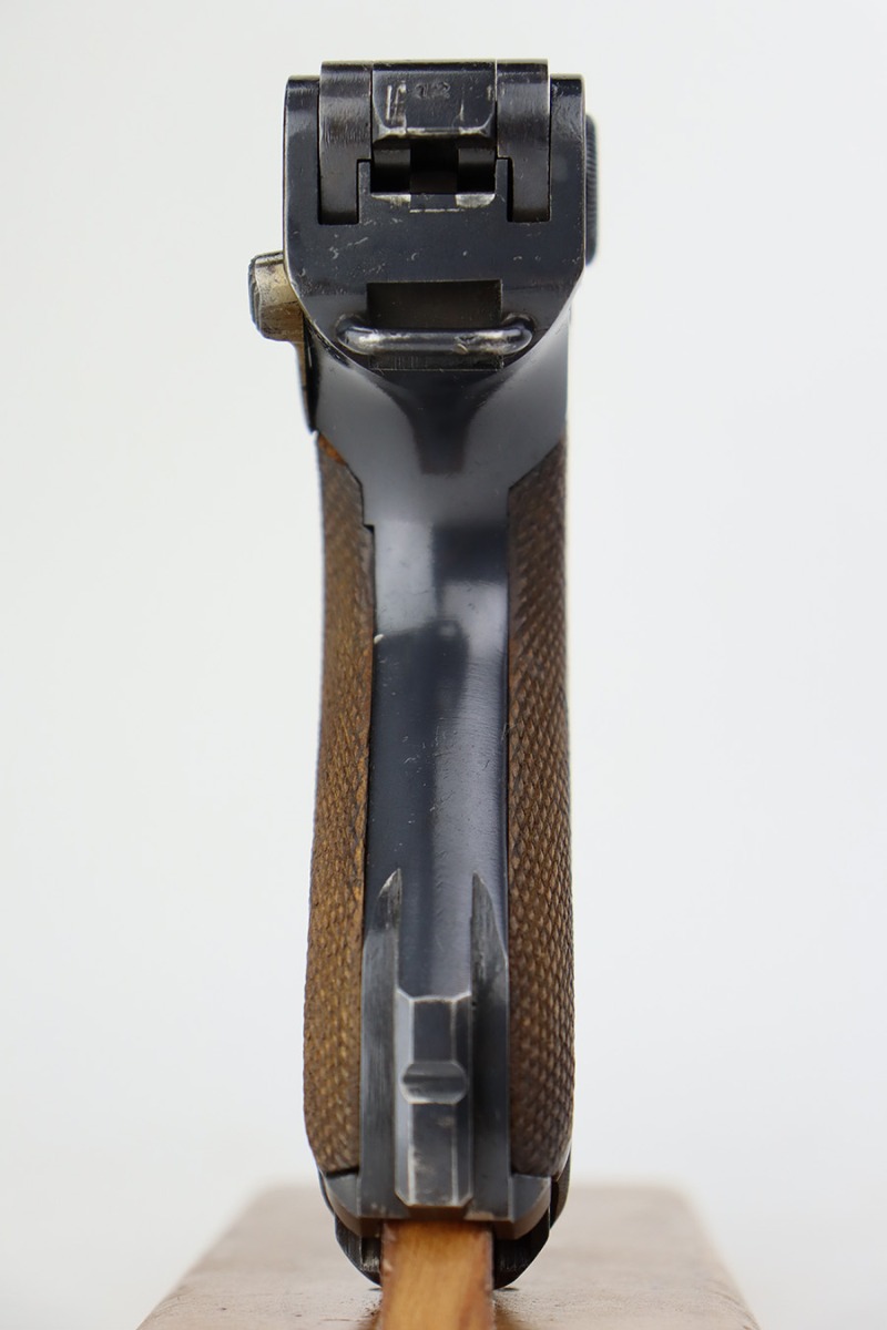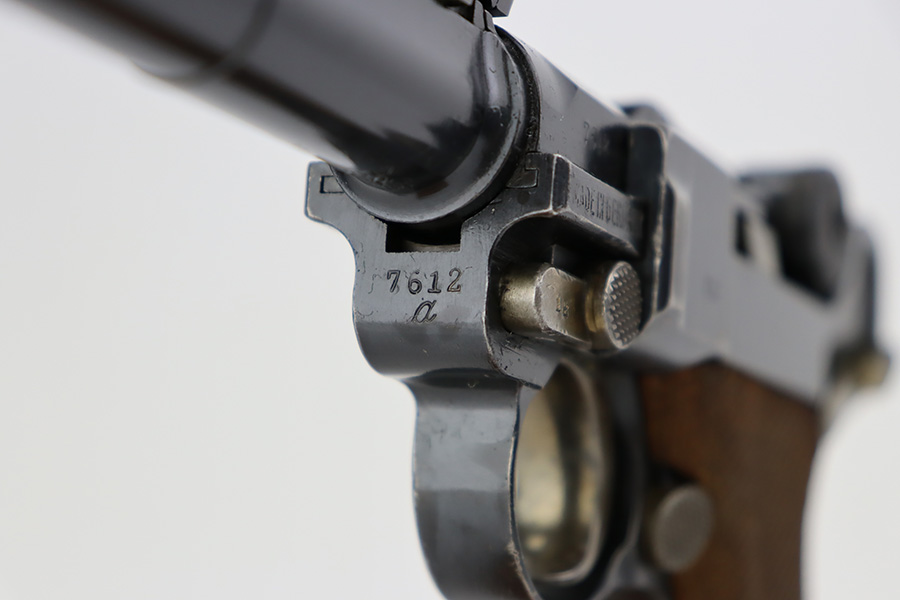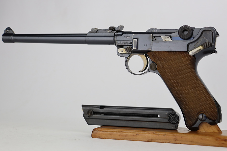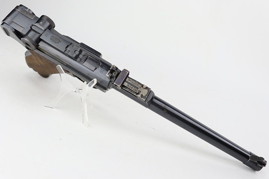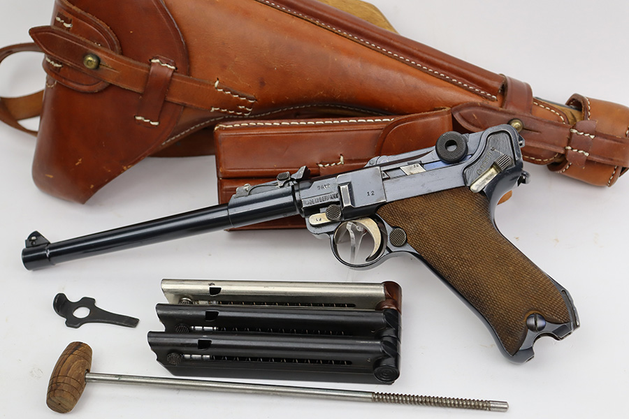 8/2/23 – This is an excellent example of a DWM Artillery Luger issued to the Imperial German military in 1916. All matching with the proper Imperial military acceptance proofs. “Made in Germany” export marking on the left side of the frame. The gun comes with one period-correct blank bottom magazine and with a complete rig of reproduction holster, leather harness, wood stock, shoulder strap, tool, cleaning rod, mag pouches, and two repro magazines. The gun itself has retained about 96-97% of its original finish. Very minor wear around the muzzle, on the side plate, and on some of the high edges. A few tiny handling marks on the front strap. Fitted with excellent matching-numbered wood grips – tiny chip in the corner of the left panel. The bore has good rifling with very minor frosting throughout.