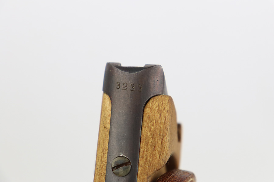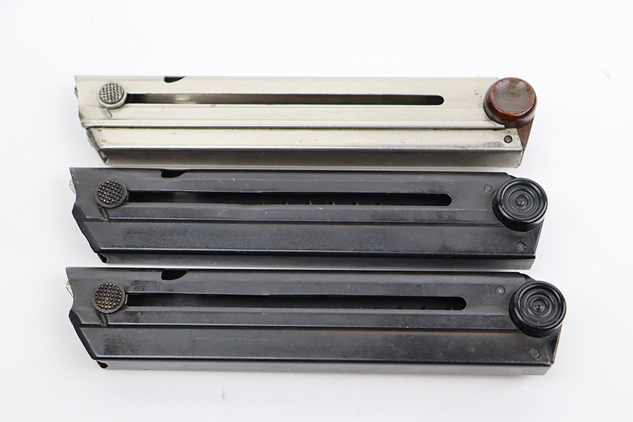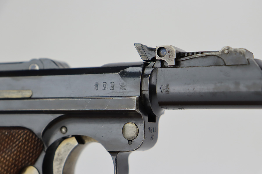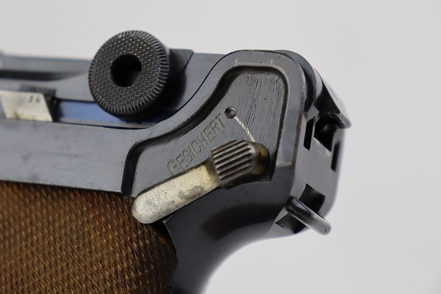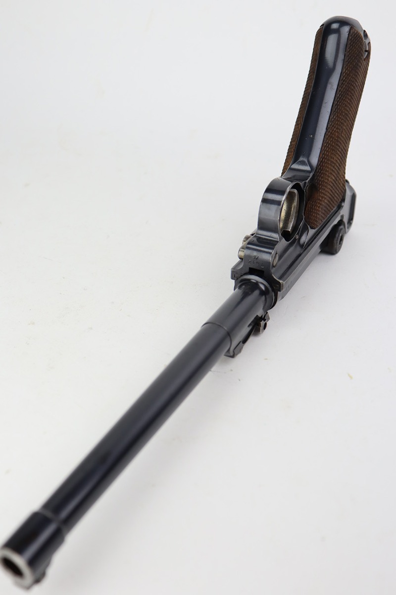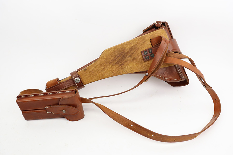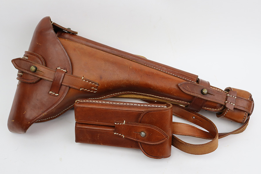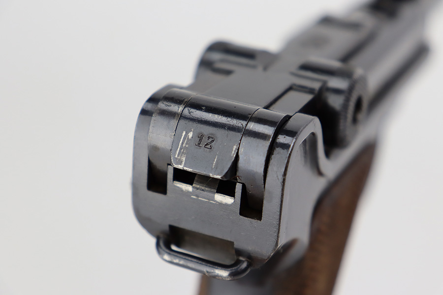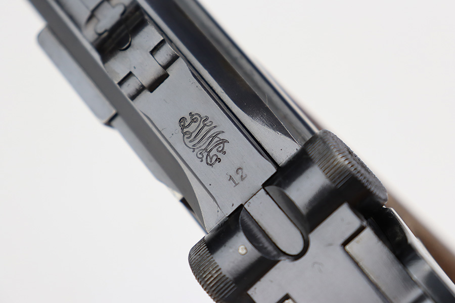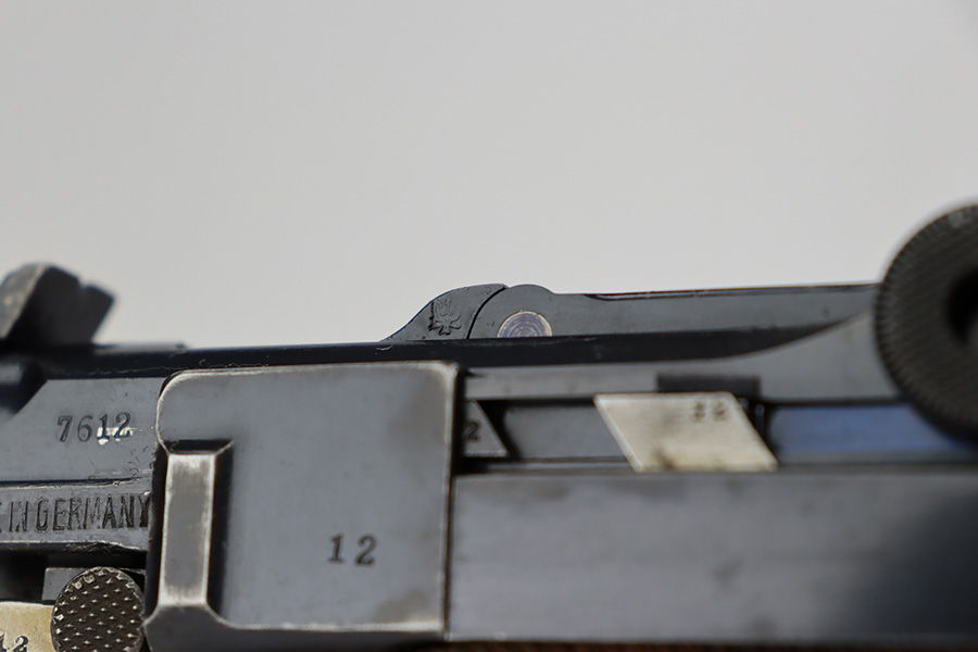 8/2/23 – This is an excellent example of a DWM Artillery Luger issued to the Imperial German military in 1916. All matching with the proper Imperial military acceptance proofs. “Made in Germany” export marking on the left side of the frame. The gun comes with one period-correct blank bottom magazine and with a complete rig of reproduction holster, leather harness, wood stock, shoulder strap, tool, cleaning rod, mag pouches, and two repro magazines. The gun itself has retained about 96-97% of its original finish. Very minor wear around the muzzle, on the side plate, and on some of the high edges. A few tiny handling marks on the front strap. Fitted with excellent matching-numbered wood grips – tiny chip in the corner of the left panel. The bore has good rifling with very minor frosting throughout.