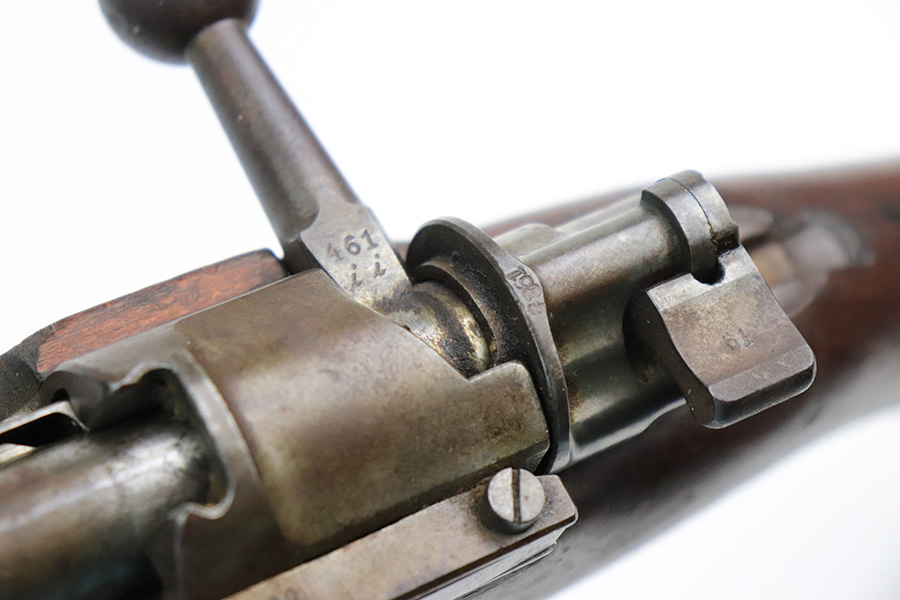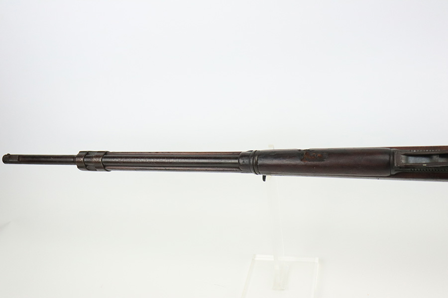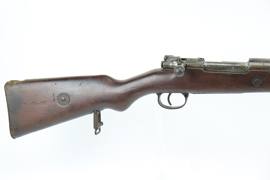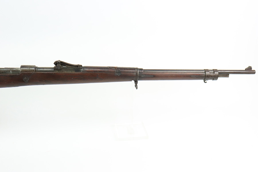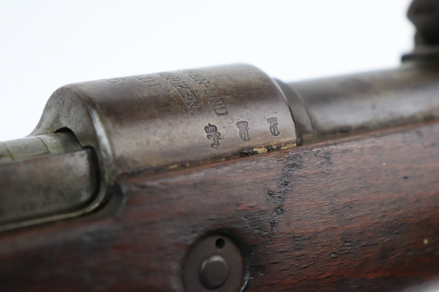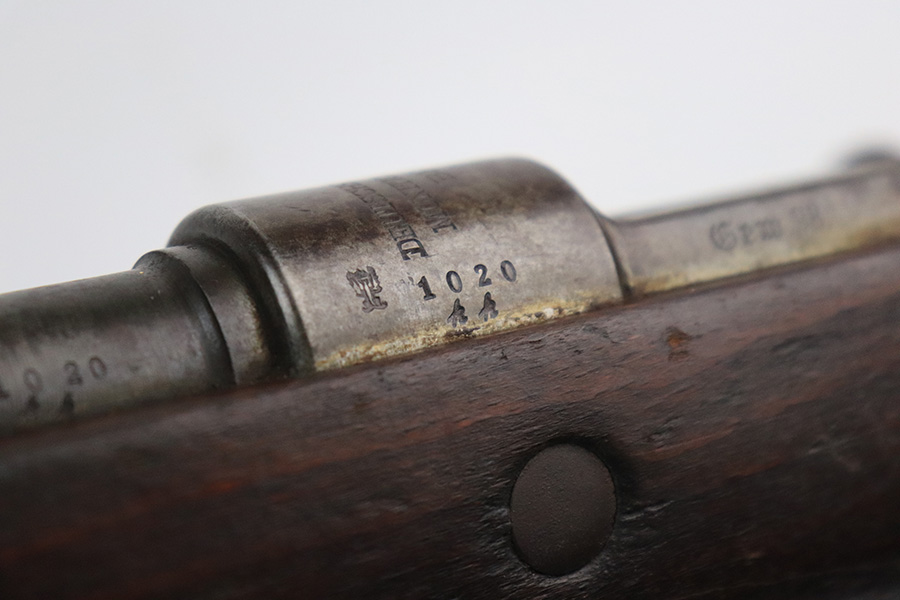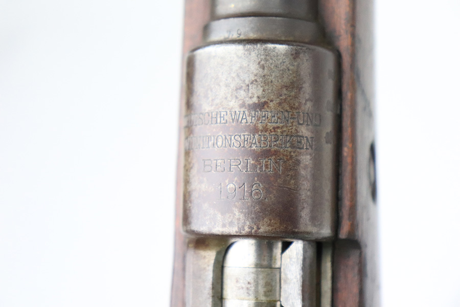 11/30/22 – This is a DWM Gewehr 98 issued to the Imperial German military in 1916. The gun is entirely matching to itself, but the bolt is mismatched. No import marks. Overall, it is in fair condition, but there is noticeable finish loss on the receiver and heavy brown patina and spotty oxidation covering all of the metal parts. Heavy pitting on the butt plate. There are fairly large gouges in the wood on the top edge of the butt stock and upper handguard. The bore has heavy oxidation and pitting throughout.