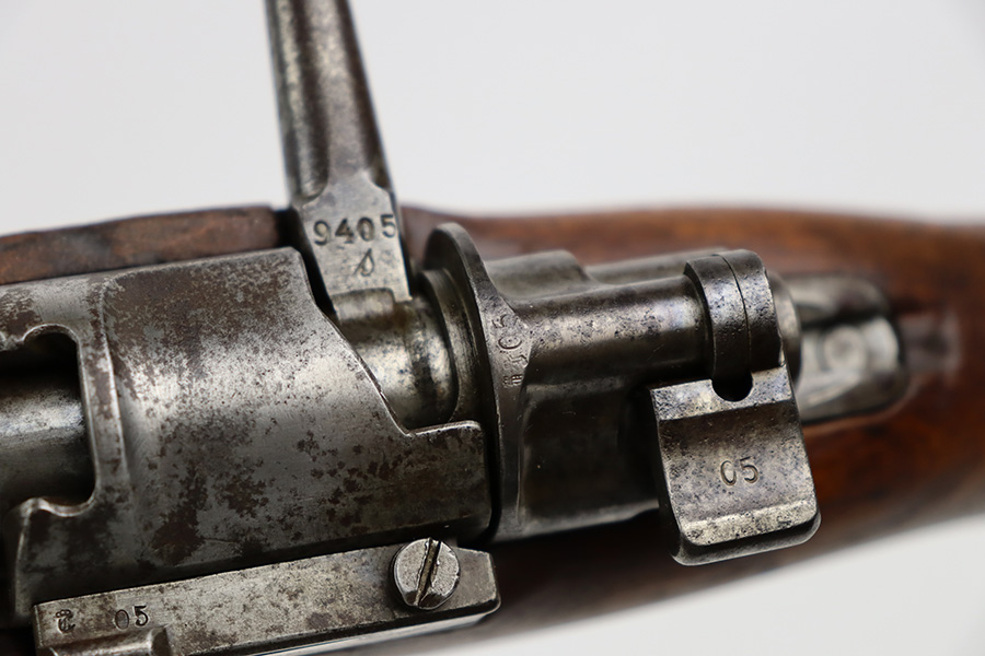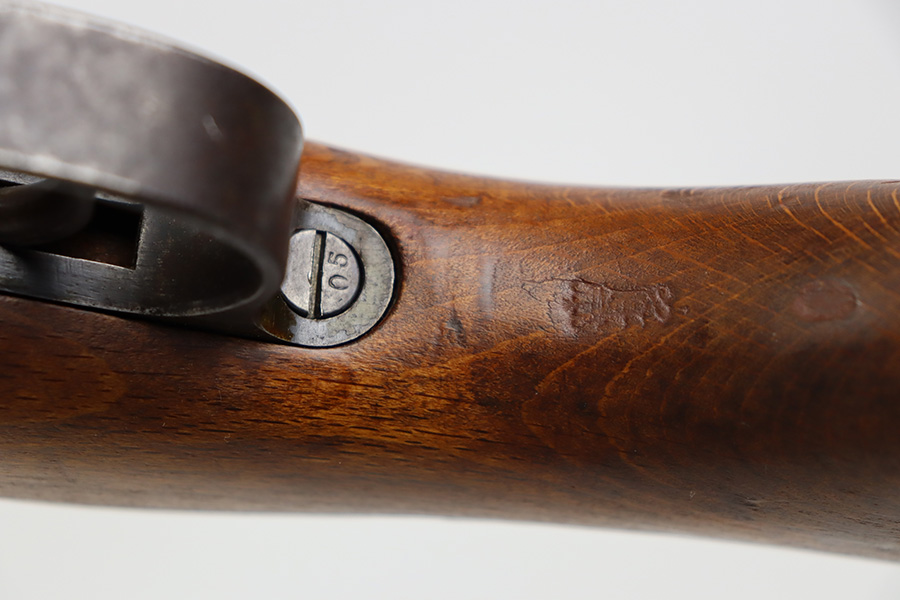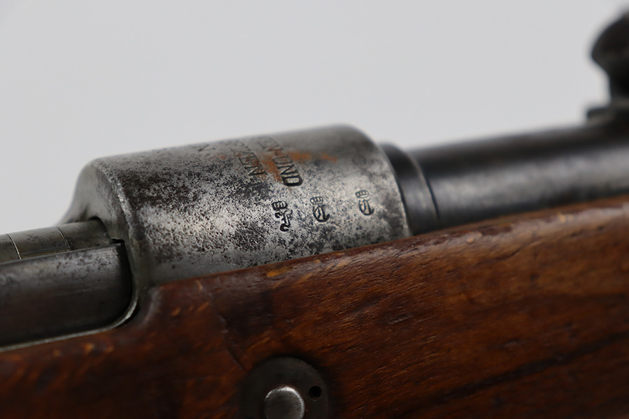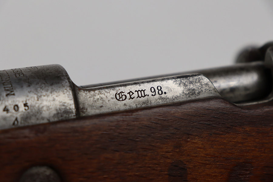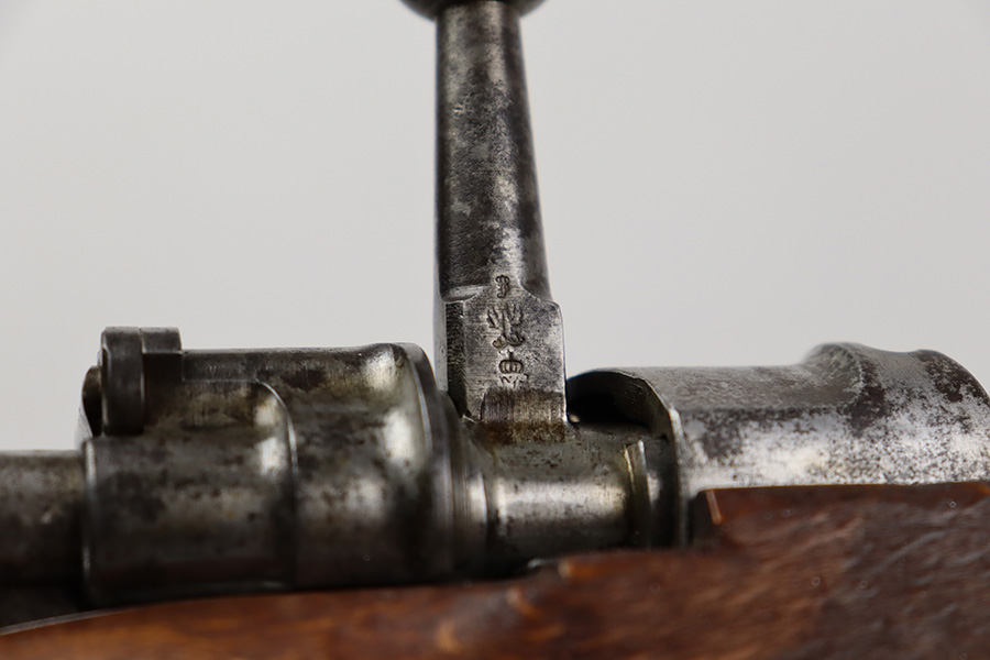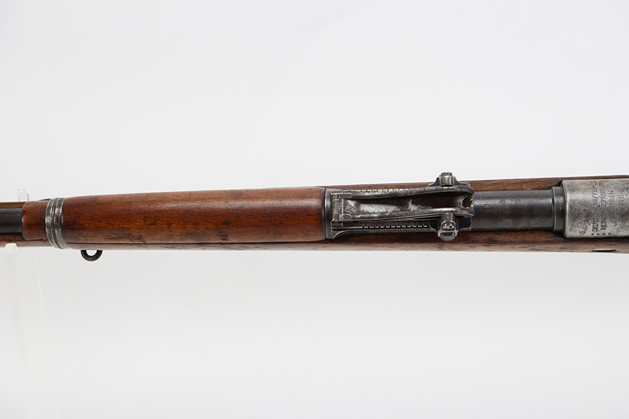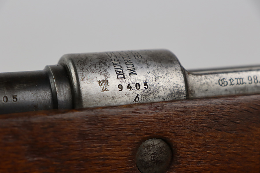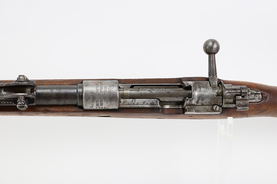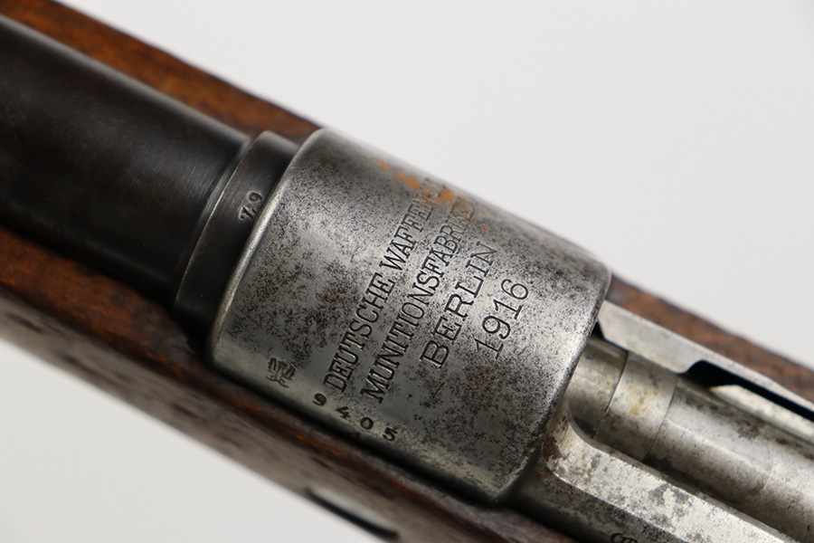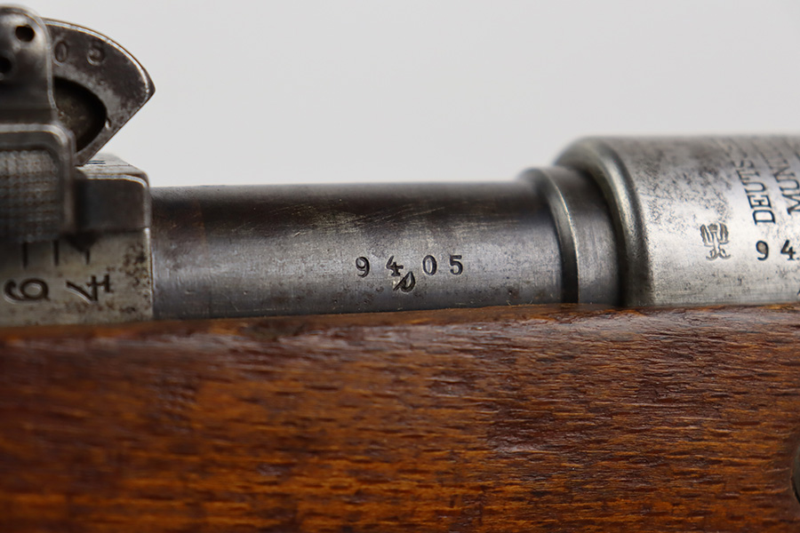 7/25/23 – This is a nice example of a DWM Gewehr 98 rifle issued to the Imperial German military in 1916. The gun is almost entirely matching, but the sliding portion of the rear sight is mismatched. The stock is numbered and matching. The metal parts have lost virtually all of their original finish with noticeable spotty oxidation throughout and some areas of tiny pitting here and there, most noticeable on the receiver. The stock has no major damage, but shows the typical signs of wear. It appears to have been very lightly sanded. The bore has good rifling with minor frosting throughout.