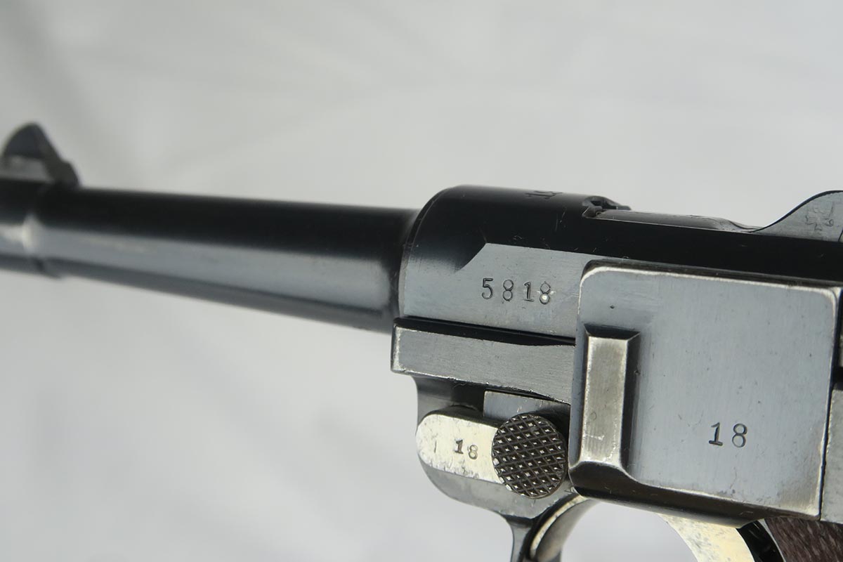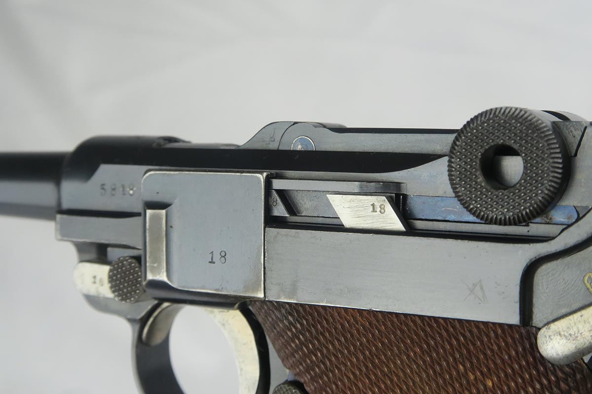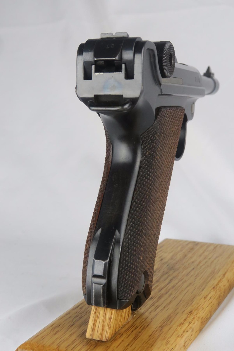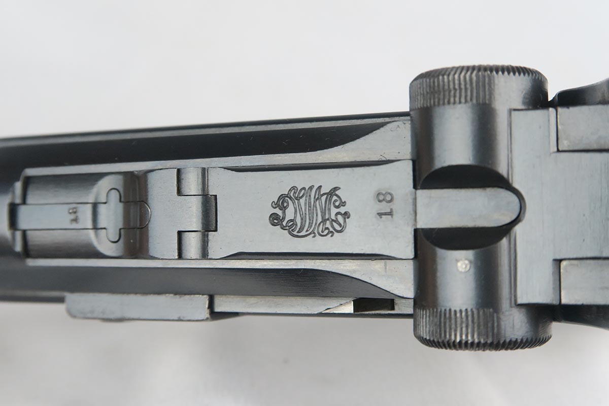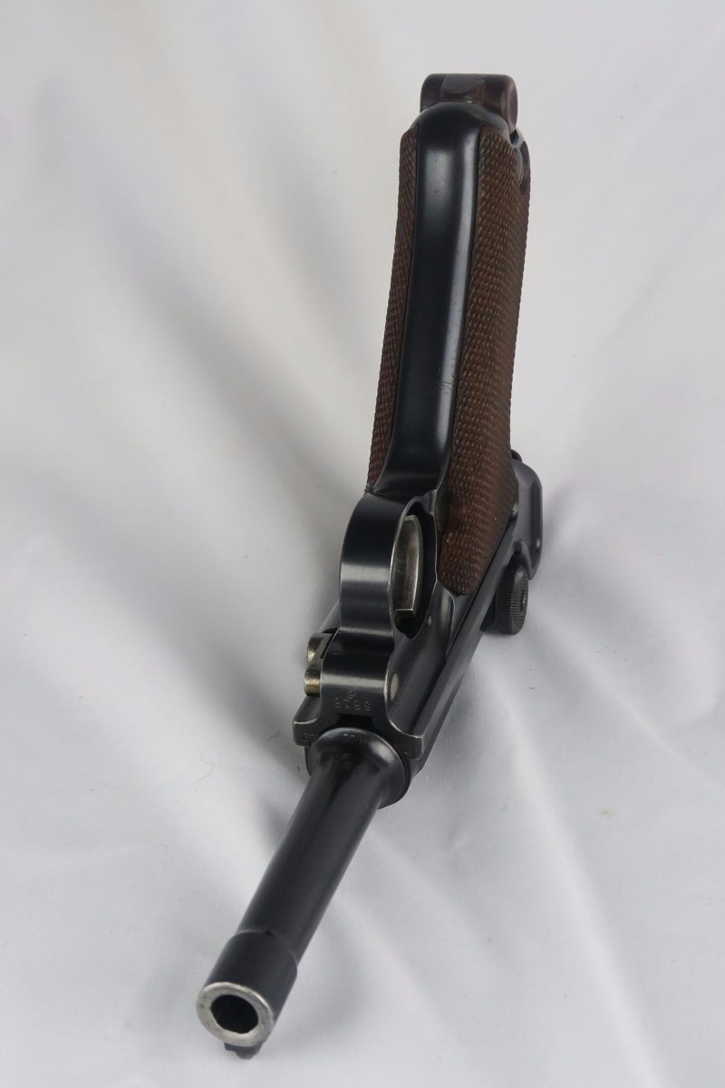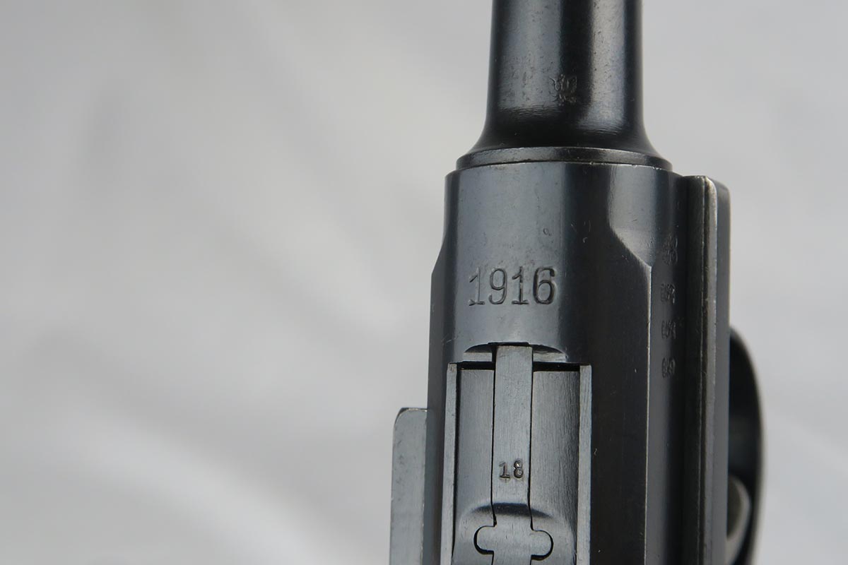 10/9/17 – This is a very nice and original DWM luger, made in 1916. The bluing rates at about 96-97% with finish loss on the sideplate and the bottom of the front strap. The pistol is all matching, including the grips but not the magazine. The magazine is period correct and blank on its wood bottom. Mint bore.