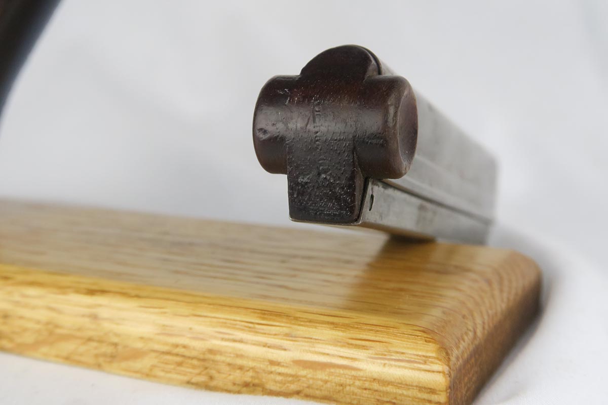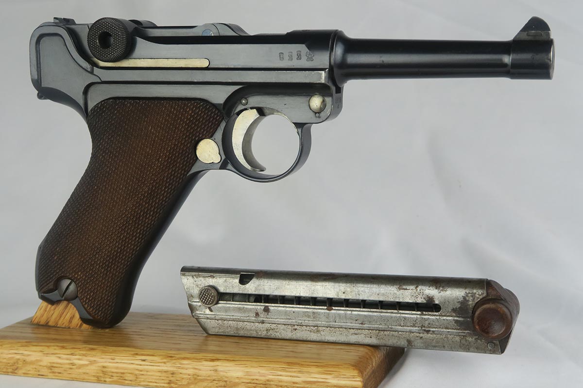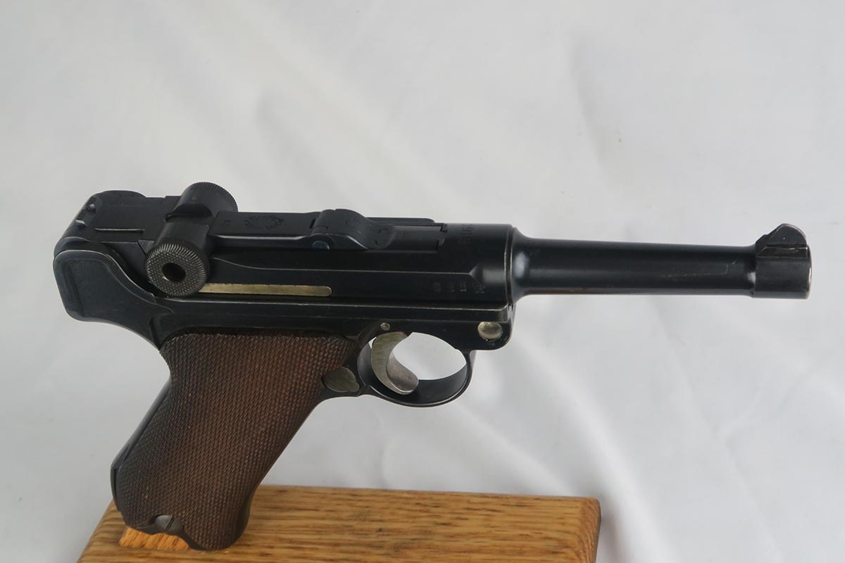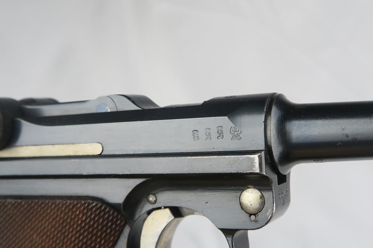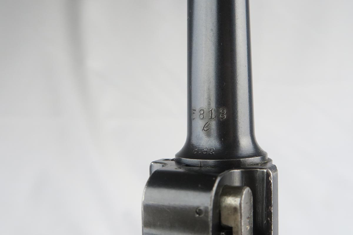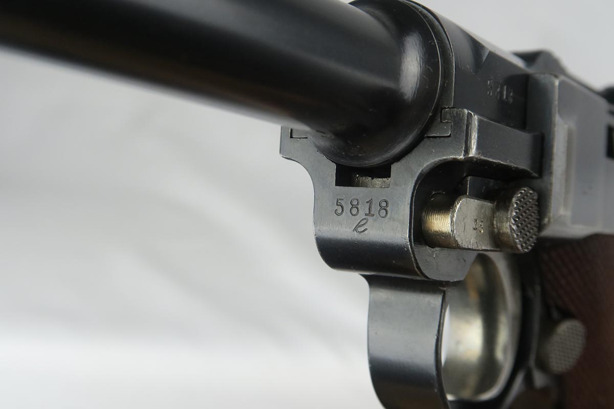 10/9/17 – This is a very nice and original DWM luger, made in 1916. The bluing rates at about 96-97% with finish loss on the sideplate and the bottom of the front strap. The pistol is all matching, including the grips but not the magazine. The magazine is period correct and blank on its wood bottom. Mint bore.
