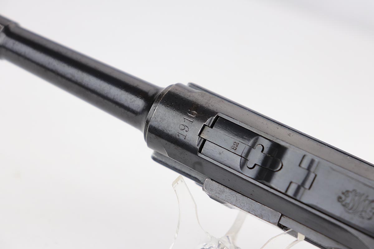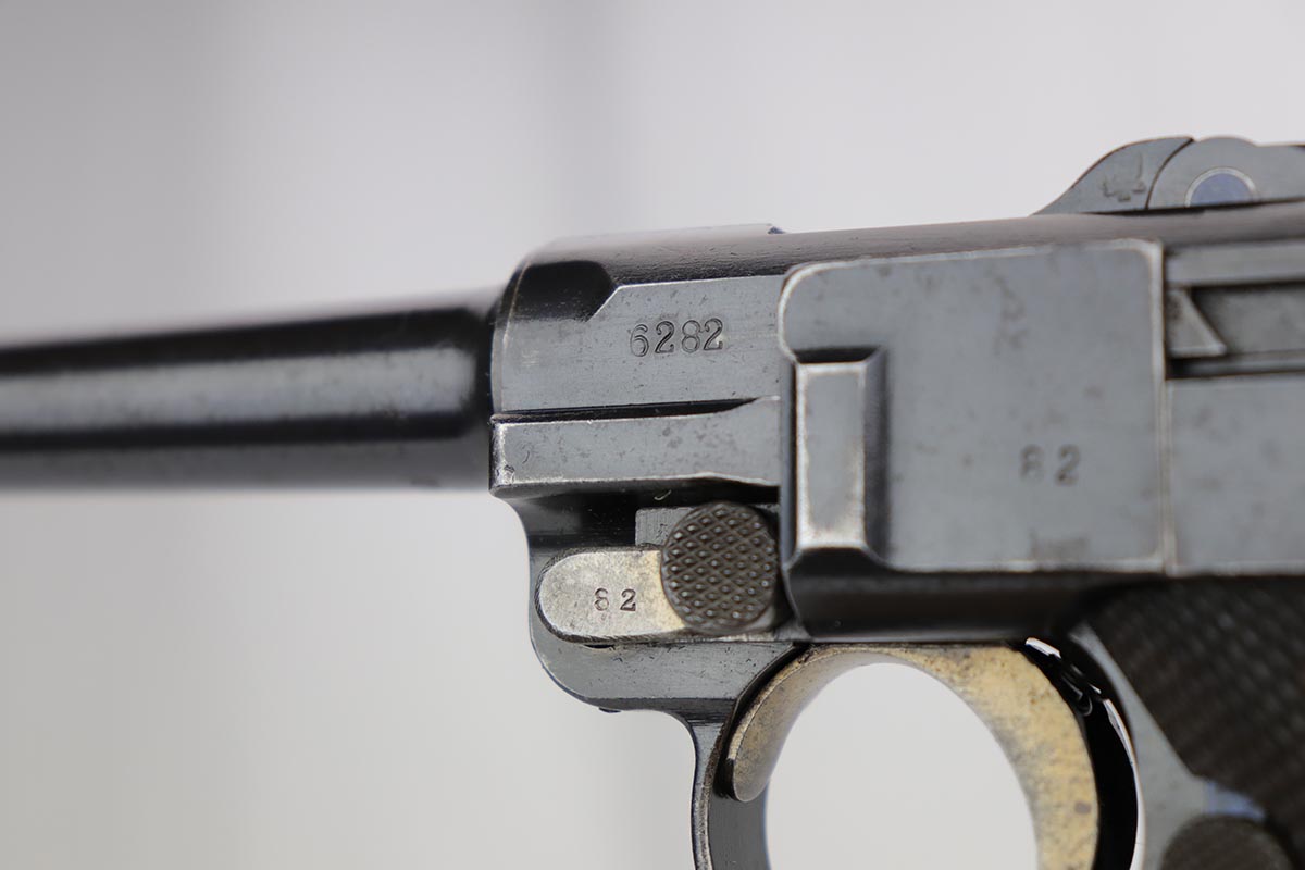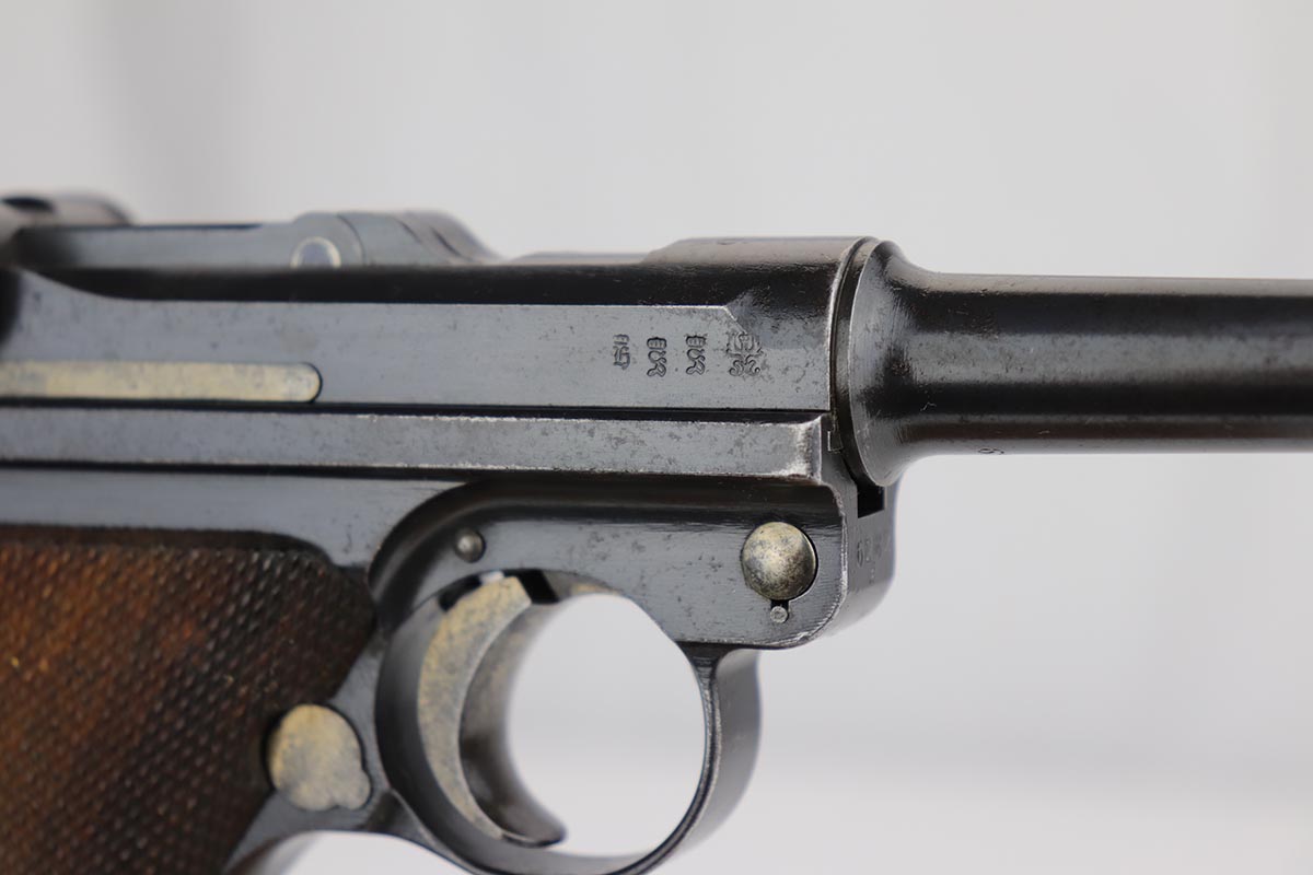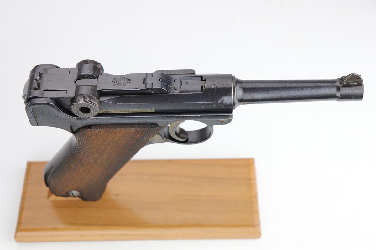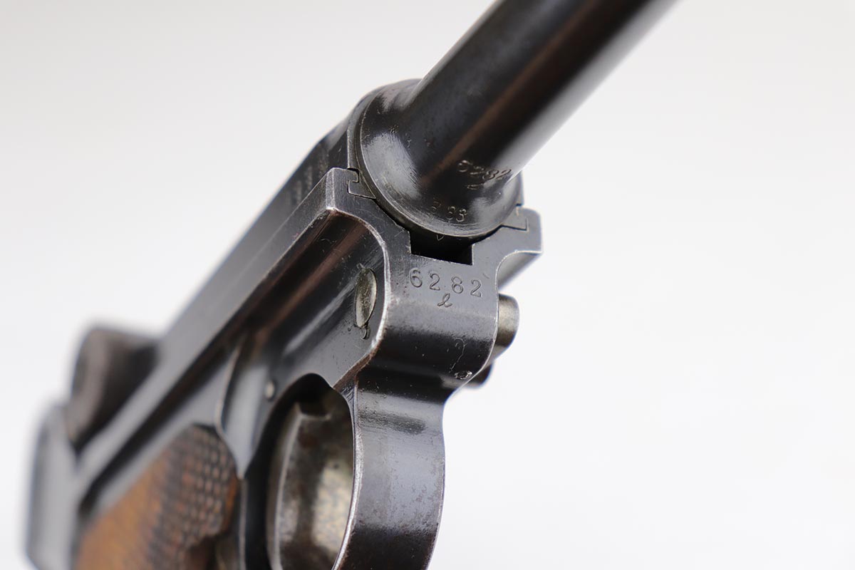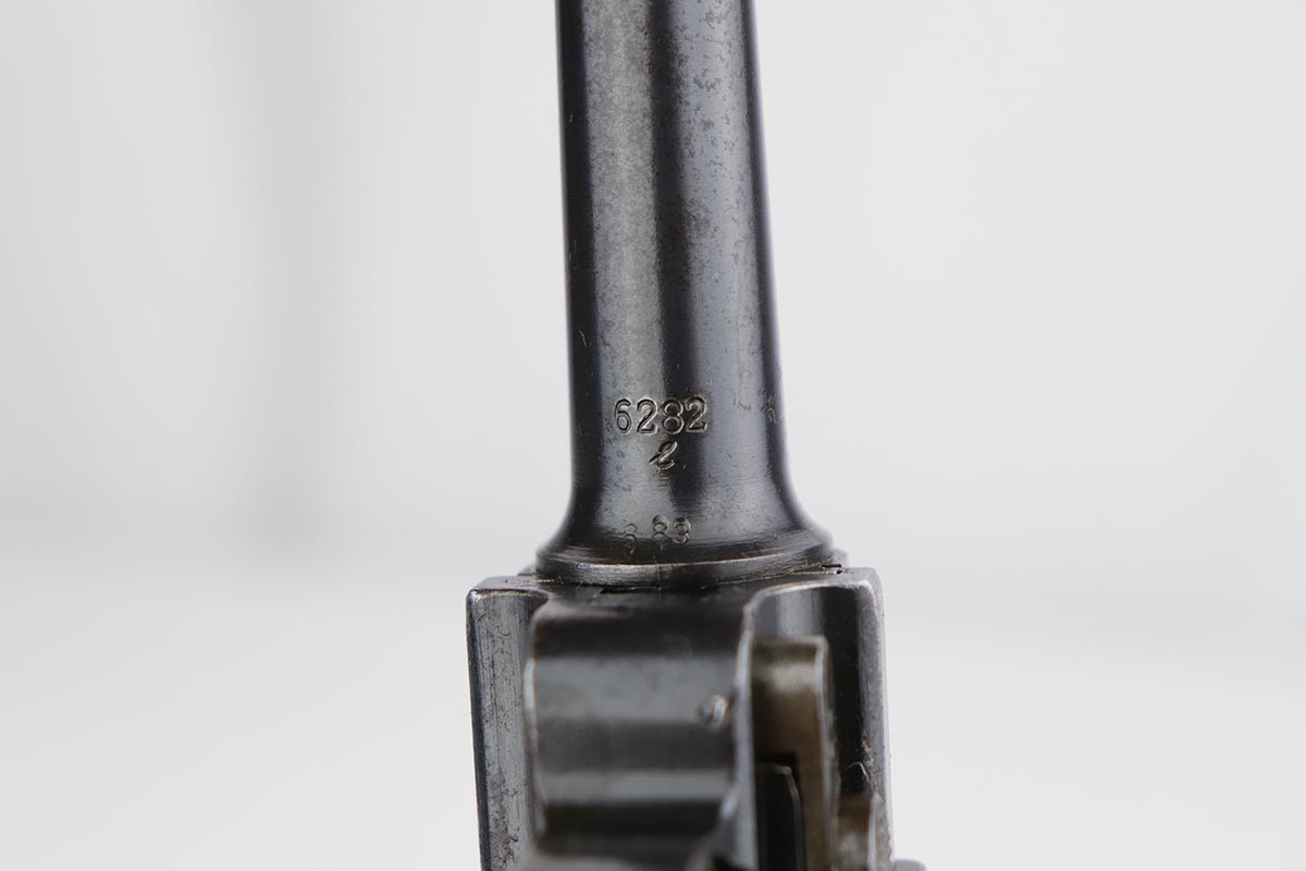 11/27/19 – This is an all matching and original DWM Luger from 1916. The finish is original but a little tough to rate, as there isn’t much actual bluing loss, but browning and oxidation in most areas. Small parts have about 40-50% of the original straw. The original matching grips are present, and the left panel has the common, minor chip under the safety. Magazine is an original military example but mismatched to the gun. Bore shows a good amount of use, with frost and freckling throughout, and some smoothing of the grooves.