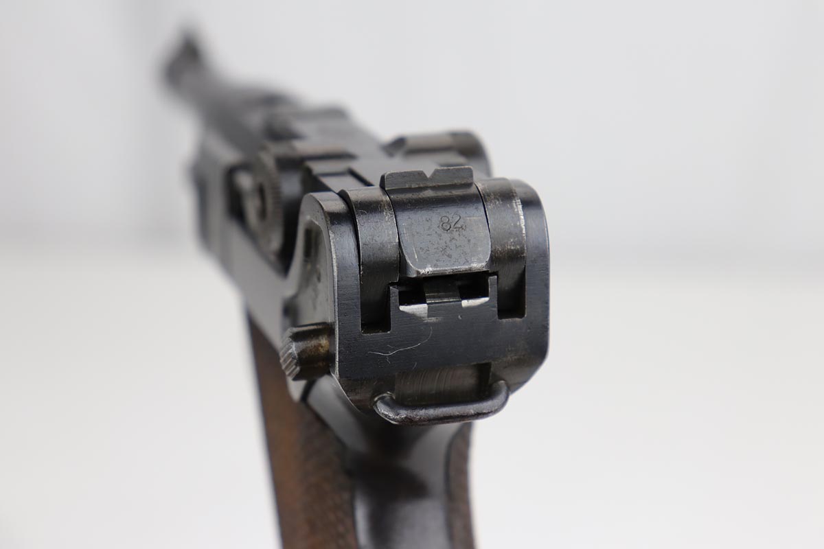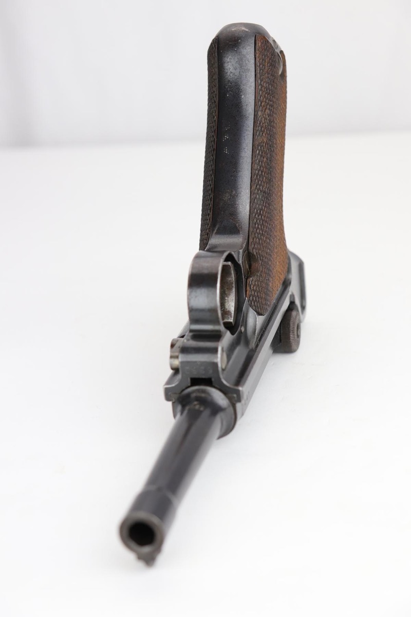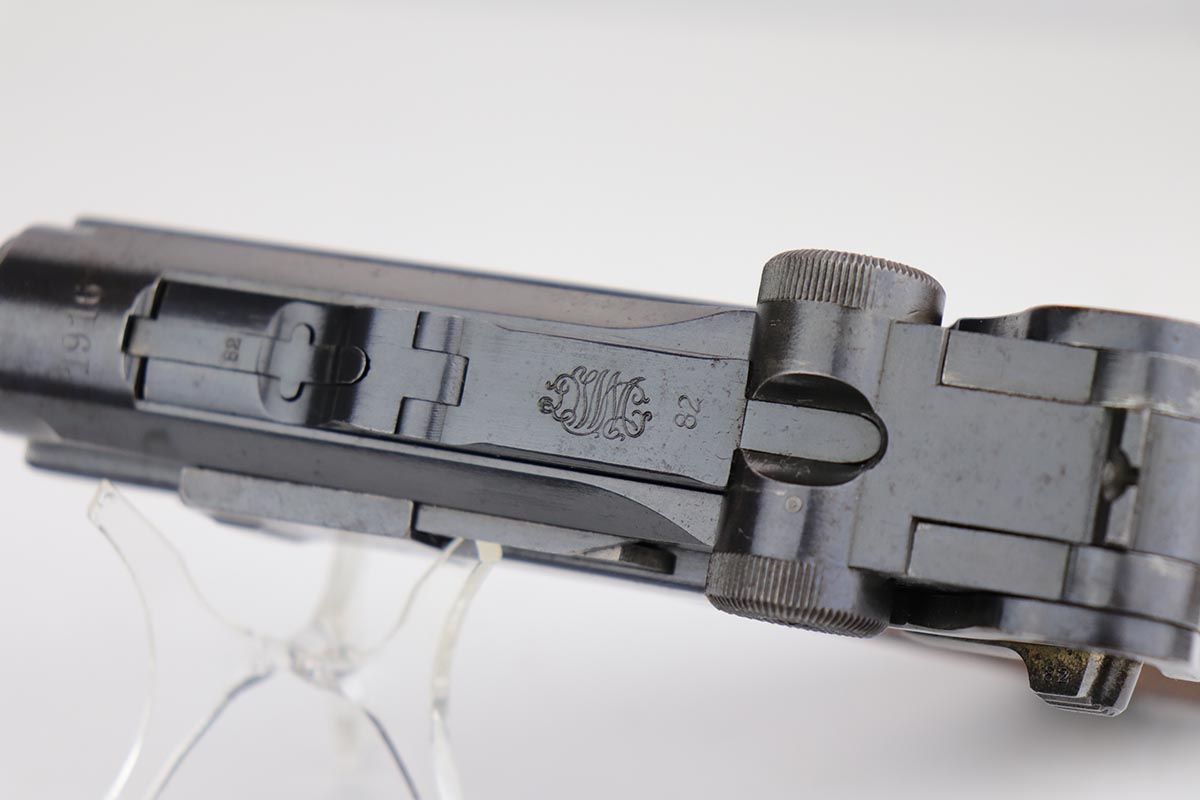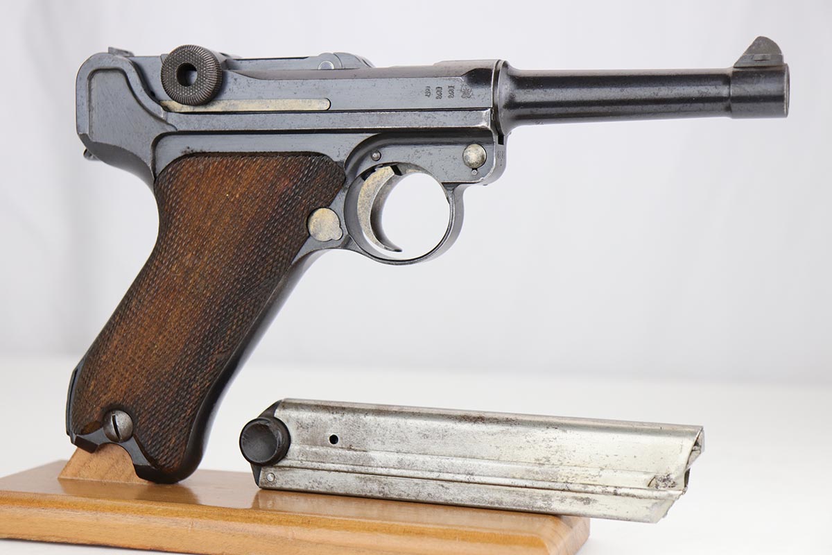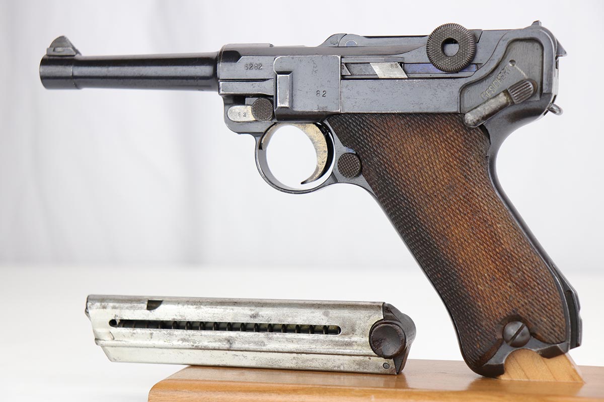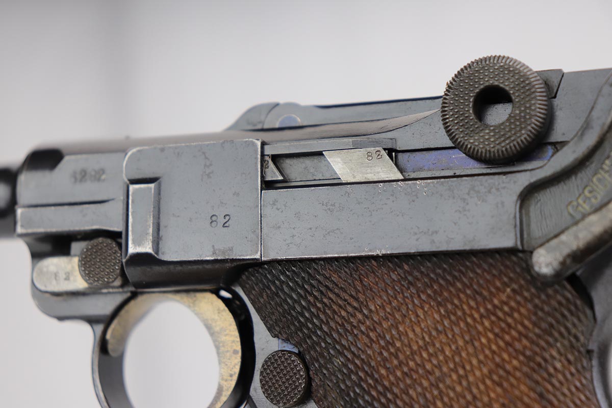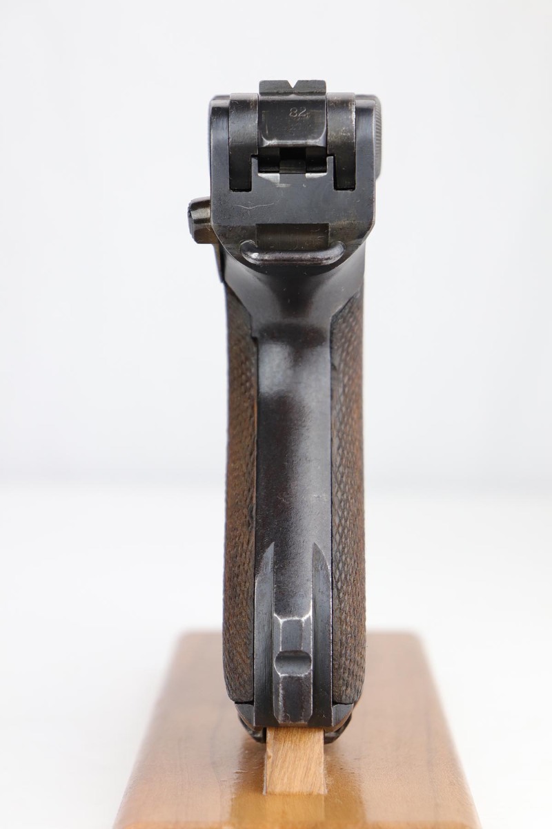 11/27/19 – This is an all matching and original DWM Luger from 1916. The finish is original but a little tough to rate, as there isn’t much actual bluing loss, but browning and oxidation in most areas. Small parts have about 40-50% of the original straw. The original matching grips are present, and the left panel has the common, minor chip under the safety. Magazine is an original military example but mismatched to the gun. Bore shows a good amount of use, with frost and freckling throughout, and some smoothing of the grooves.